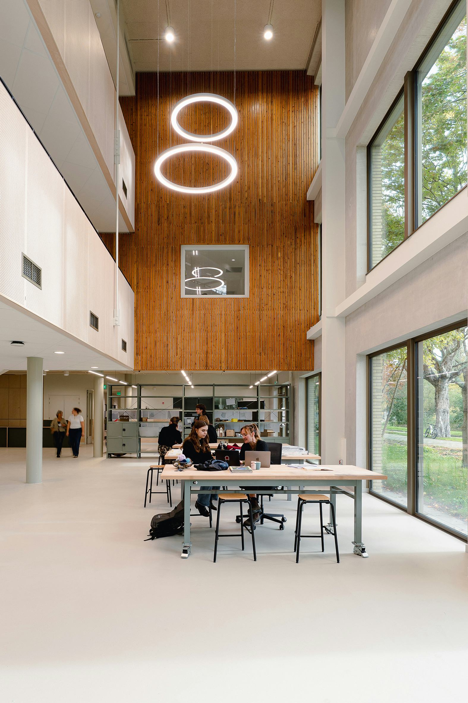 De ISD wilde een school die meer is dan een verzameling klaslokalen: een stimulerende omgeving die past bij het internationale karakter van de gemeenschap en aansluit bij de ideeën van Rosan Bosch over open leerlandschappen. Atelier PRO vertaalde dit in een flexibel onderwijsgebouw met een mix van instructieruimtes, informele studieplekken en plekken voor ontmoeting en experiment. Leren kan in de lokalen, in de gangen, buiten op het podium of centraal in het hart van het gebouw.