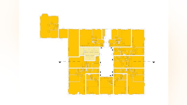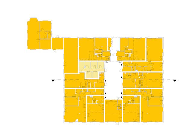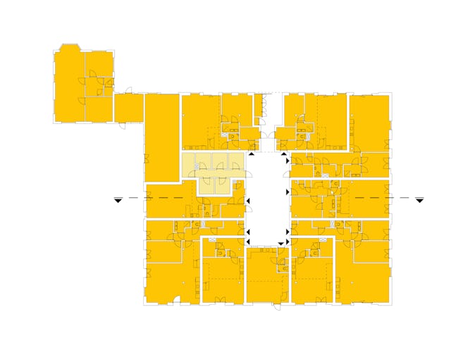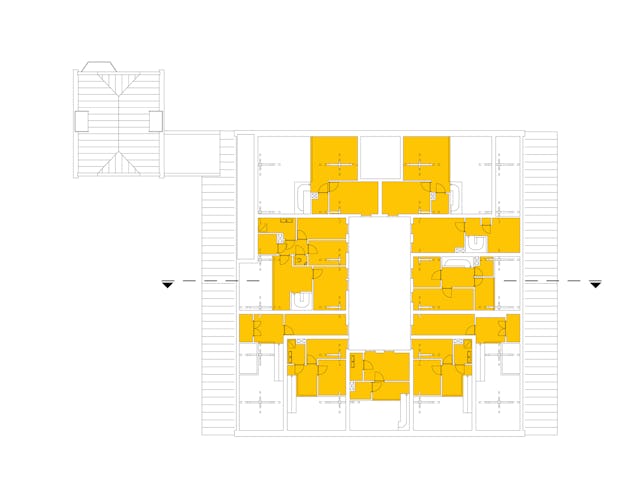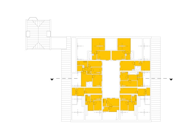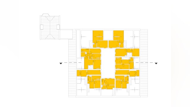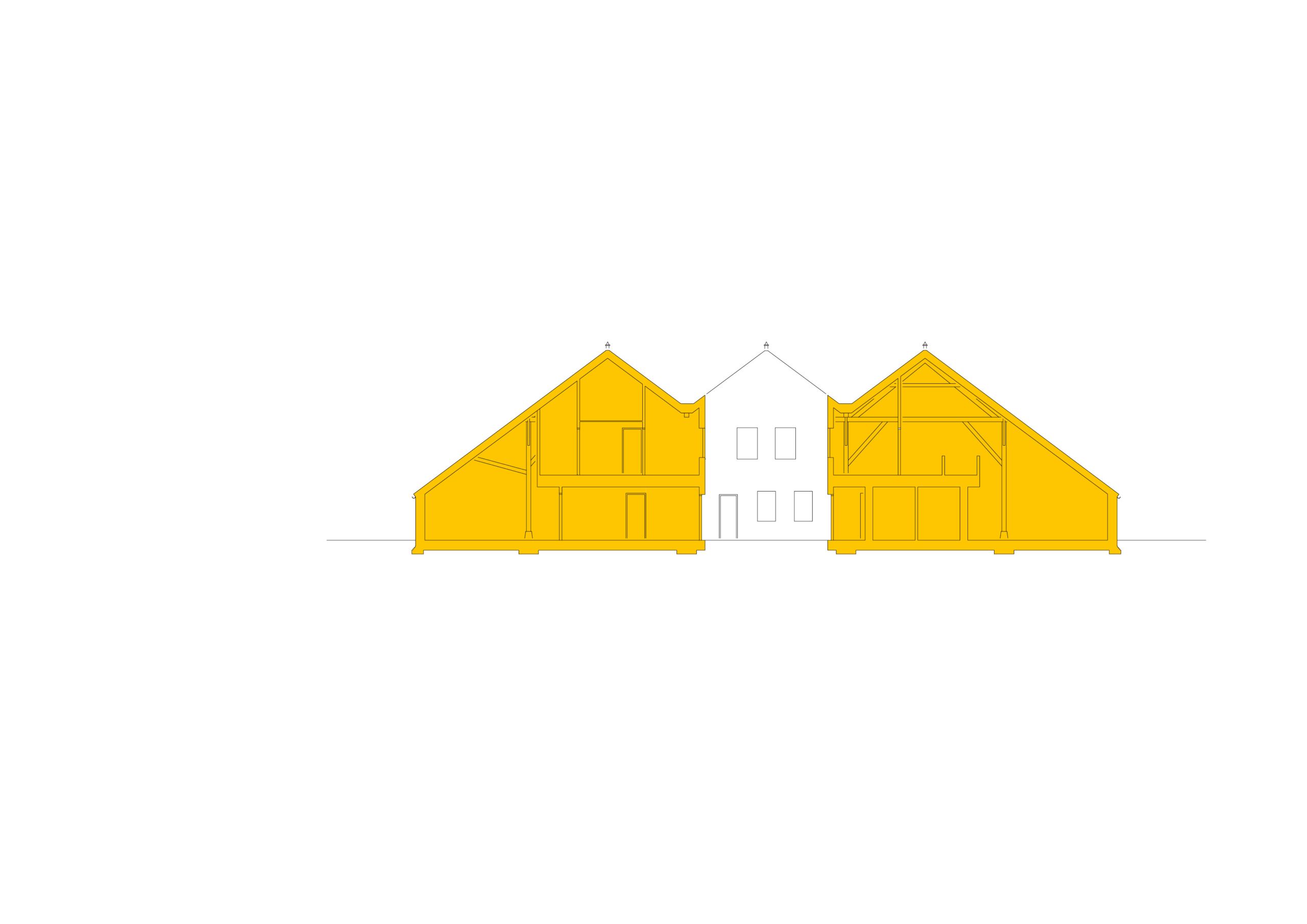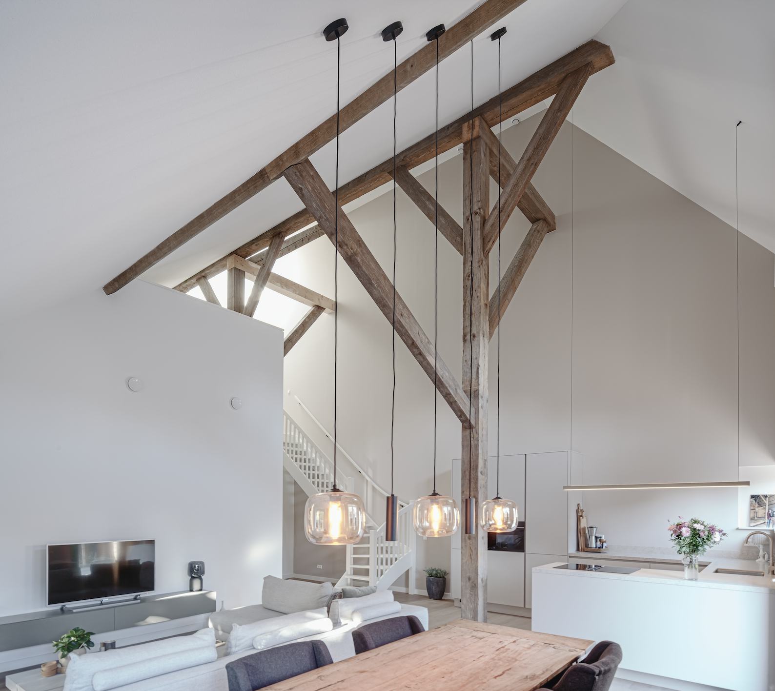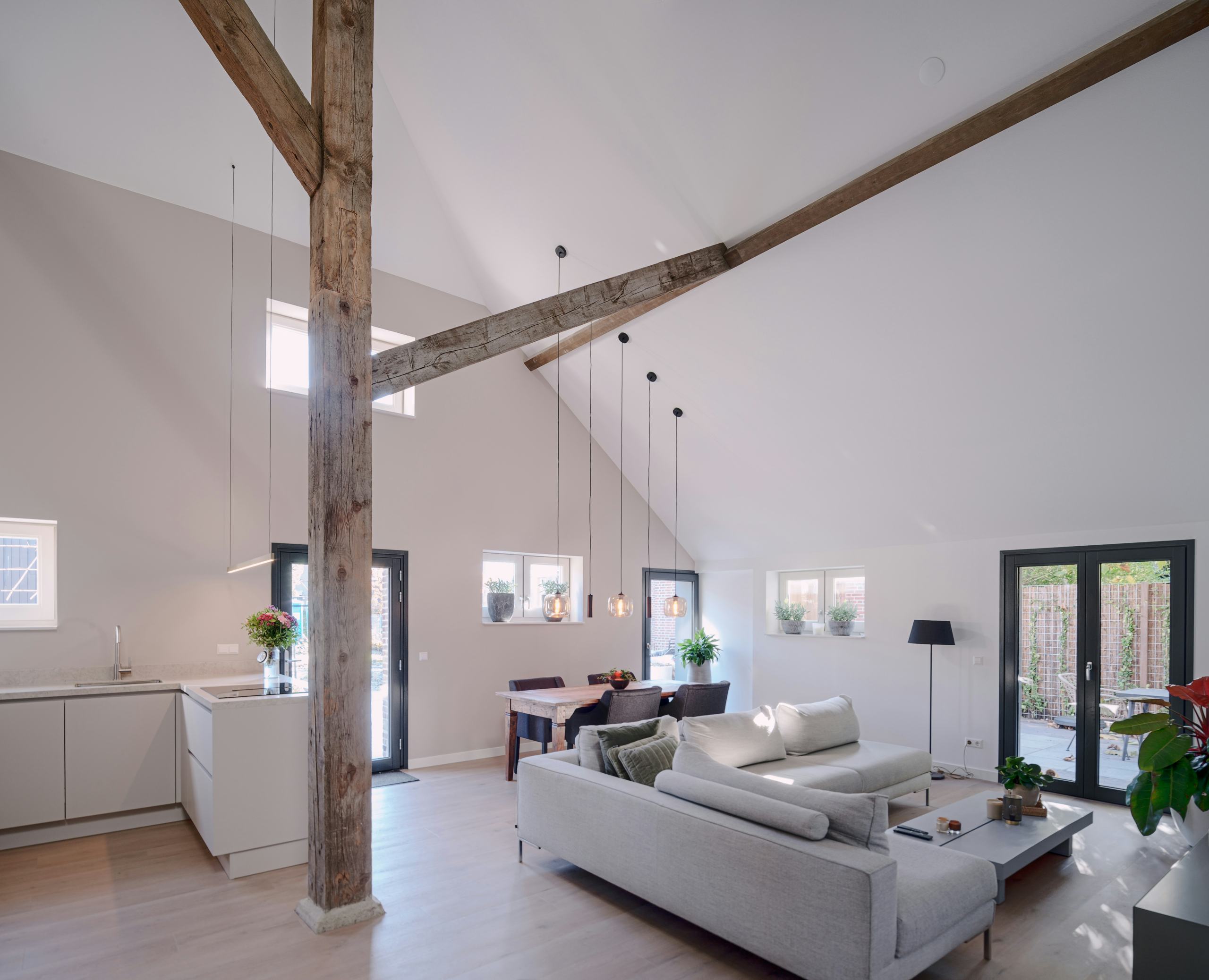 Bij de verbouwing bleef het uiterlijk van de monumentale schuur leidend. Binnen is een patio van 6 bij 13 meter aangebracht door een deel van de middelste kap te openen. Rondom deze ruimte liggen de voordeuren en bergingen van de tien woningen. De grote schuifdeur in de voorgevel is in open stand vastgezet; andere deuren zijn vervangen door glas, waarbij de groene kleur van de originele deuren is behouden. Zo blijft het beeld van de oude schuur intact.