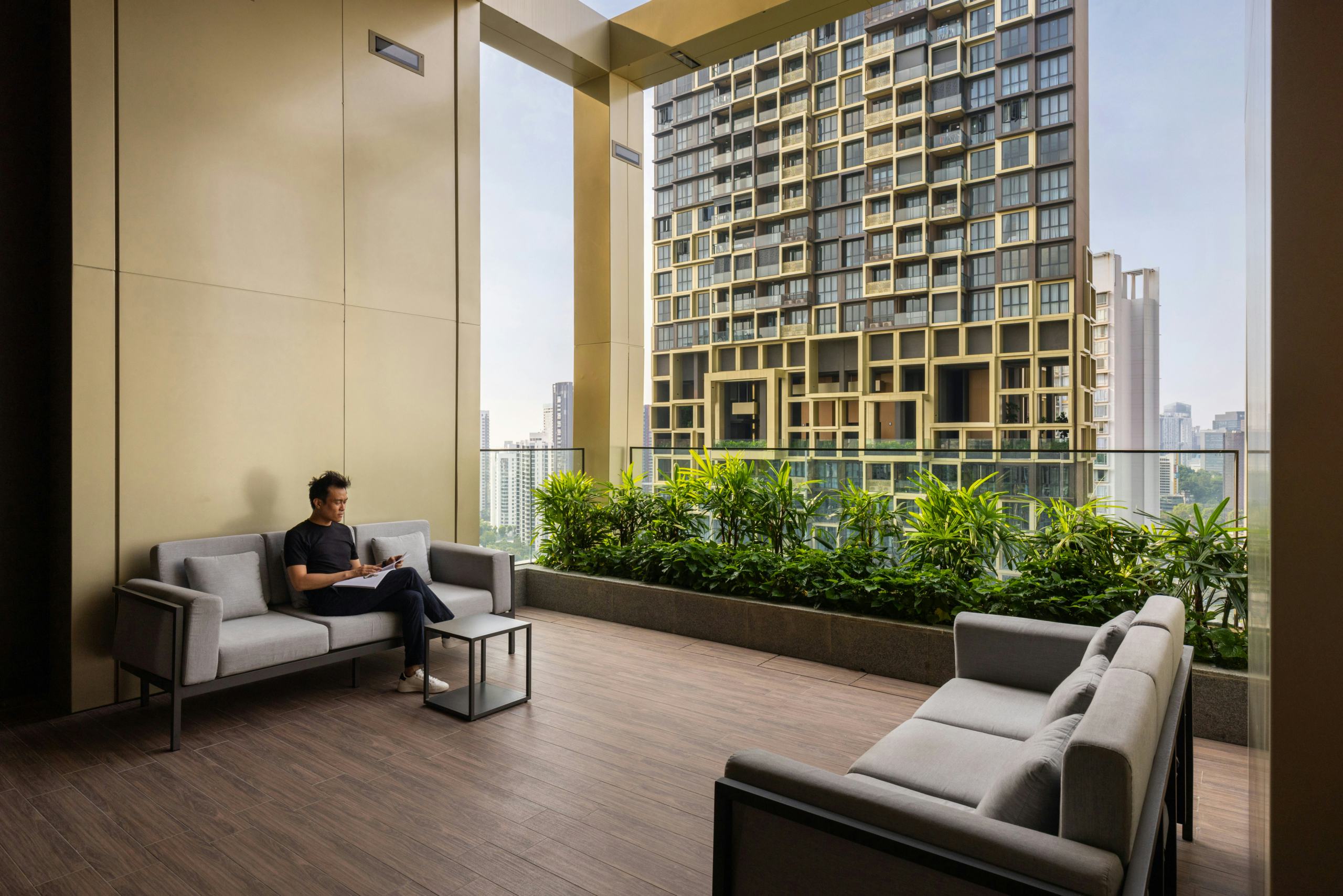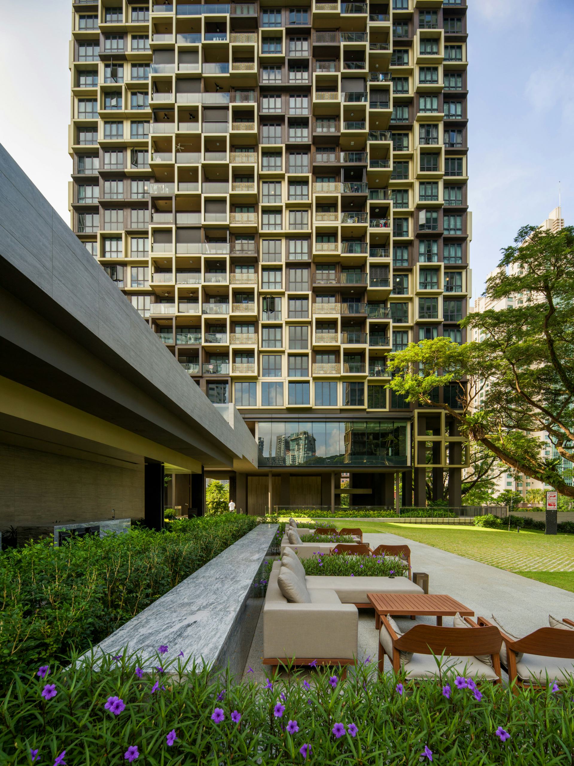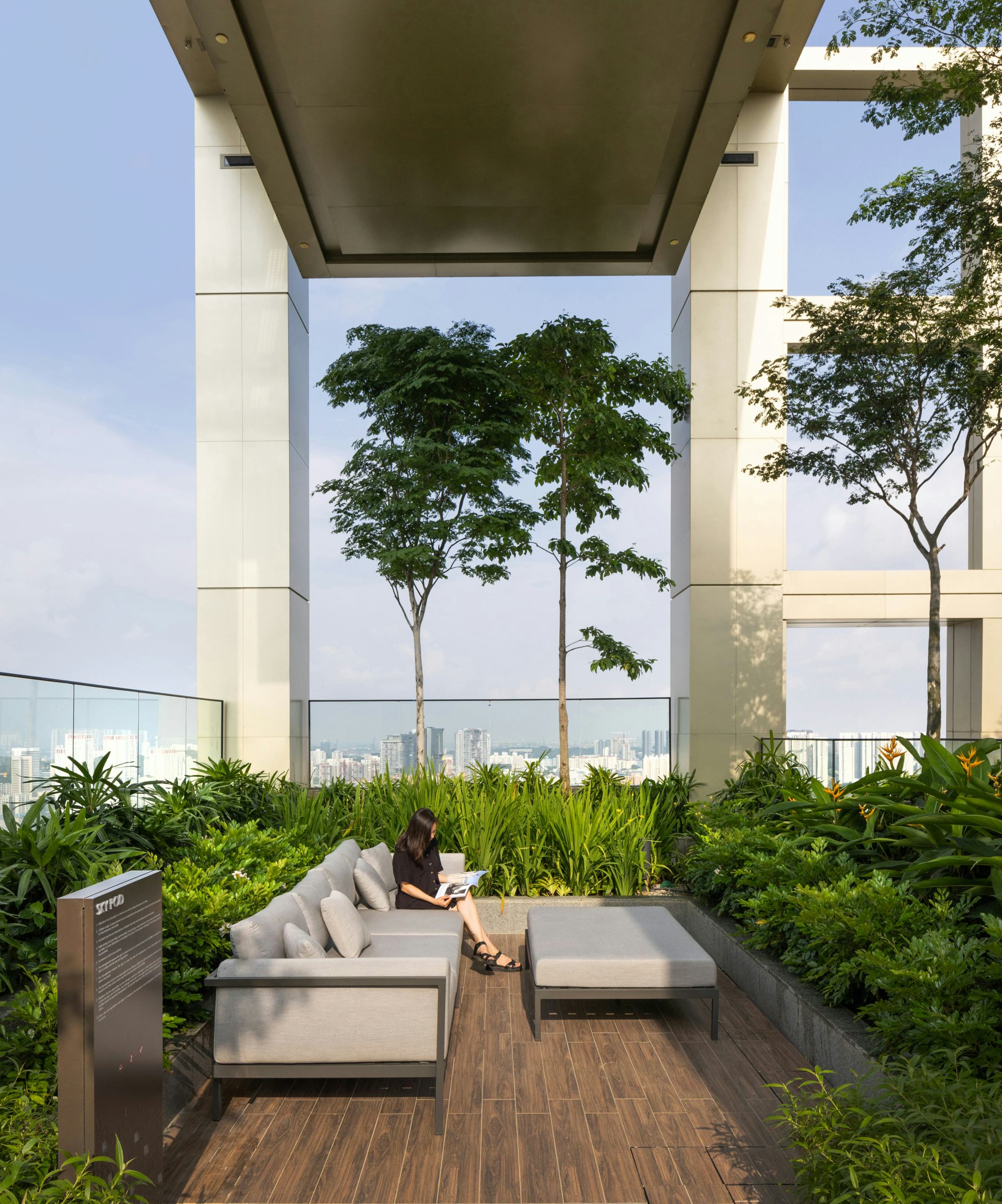 De gevel legt de nadruk op de gemeenschappelijke ruimtes van de torens. Op de 24ste verdieping bevindt zich een vier verdiepingen hoge skygarden, terwijl het dak is ingericht als collectief terras. Op deze plekken wordt het pixelpatroon opener, met dubbele en driedubbele frames rond de beplanting. De groene zones sluiten aan bij het stadsbeeld van Singapore, waar vegetatie een vaste rol speelt in woonprojecten.