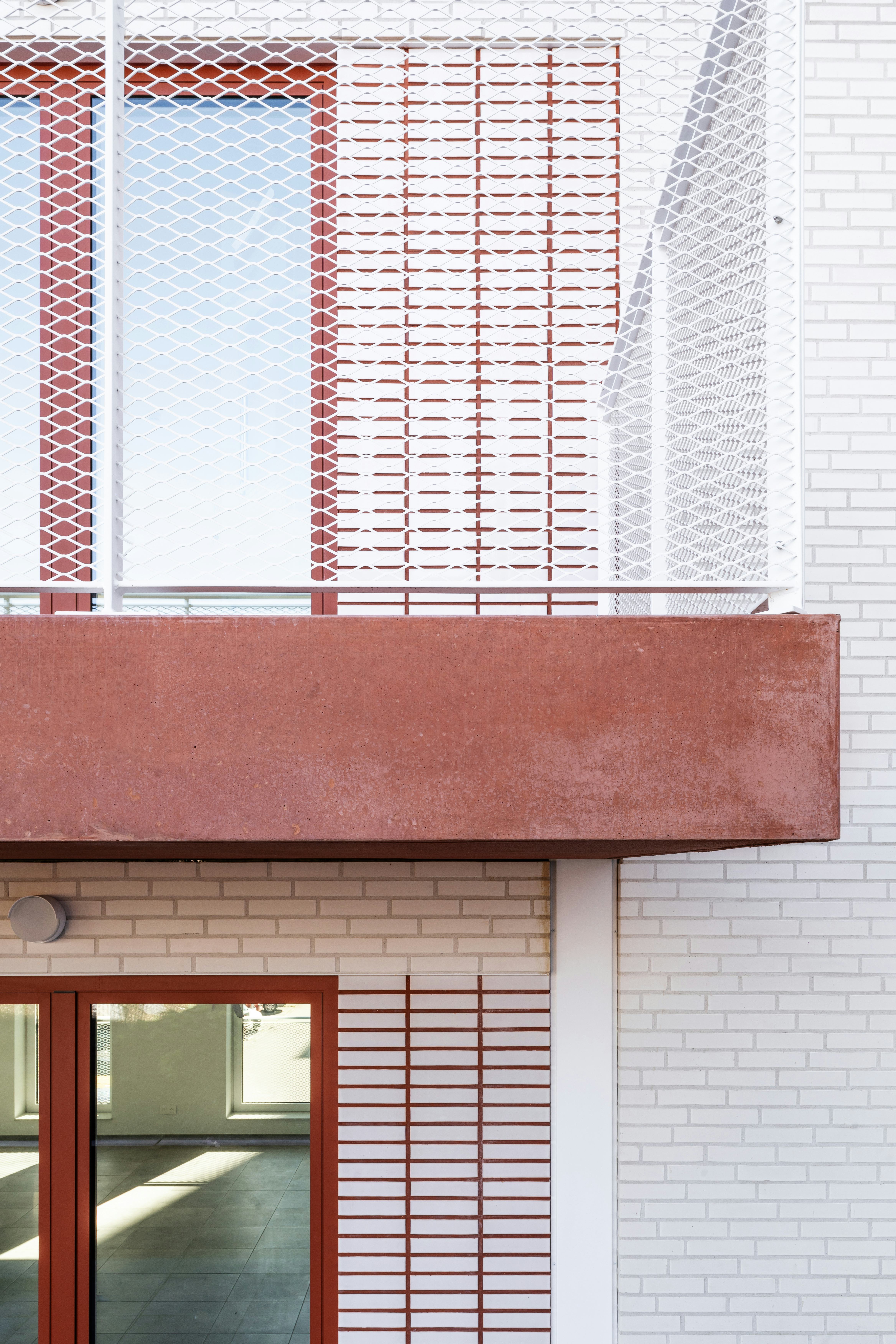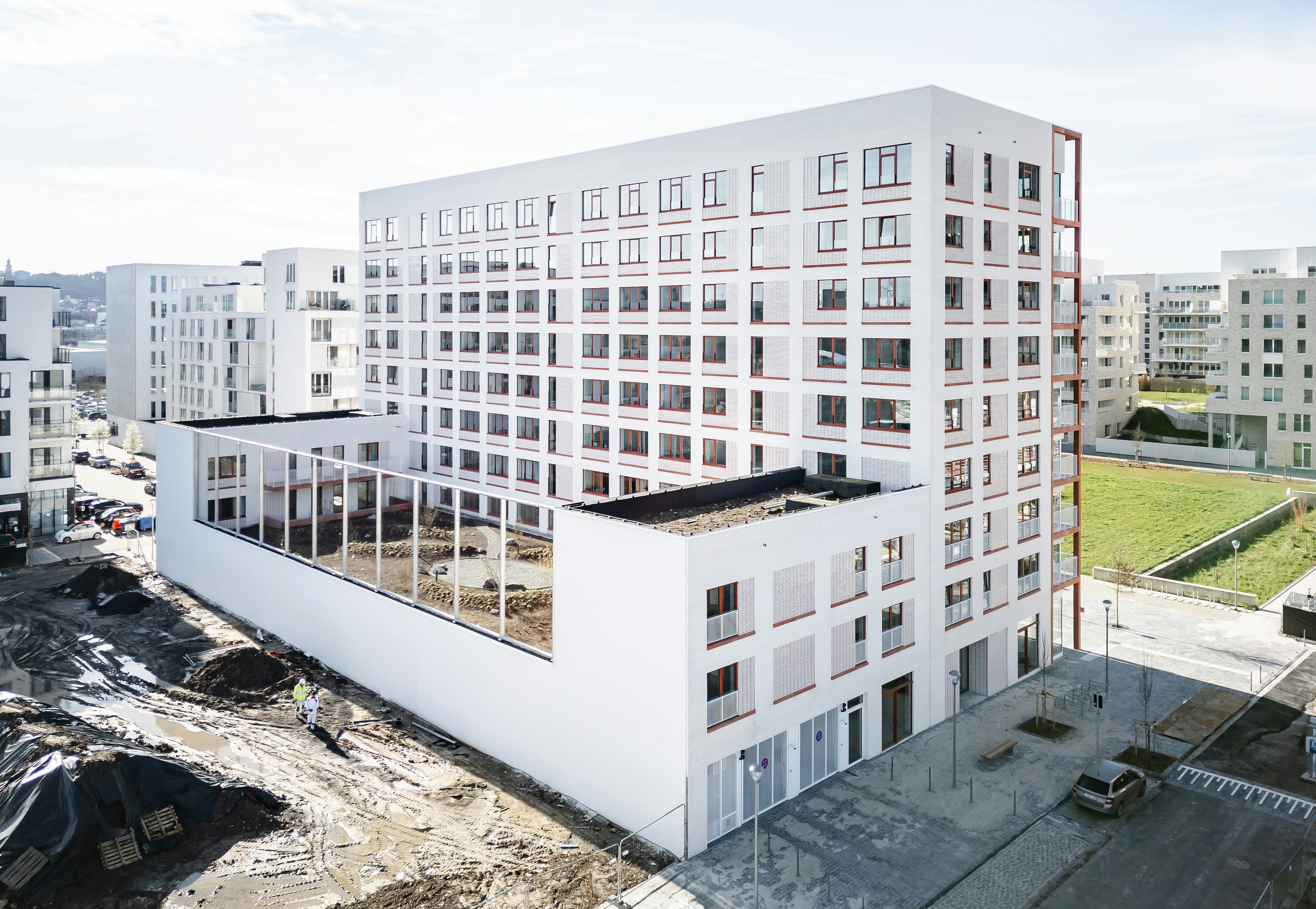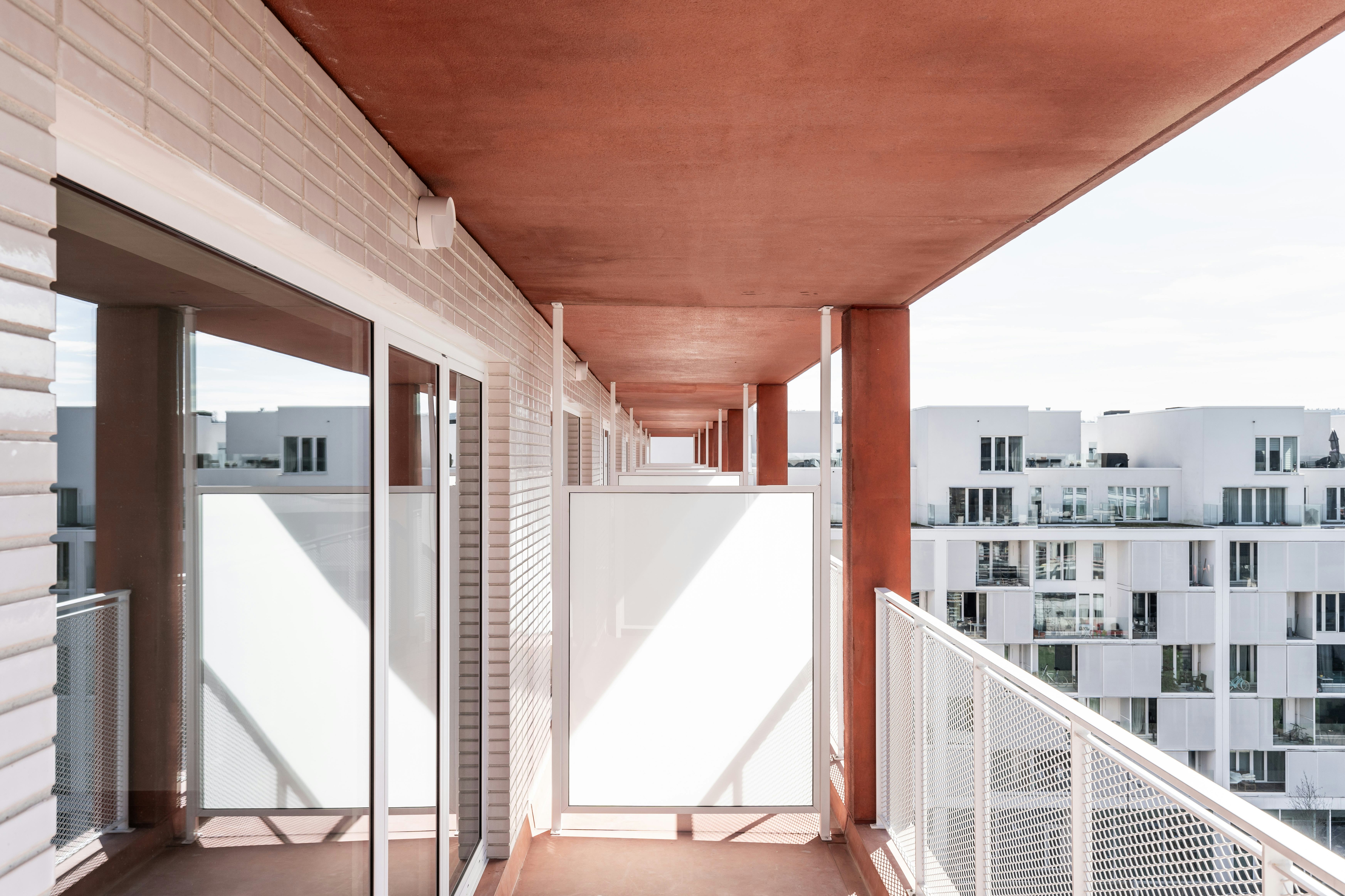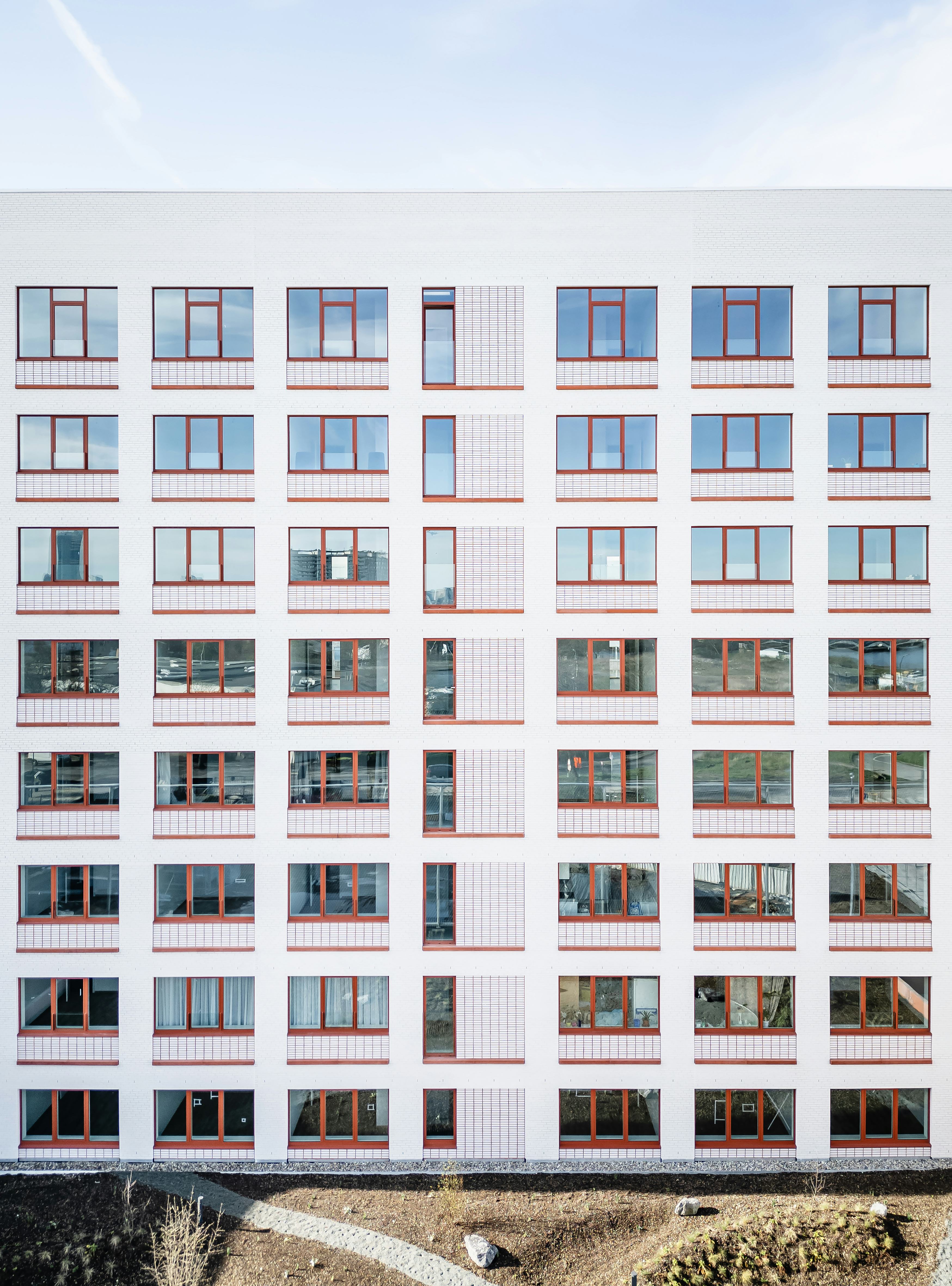 De architectuur balanceert tussen openheid en privacy. Twee volumes van verschillende hoogtes zorgen voor maximale lichtinval, terwijl een intensieve daktuin boven de parkeergarage een groene, collectieve ruimte creëert. De materialisatie – terracottakleurig beton gecombineerd met licht metselwerk en geglazuurde steen – versterkt het speelse en stedelijke karakter.