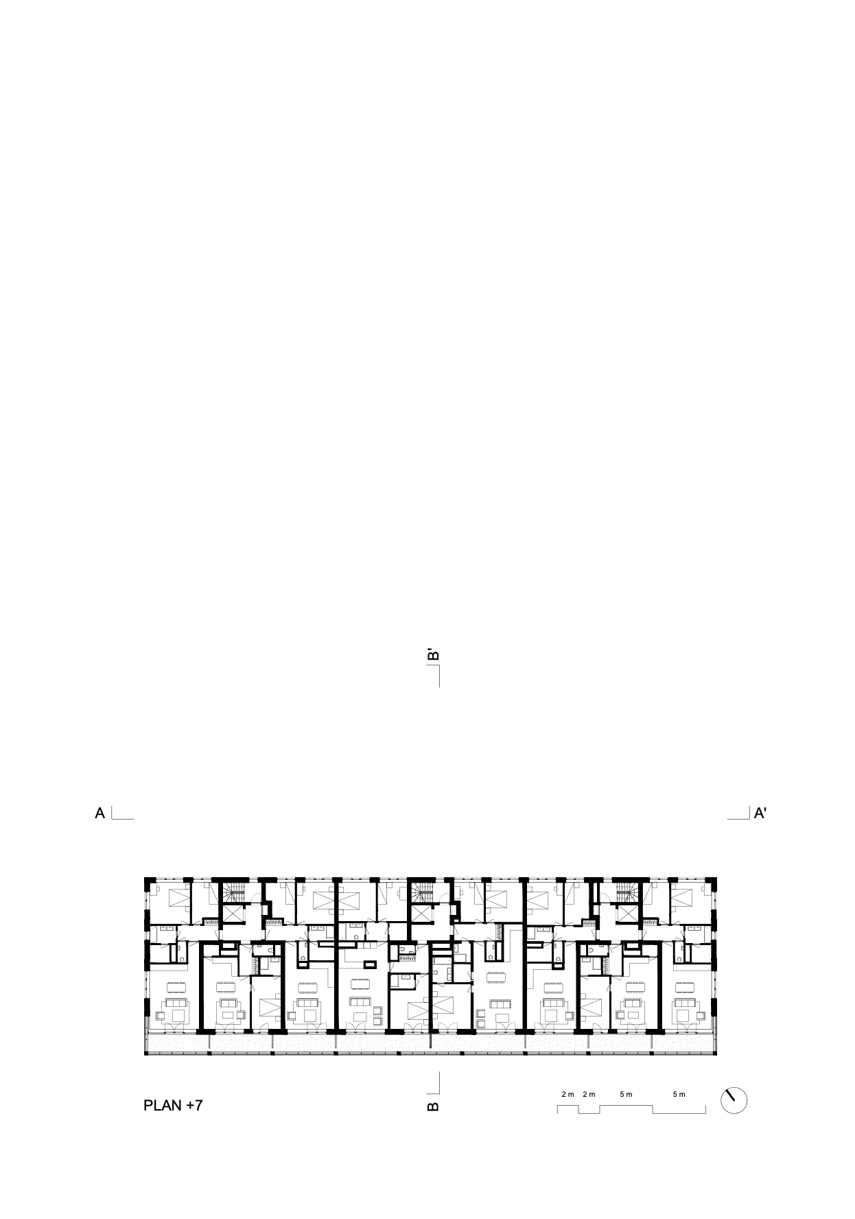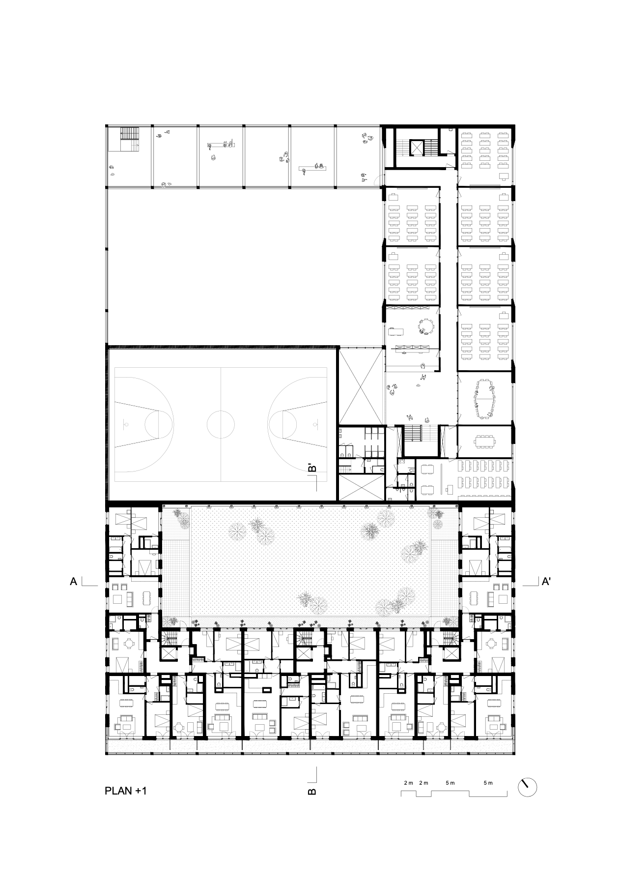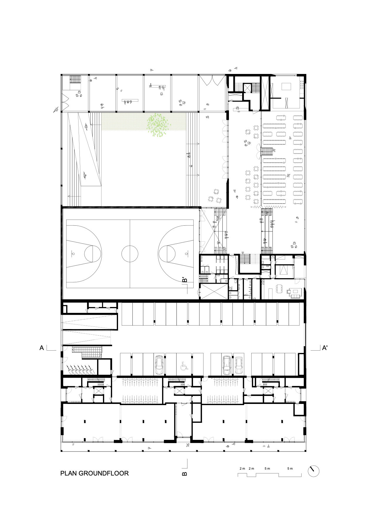 Opvallend zijn de open structuren die de overgang tussen privé en publiek vormgeven. De loggia’s fungeren als royale buitenkamers voor de appartementen, met zonnige uitzichten op het park en ingebouwde zonwering. Tegelijk vormen ze een secundaire stellingstructuur die het gebouw een uitgesproken, herkenbaar karakter geeft. Voor de school worden gestapelde plateaus ingezet, die de speelplaats transformeren tot een verticale beleving en een open stadsruimte die bijdraagt aan de publieke identiteit van het project.