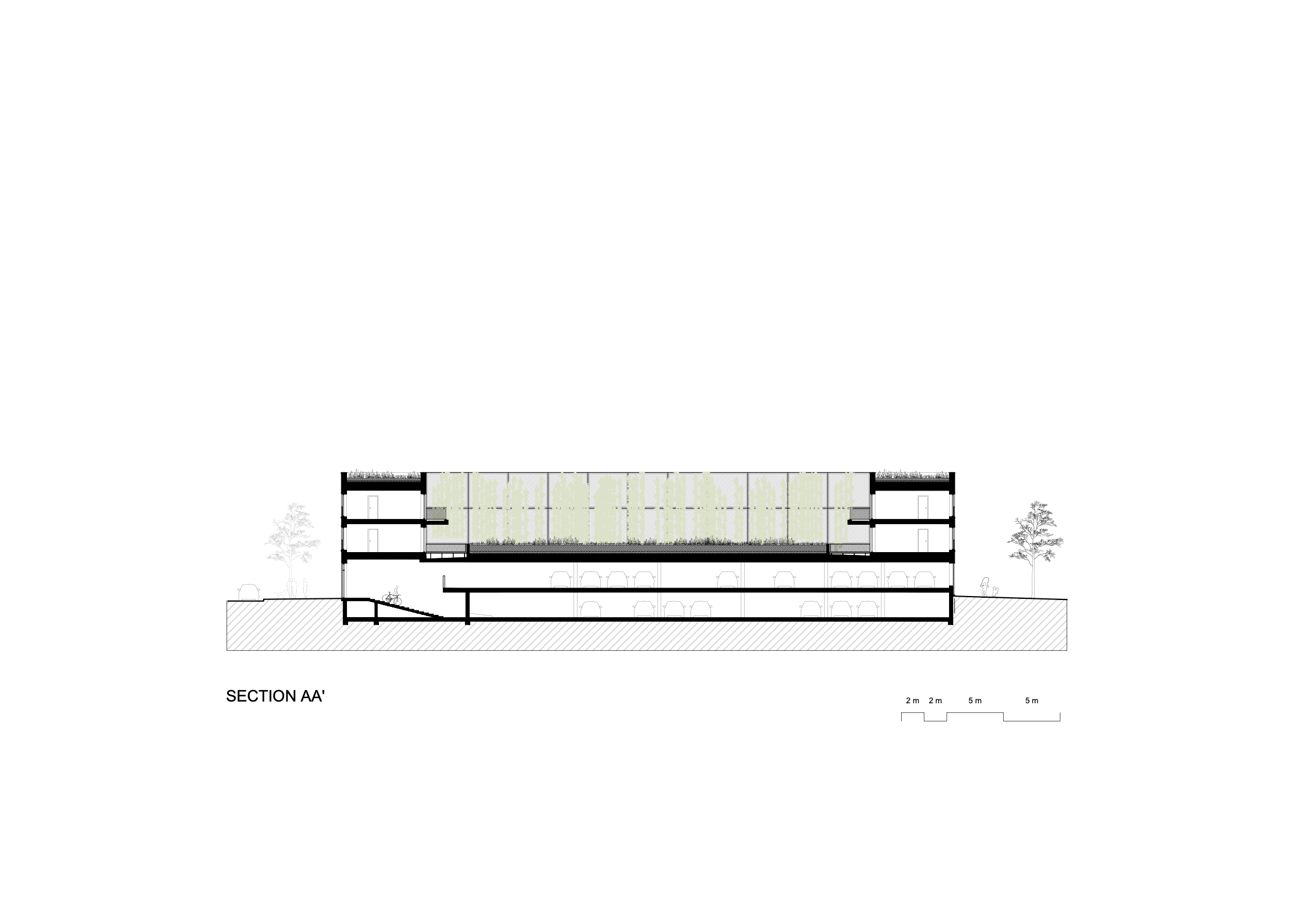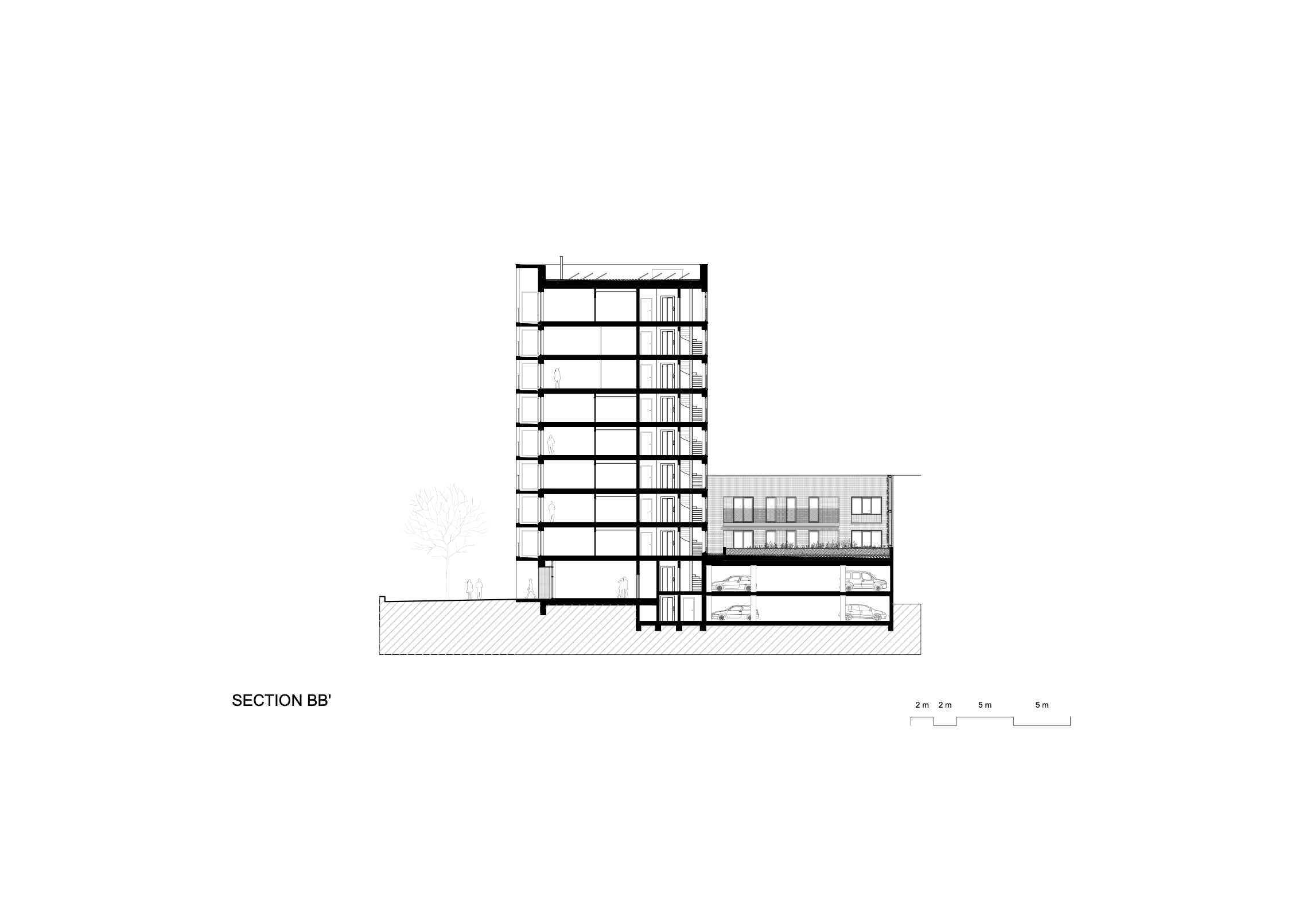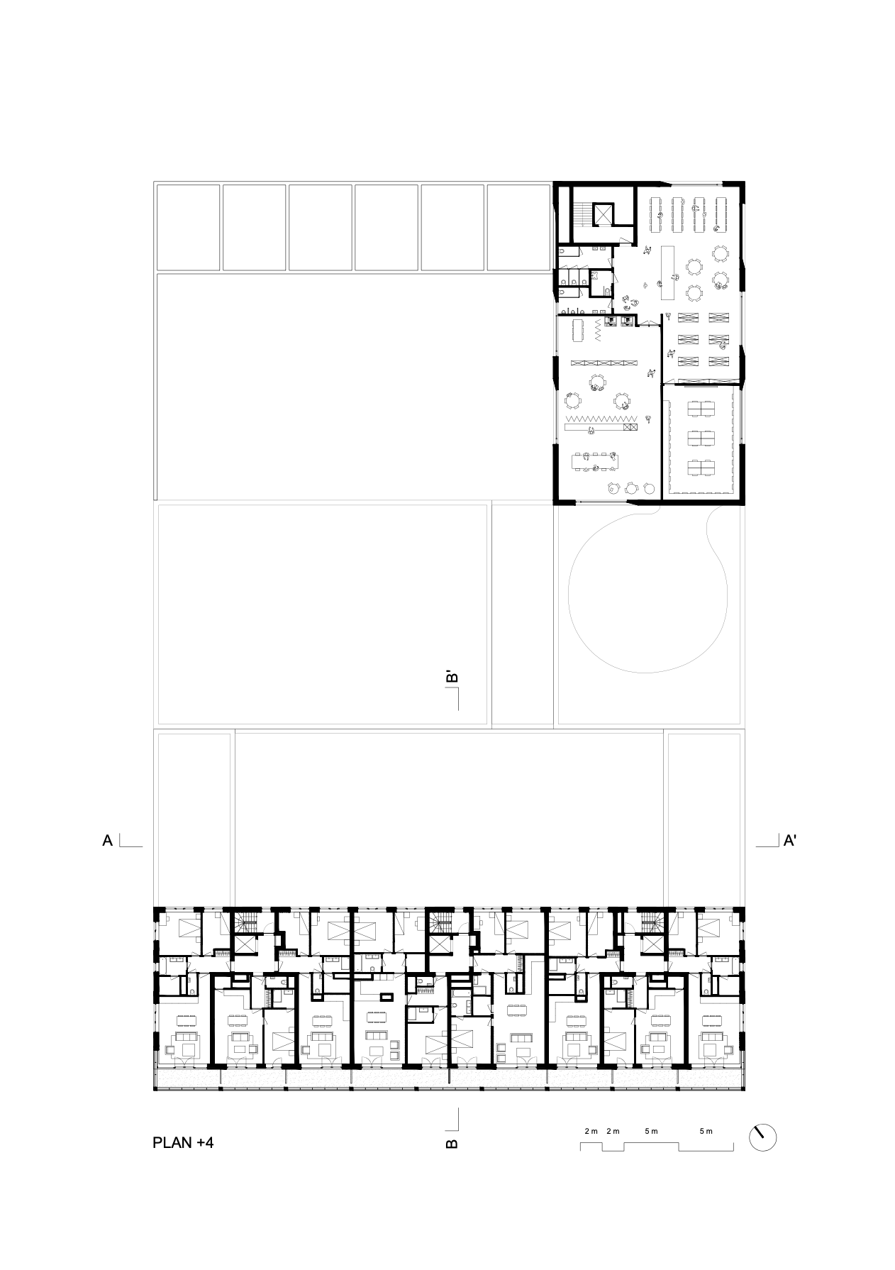 Opvallend zijn de open structuren die de overgang tussen privé en publiek vormgeven. De loggia’s fungeren als royale buitenkamers voor de appartementen, met zonnige uitzichten op het park en ingebouwde zonwering. Tegelijk vormen ze een secundaire stellingstructuur die het gebouw een uitgesproken, herkenbaar karakter geeft. Voor de school worden gestapelde plateaus ingezet, die de speelplaats transformeren tot een verticale beleving en een open stadsruimte die bijdraagt aan de publieke identiteit van het project.