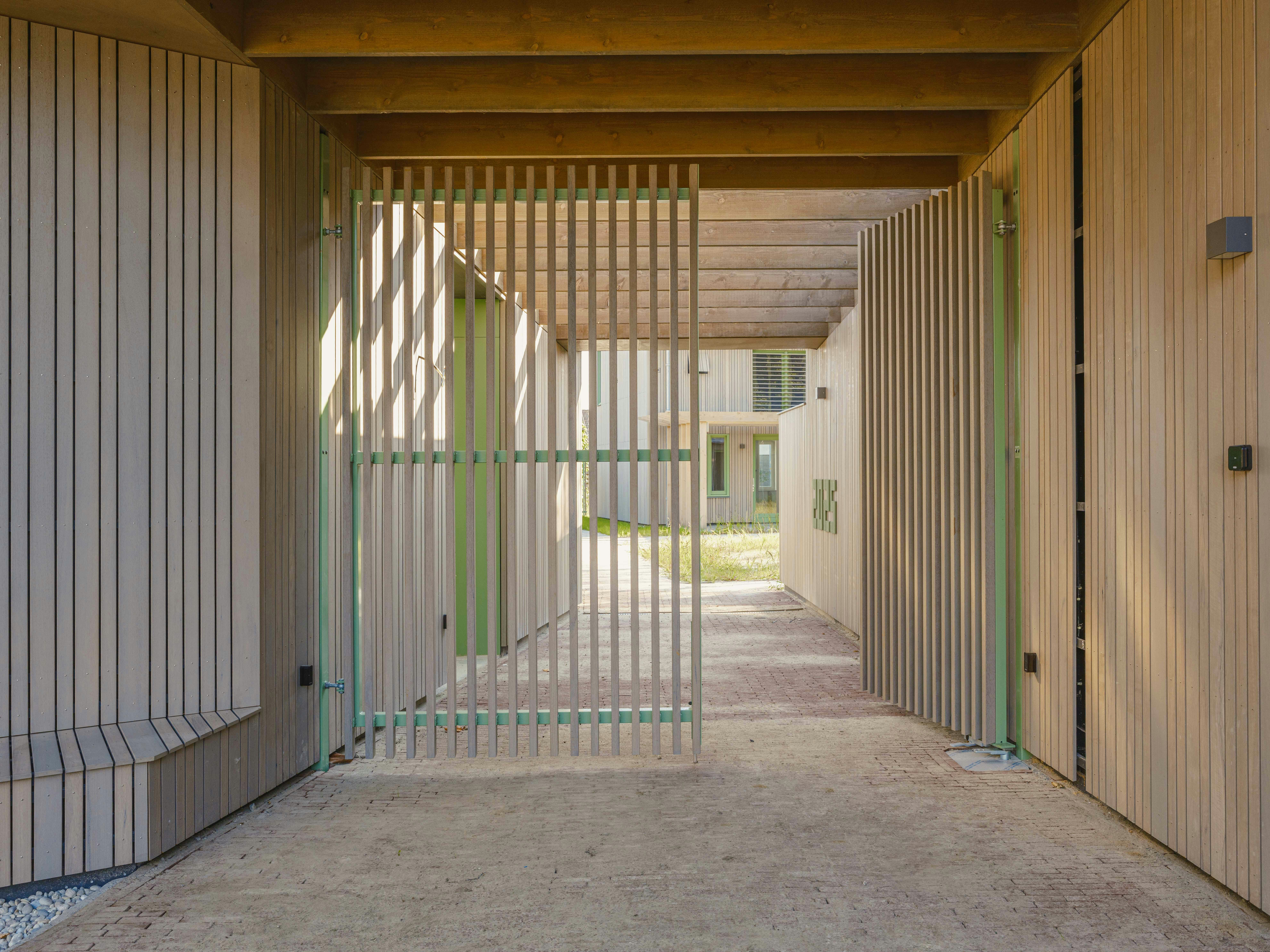 Bij het ontwerp is aandacht besteed aan de overgang tussen privé en openbaar gebied. Hout en zink zijn toegepast in onder meer gevels, overstekken en lamellen. Deze lamellen beperken hittestress en zorgen voor beschutting, terwijl zicht en contact tussen het hofje en de omgeving behouden blijven. De woningen zijn zo gepositioneerd dat ze zowel op het hof als op de omliggende straten zijn gericht.