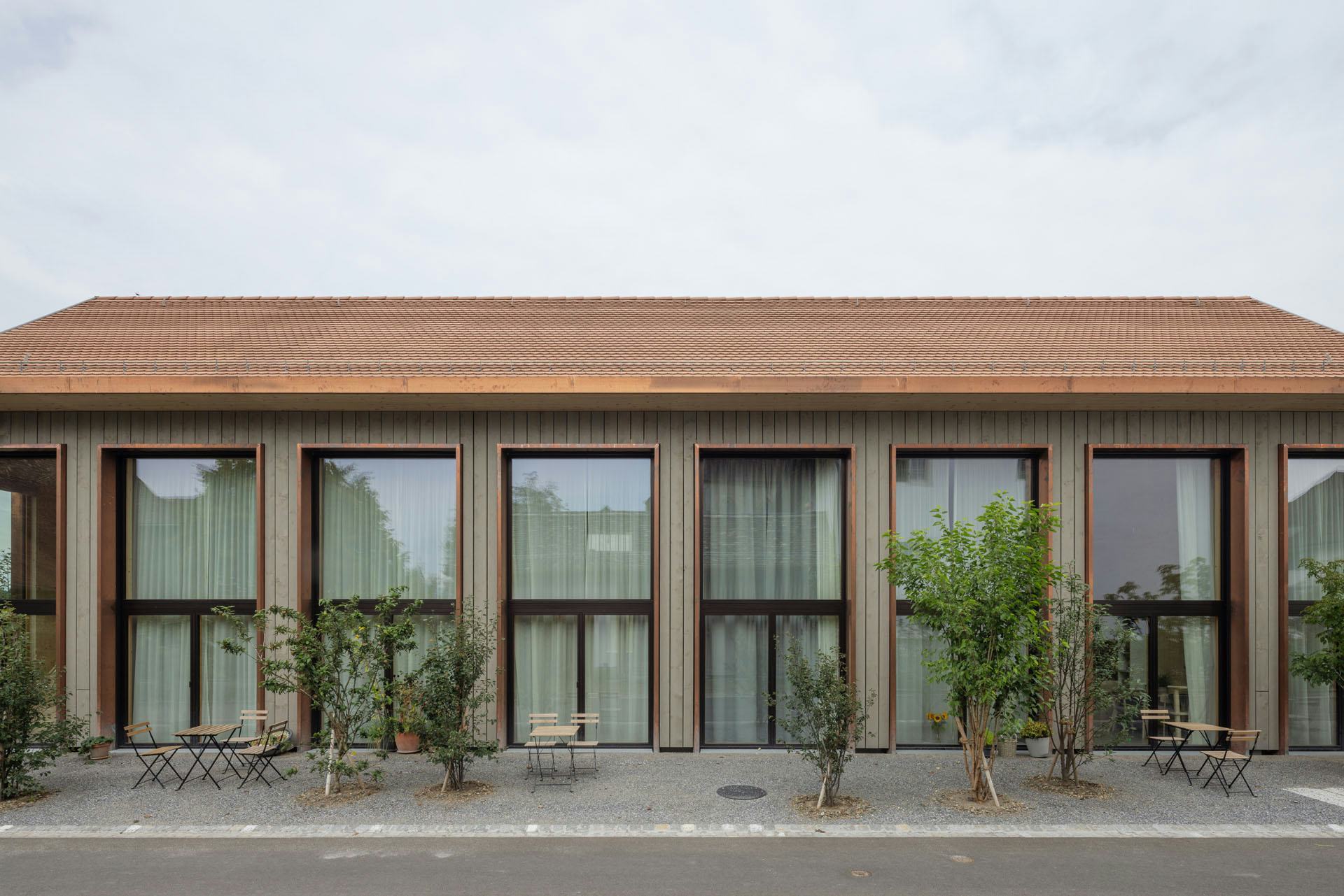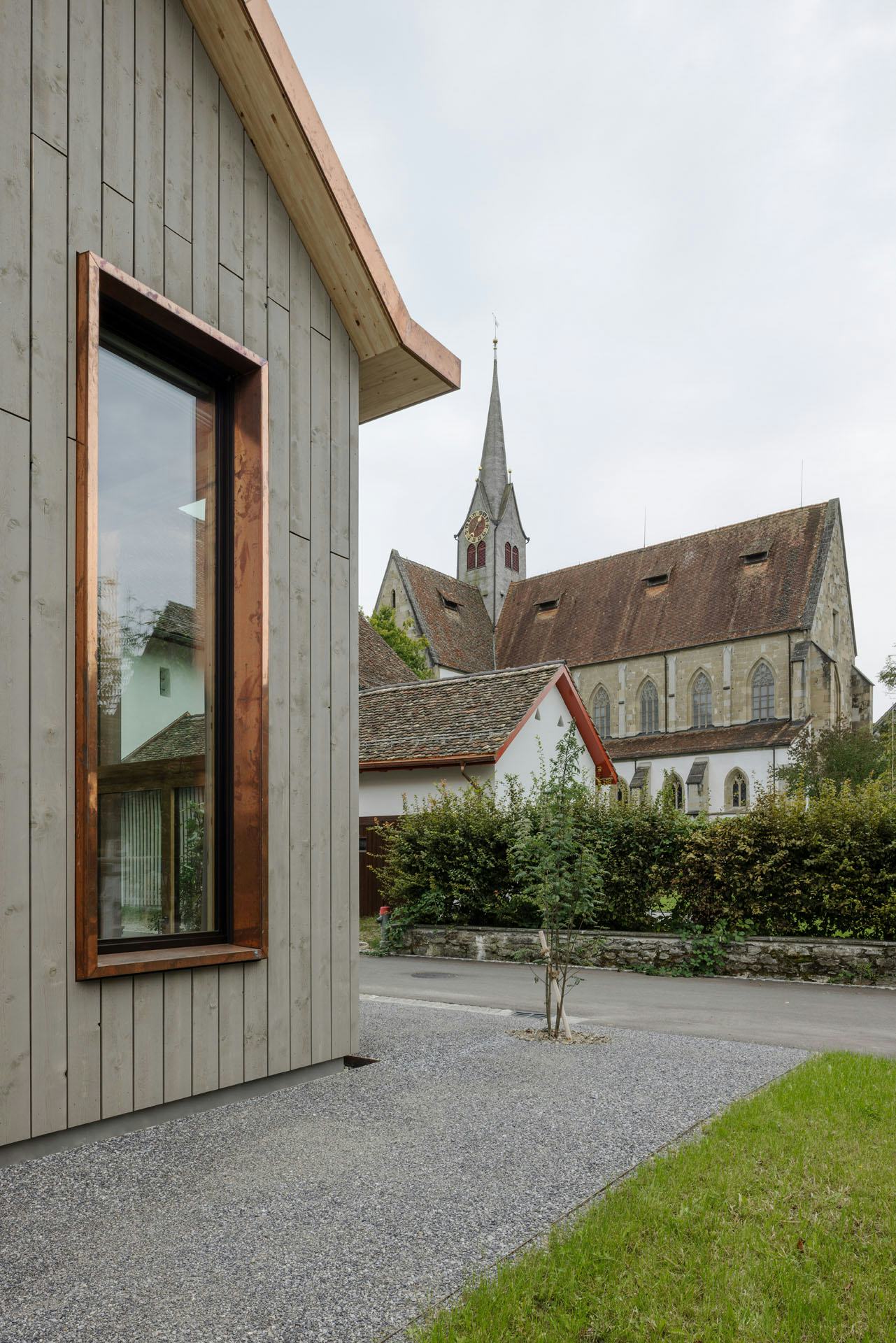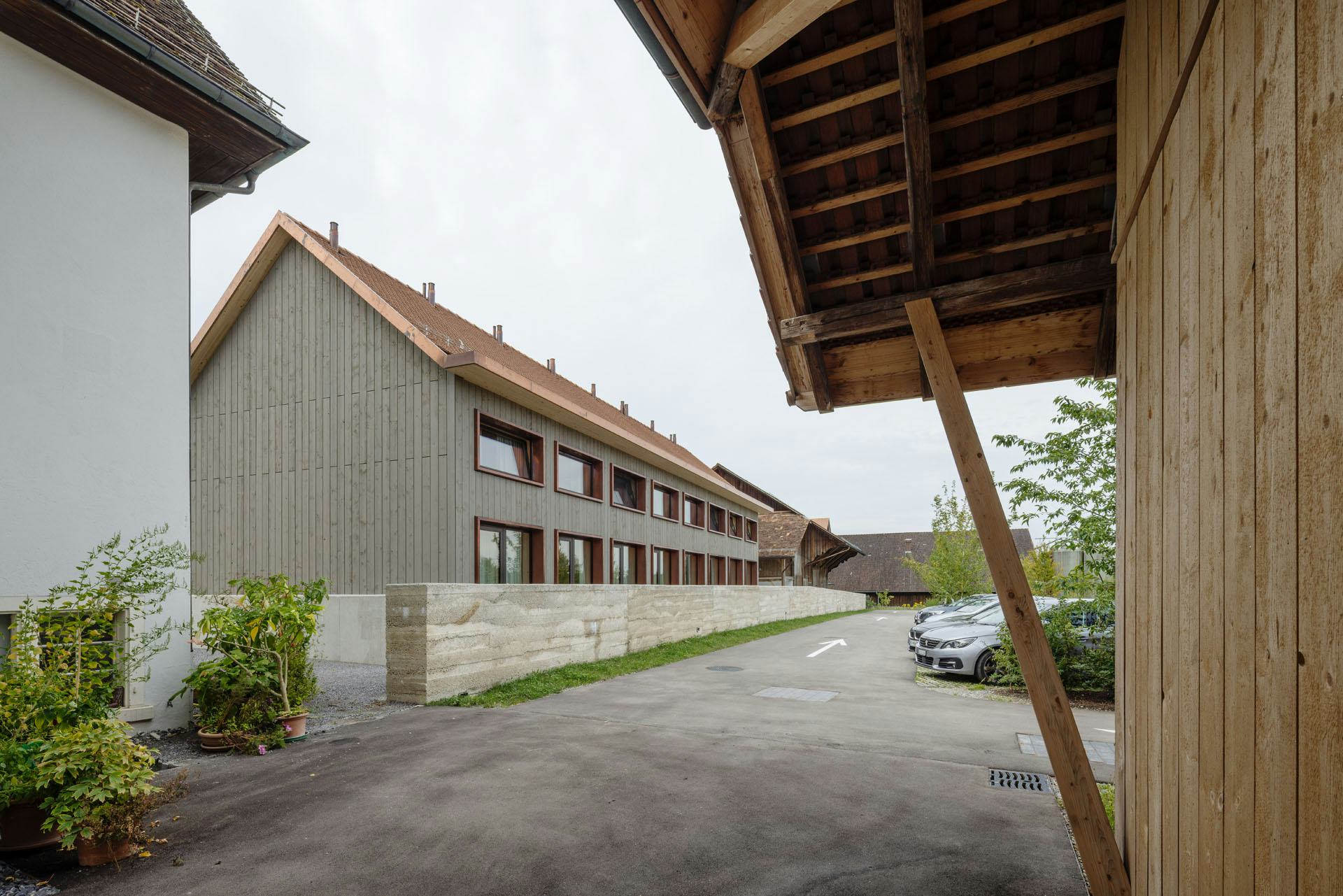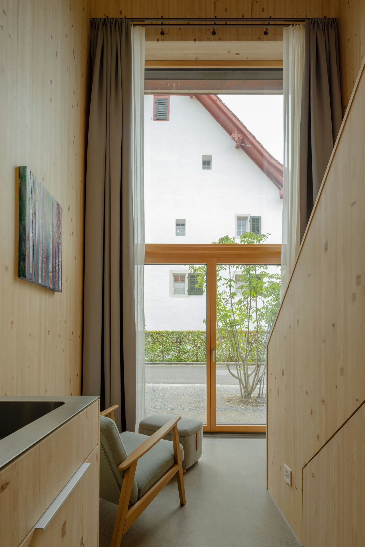 De woningen zijn uitgevoerd in houtskeletbouw met CLT-panelen, die ook het interieur bepalen. Wanden, plafonds en balustrades zijn van hetzelfde materiaal, aangevuld met ingebouwde kasten en planken. Alleen de begane grond en de kelder zijn van beton, afgewerkt met terrazzo. De gevels bestaan deels uit glas en deels uit houten latten. Koperen details markeren dakranden en raamopeningen; het dak is gedekt met rode pannen. Zo sluit het nieuwe gebouw aan bij de schaal en materialiteit van het kloostercomplex.
