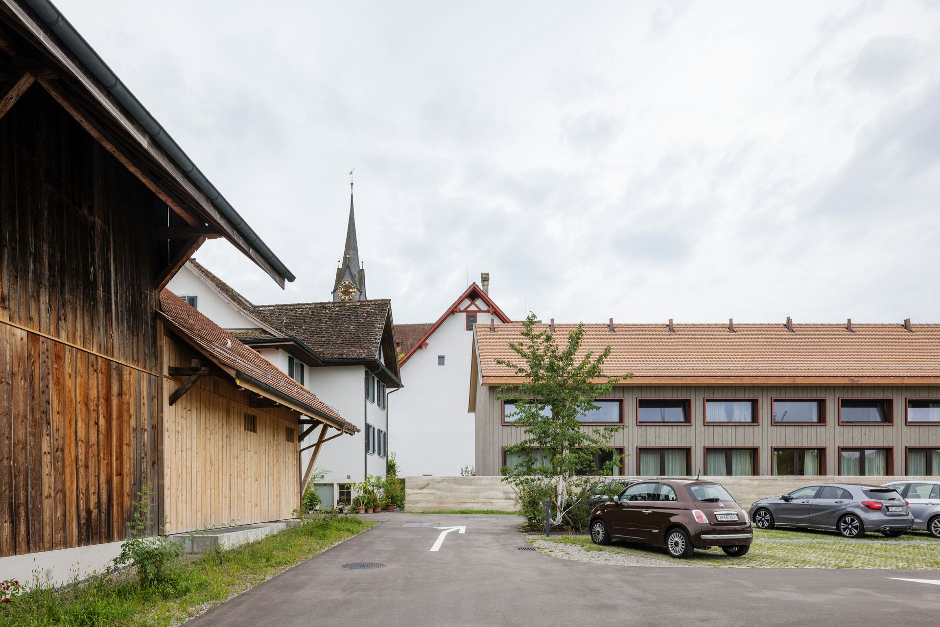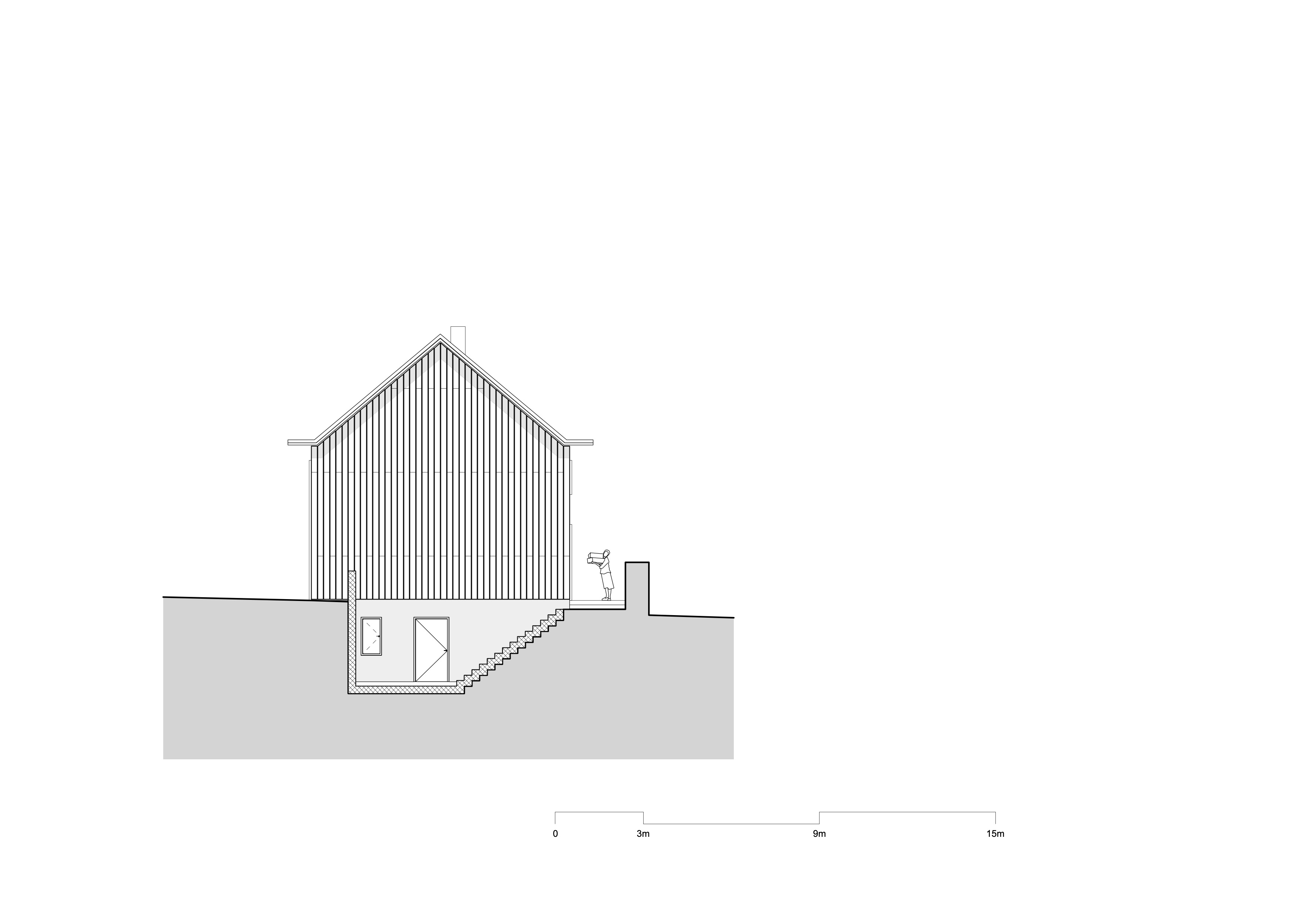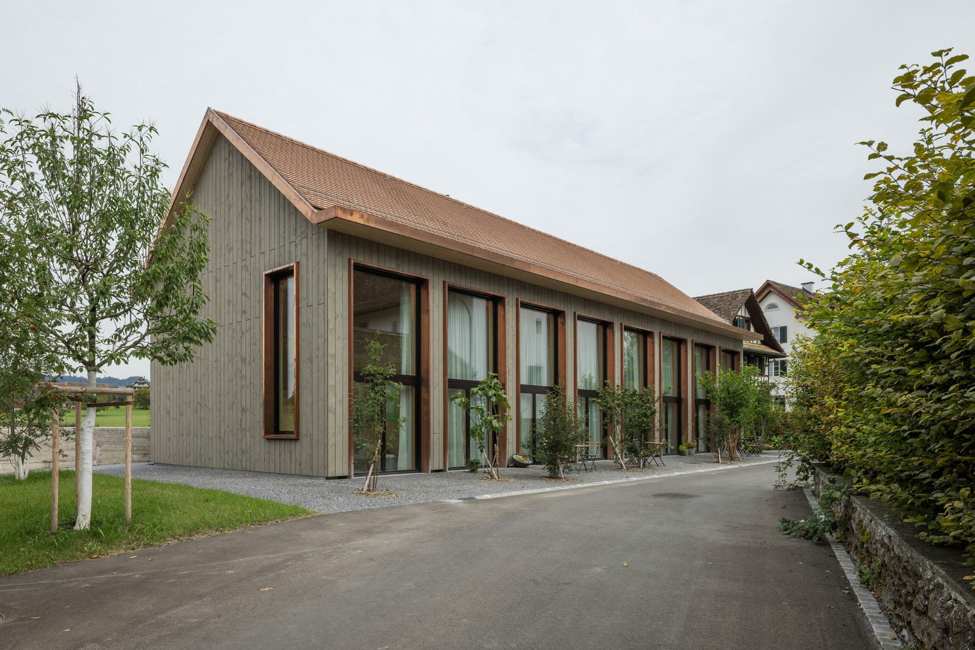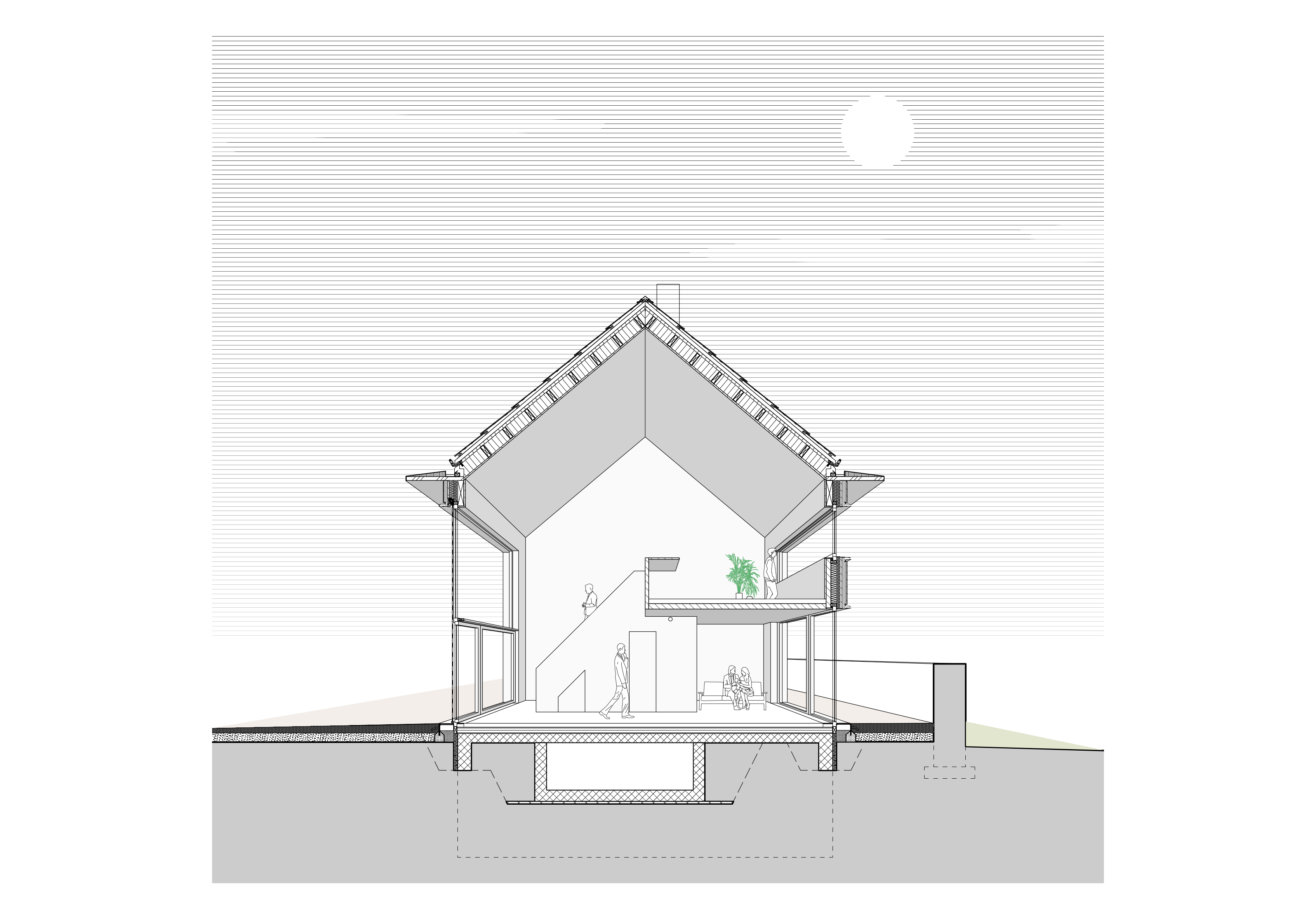 De woningen zijn uitgevoerd in houtskeletbouw met CLT-panelen, die ook het interieur bepalen. Wanden, plafonds en balustrades zijn van hetzelfde materiaal, aangevuld met ingebouwde kasten en planken. Alleen de begane grond en de kelder zijn van beton, afgewerkt met terrazzo. De gevels bestaan deels uit glas en deels uit houten latten. Koperen details markeren dakranden en raamopeningen; het dak is gedekt met rode pannen. Zo sluit het nieuwe gebouw aan bij de schaal en materialiteit van het kloostercomplex.