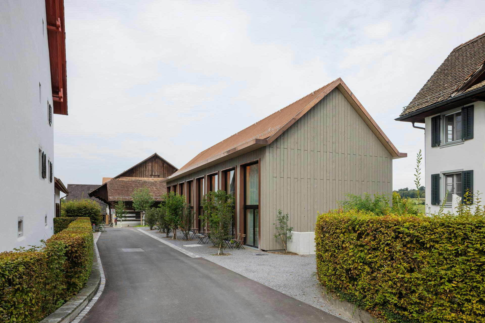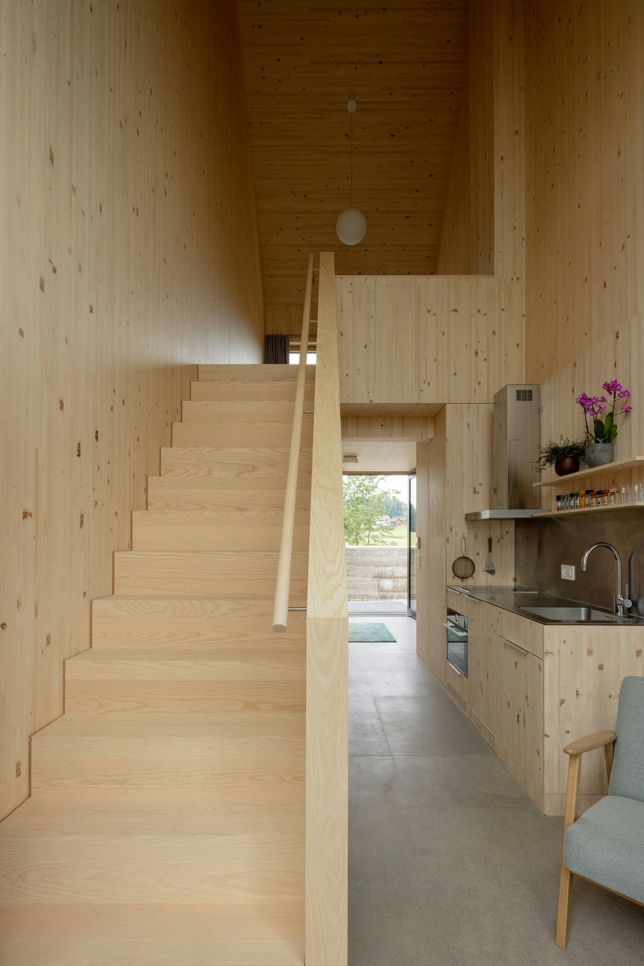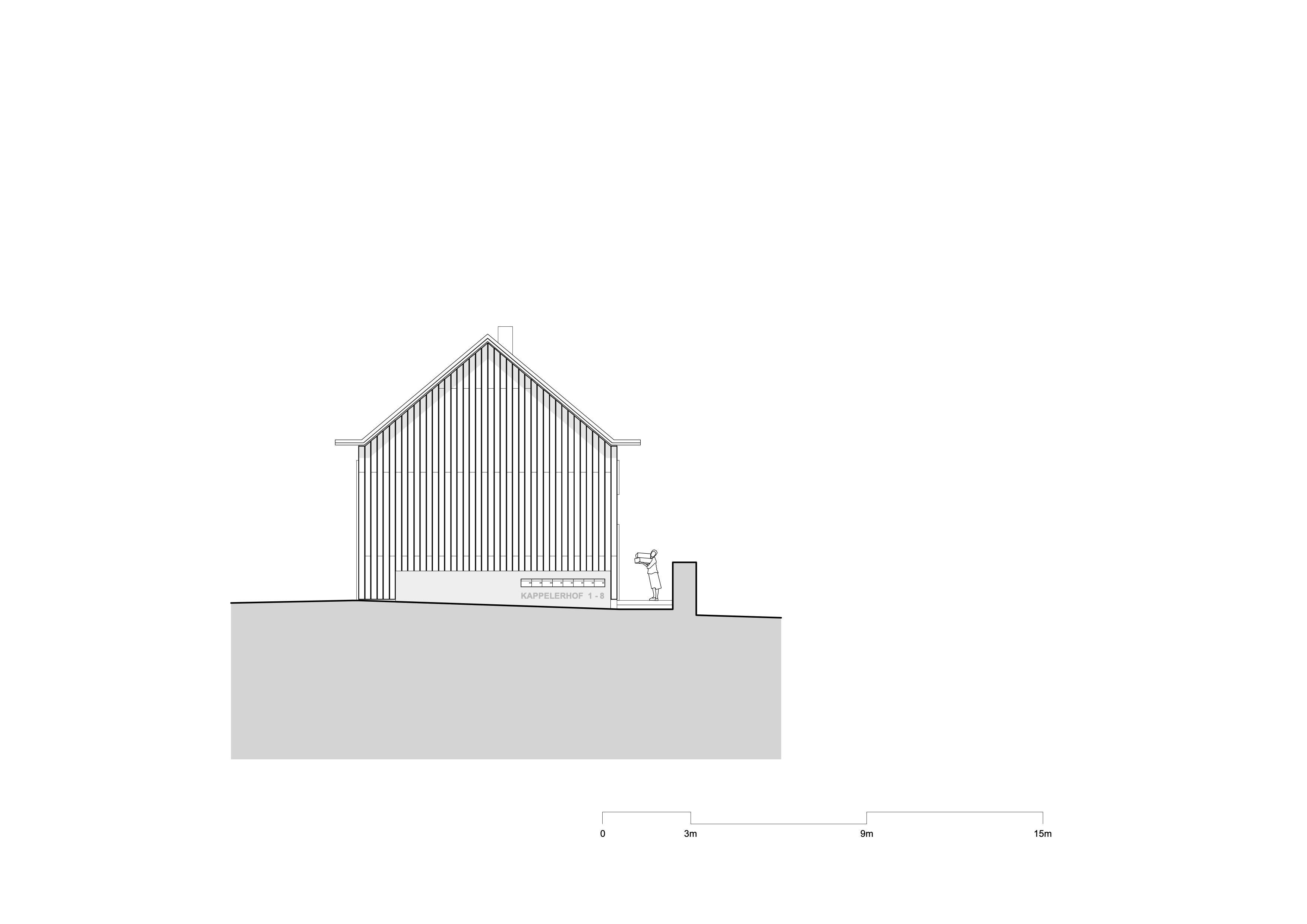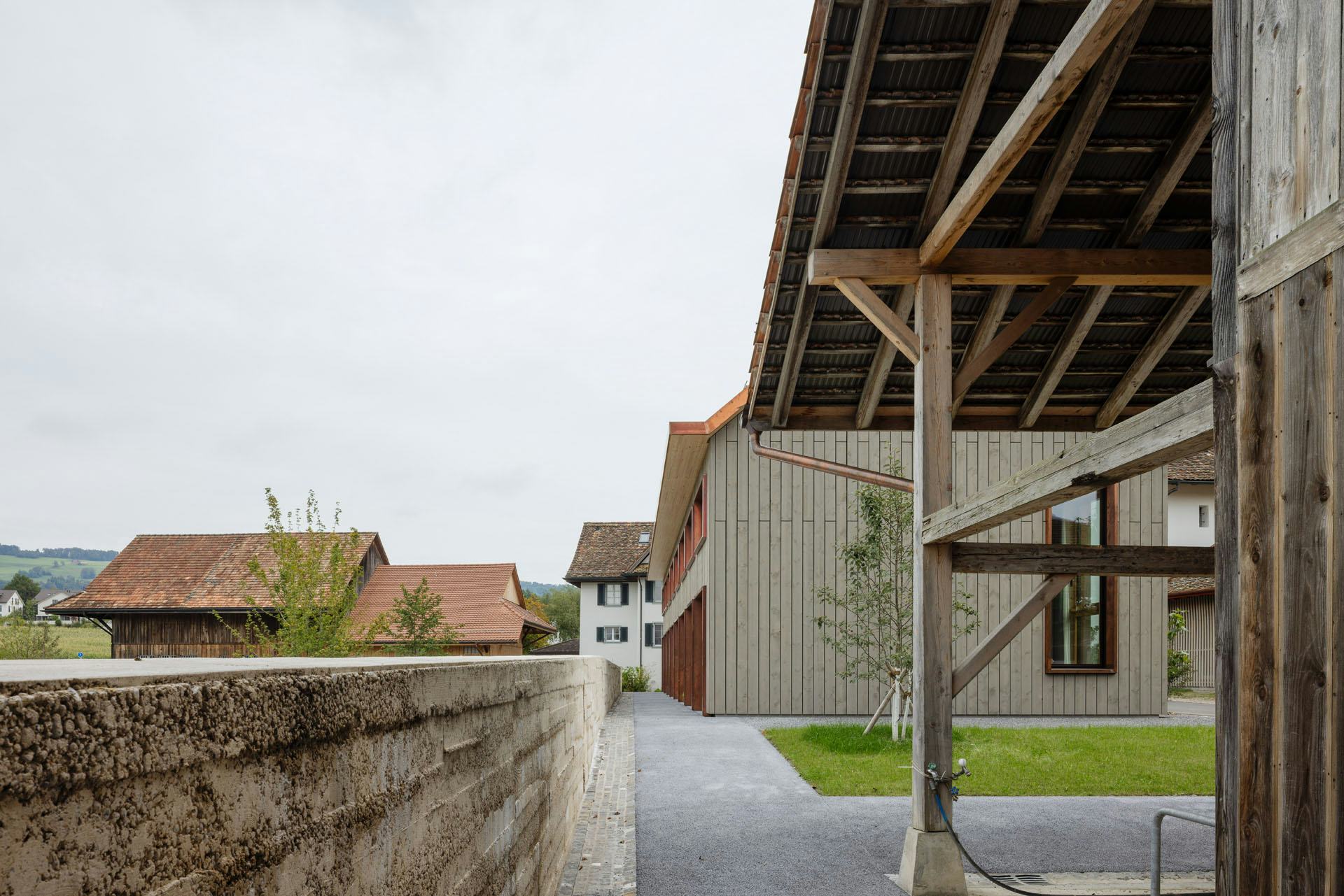 De woningen zijn uitgevoerd in houtskeletbouw met CLT-panelen, die ook het interieur bepalen. Wanden, plafonds en balustrades zijn van hetzelfde materiaal, aangevuld met ingebouwde kasten en planken. Alleen de begane grond en de kelder zijn van beton, afgewerkt met terrazzo. De gevels bestaan deels uit glas en deels uit houten latten. Koperen details markeren dakranden en raamopeningen; het dak is gedekt met rode pannen. Zo sluit het nieuwe gebouw aan bij de schaal en materialiteit van het kloostercomplex.