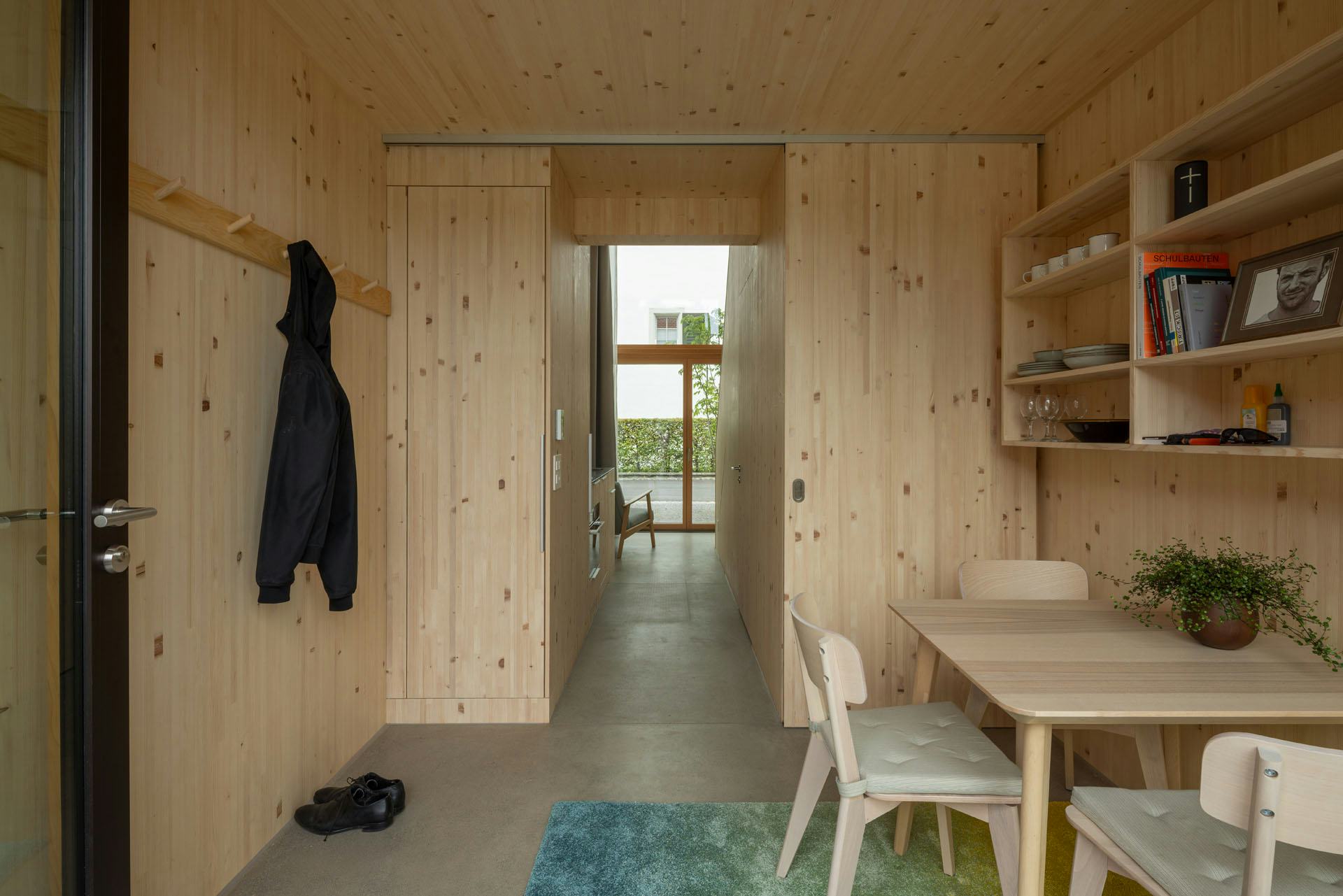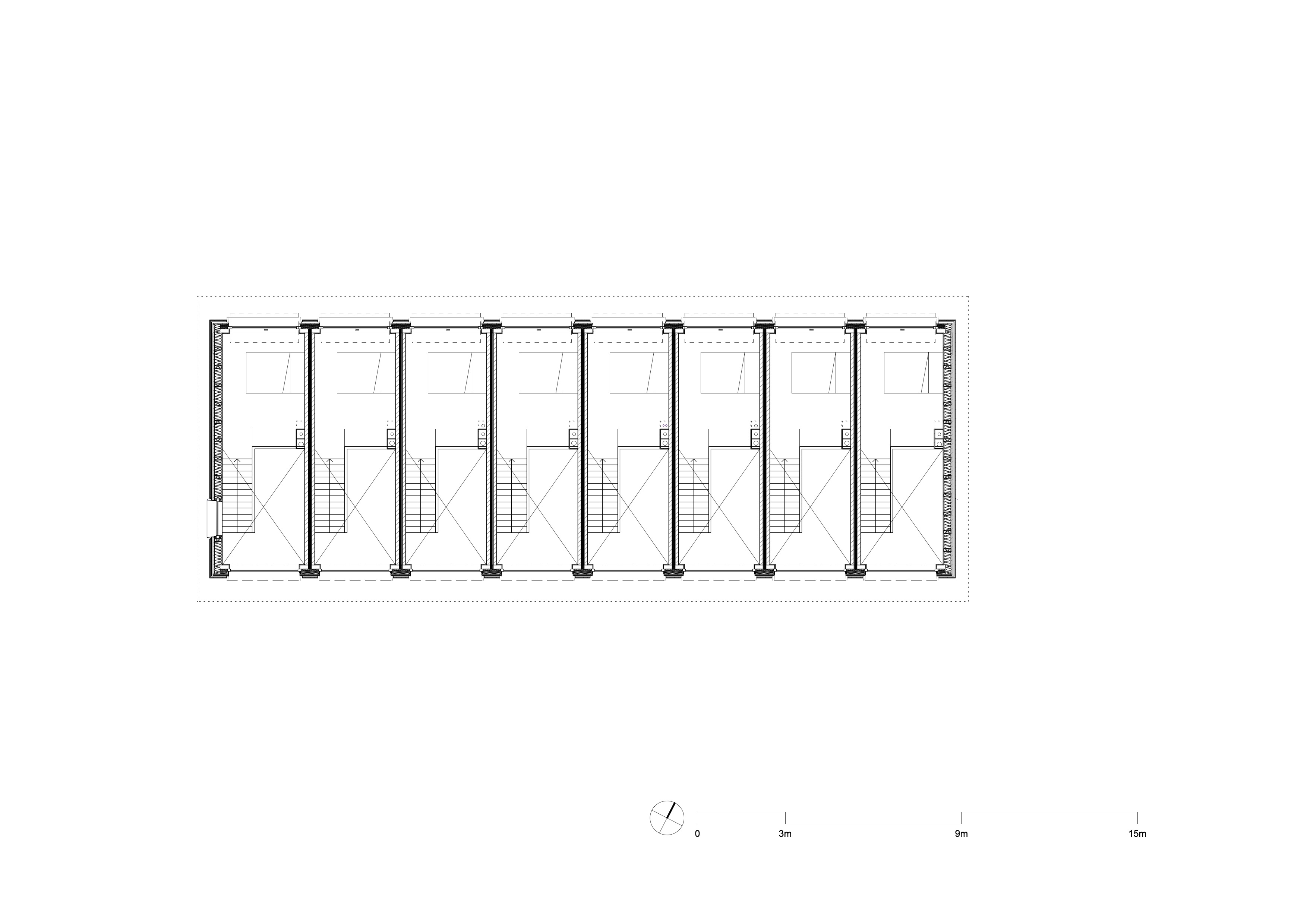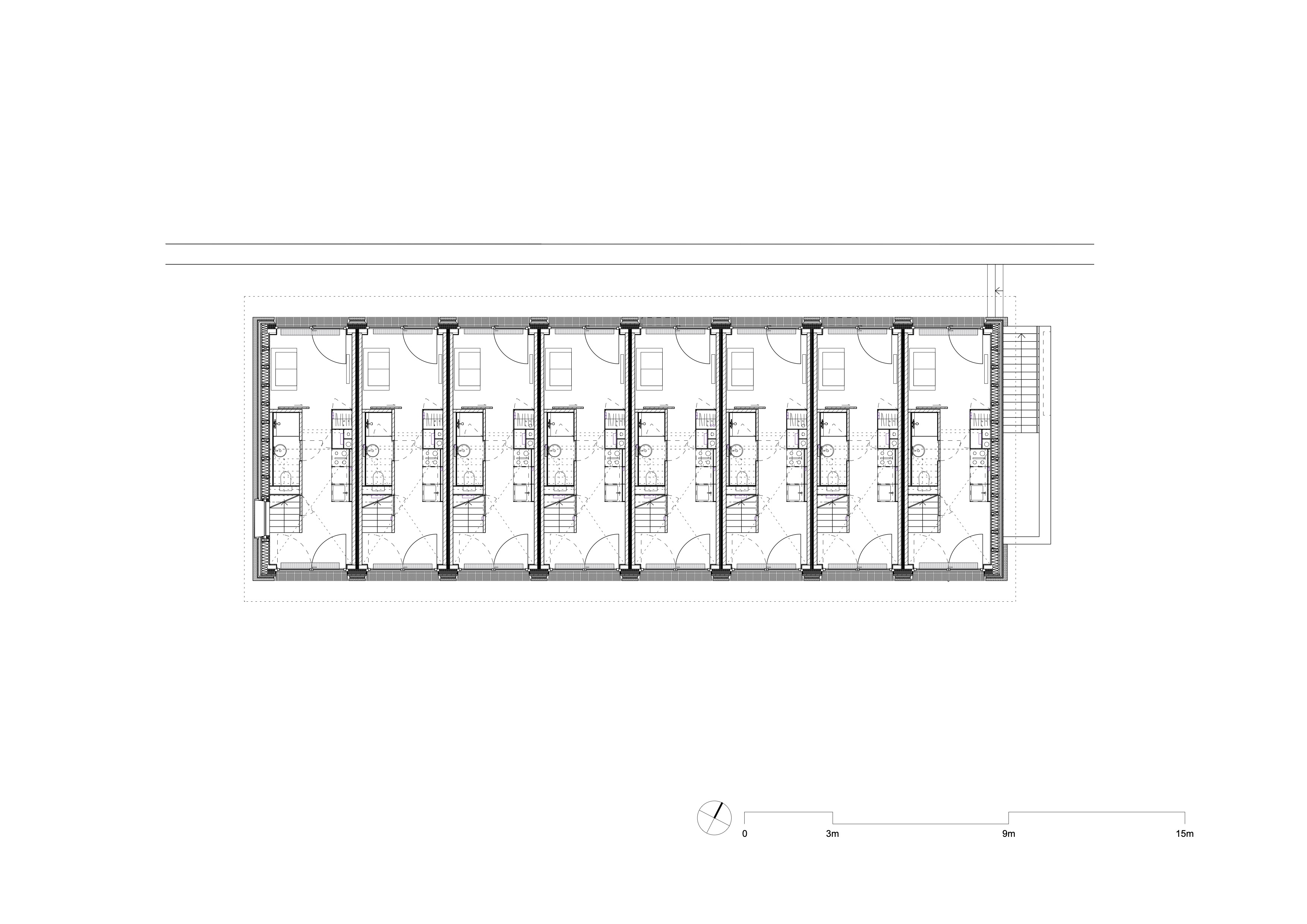 Na onderzoek naar meerlaagse woningtypologieën is gekozen voor een rijwoningtypologie. Het resultaat is een reeks zeer smalle woningen met een beuk van 3,1 meter. Elke woning heeft op de begane grond een woonruimte met keuken en op de verdieping een slaapruimte. Beide niveaus zijn verbonden door een vide die doorloopt tot in de nok. De appartementen hebben een oppervlakte van 33 m². Door de compacte opzet zijn alle functies nauw op elkaar afgestemd. De badkamer is onder de trap geplaatst en het meubilair is grotendeels vast ingebouwd.