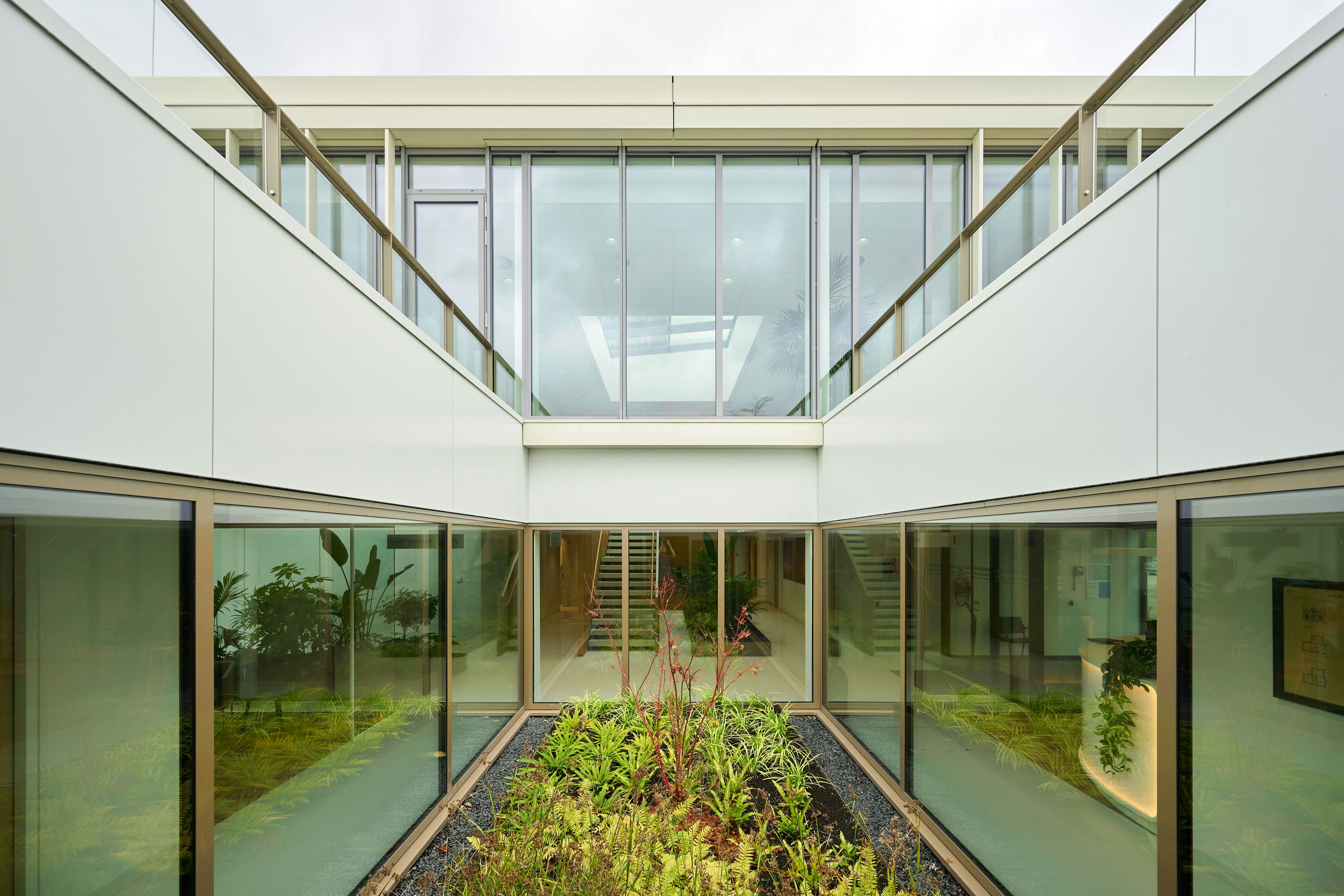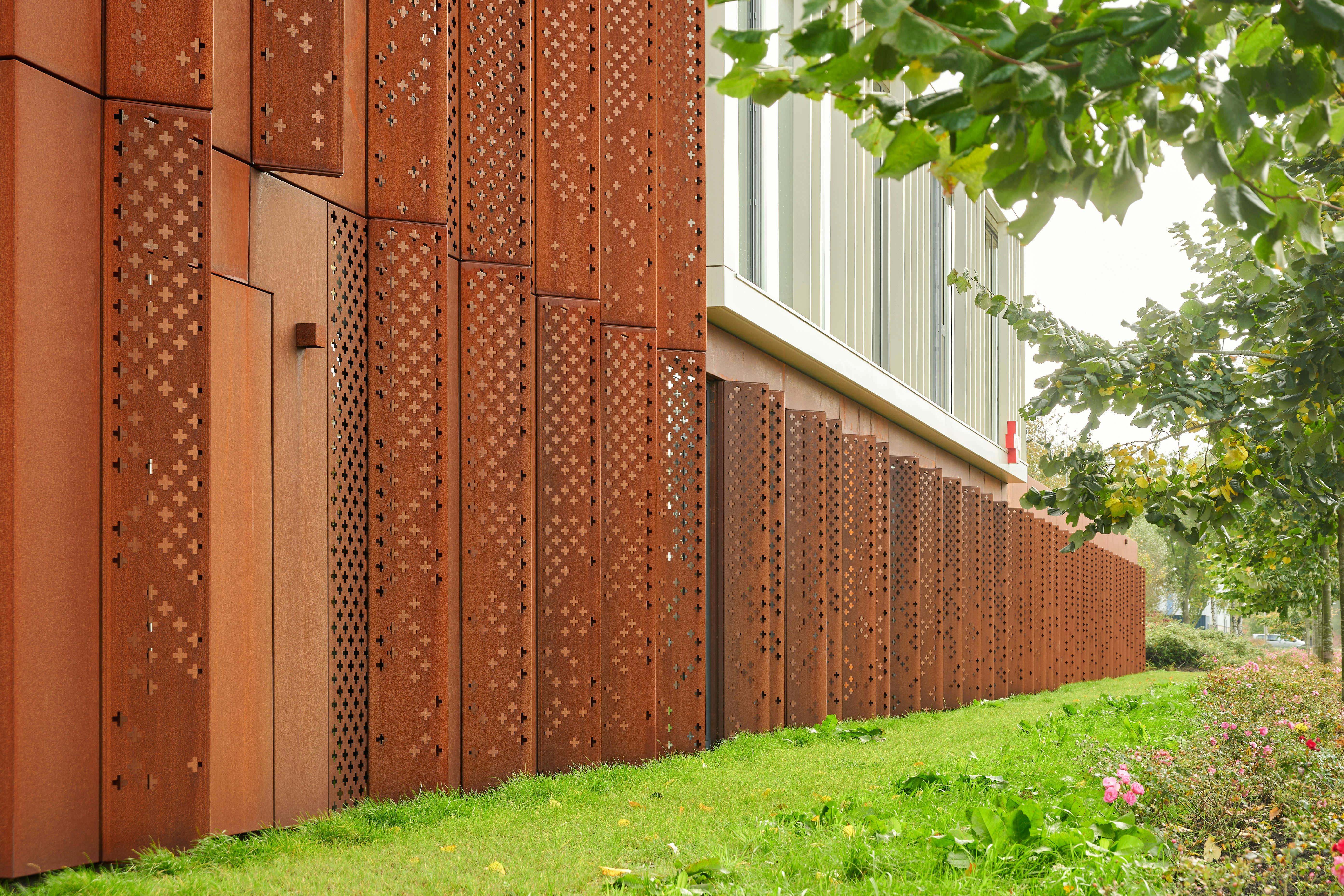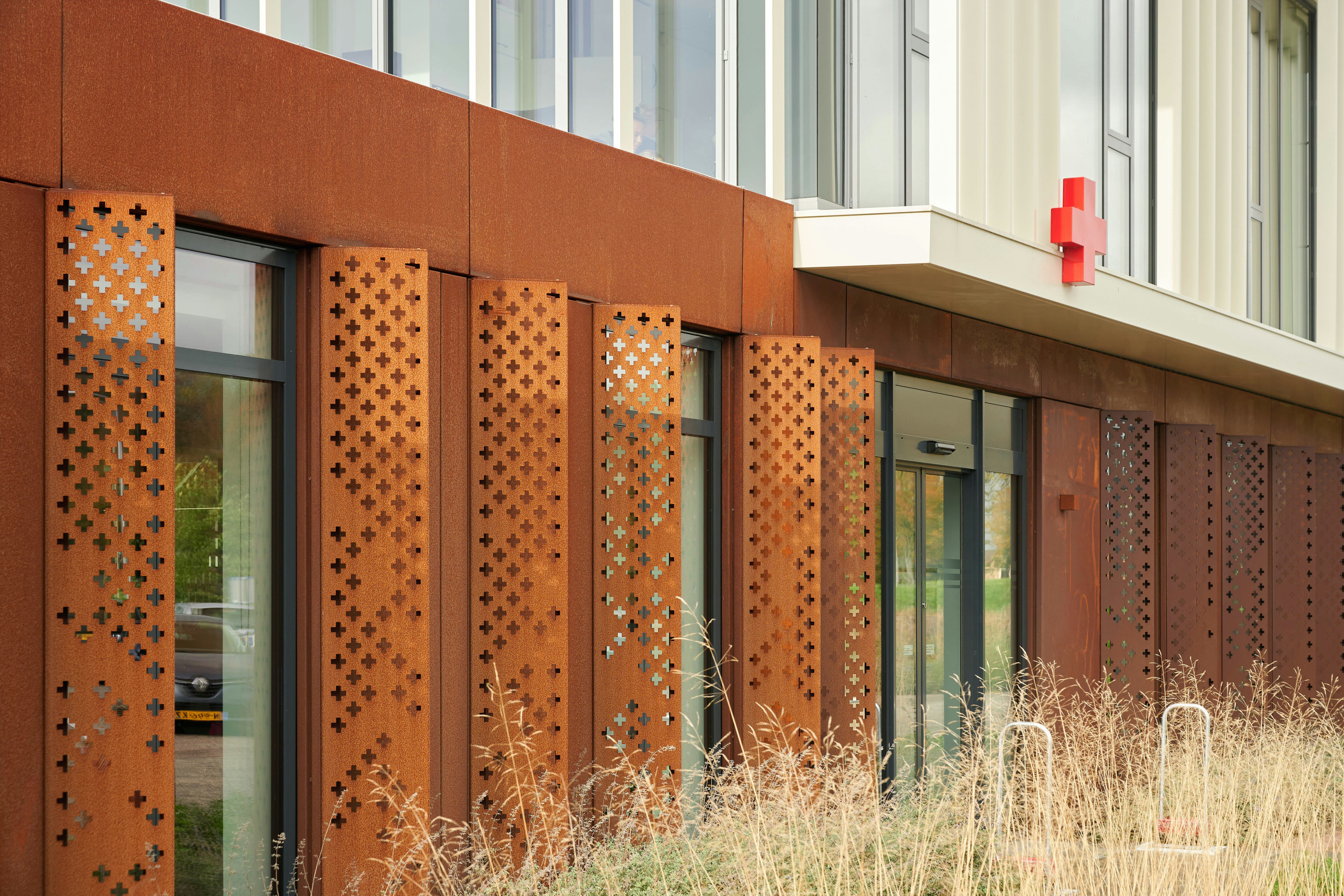 Het ontwerp is gebaseerd op het kruis van Genève, het symbool voor medische bescherming. Deze vorm bepaalt de plattegrond en is zichtbaar in de perforaties van de cortenstalen lamellen. Elke vleugel van het kruis heeft een functie, zoals entree, patio, atrium of wintertuin.