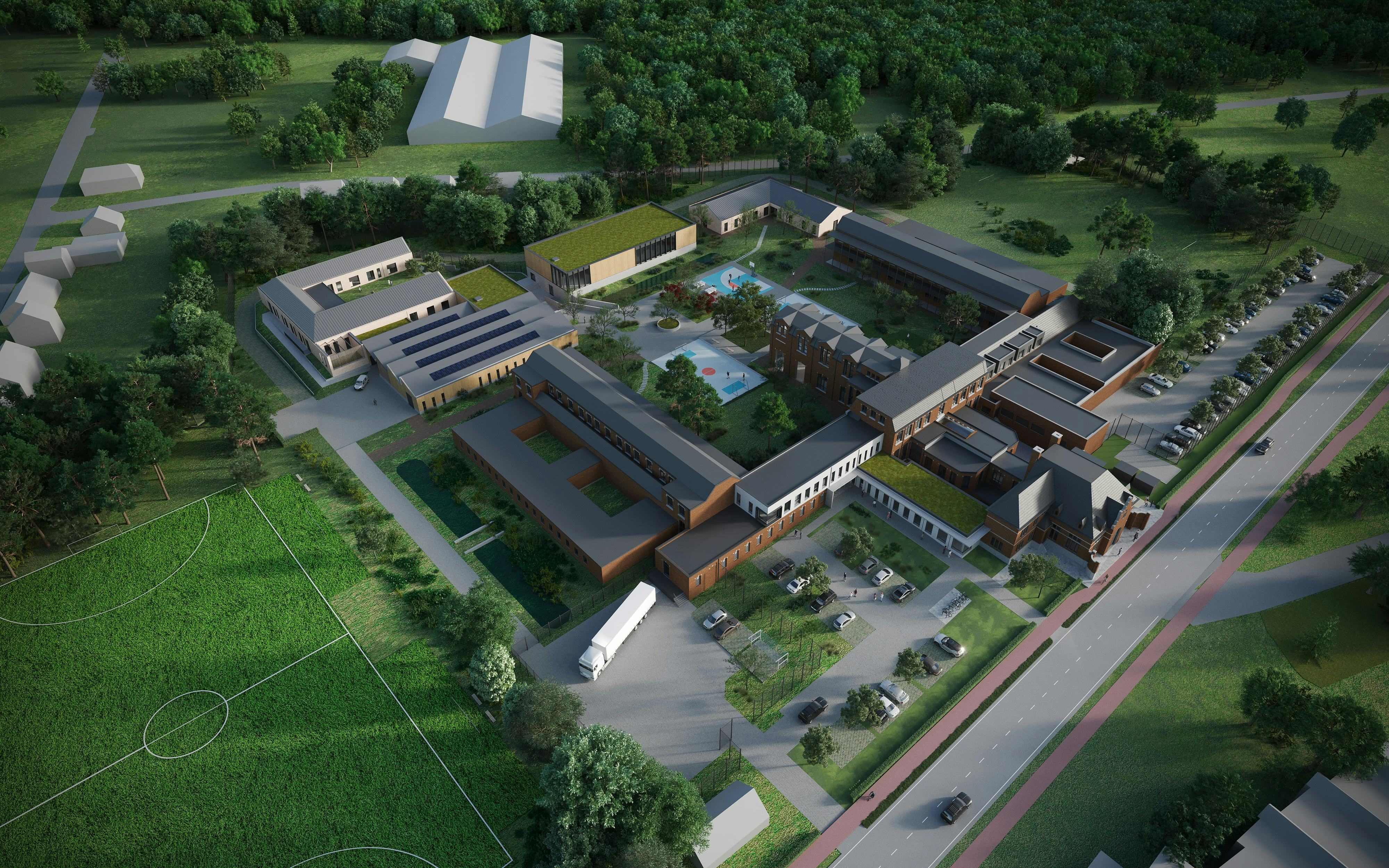 Het masterplan zoekt een balans tussen openheid en geslotenheid. De gebouwen zijn georganiseerd rond een groen plein. Hoogteverschillen, beplanting en de plaatsing van gebouwen creëren privacy. Tuinen bij de leefgroepen bieden beschutting. Het centrale plein vormt het hart van de campus met sportzones en gebouwen rondom.