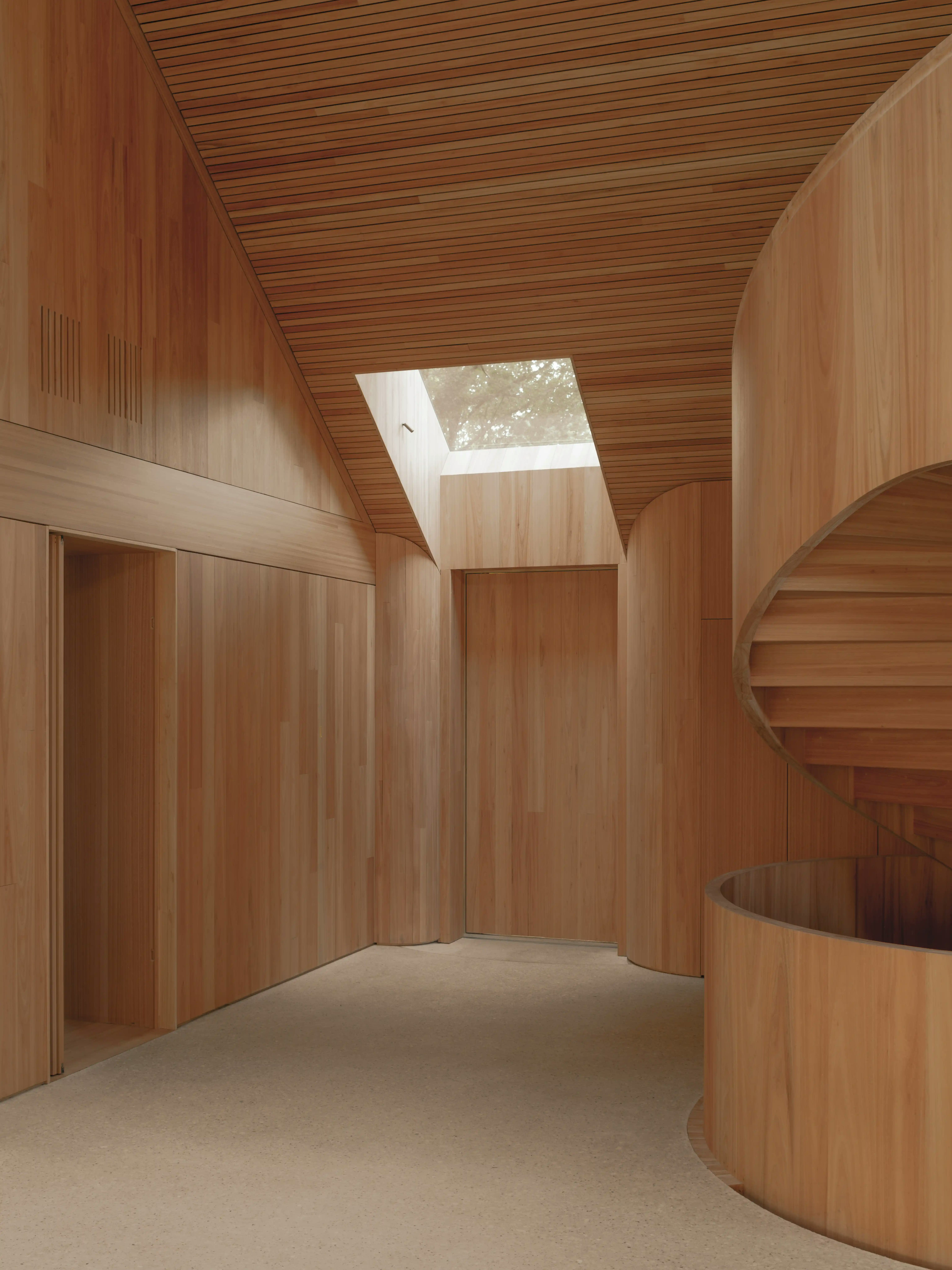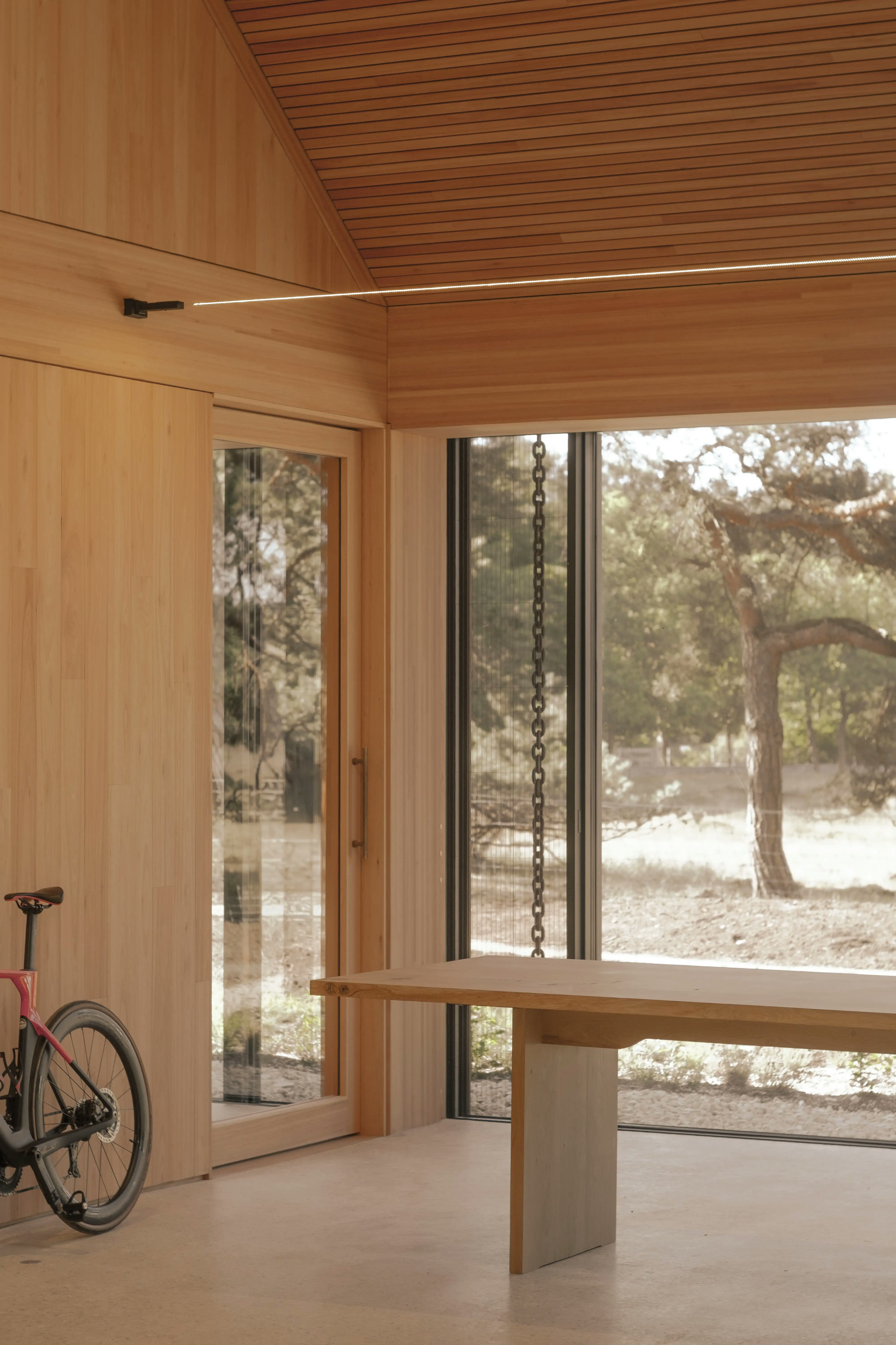 De gevels zijn bekleed met populierenbast, aangebracht in korte segmenten die een tactiel oppervlak vormen. De draagconstructie bestaat uit gelamineerde houten kolommen en liggers, aangevuld met CLT-wanden, vloeren en dakdelen. In het interieur zijn wanden, plafonds, vaste meubelonderdelen en kozijnen uitgevoerd in Red Grandis. Ventilatiesleuven zijn direct in het hout gefreesd en blijven zichtbaar als onderdeel van de architectuur.