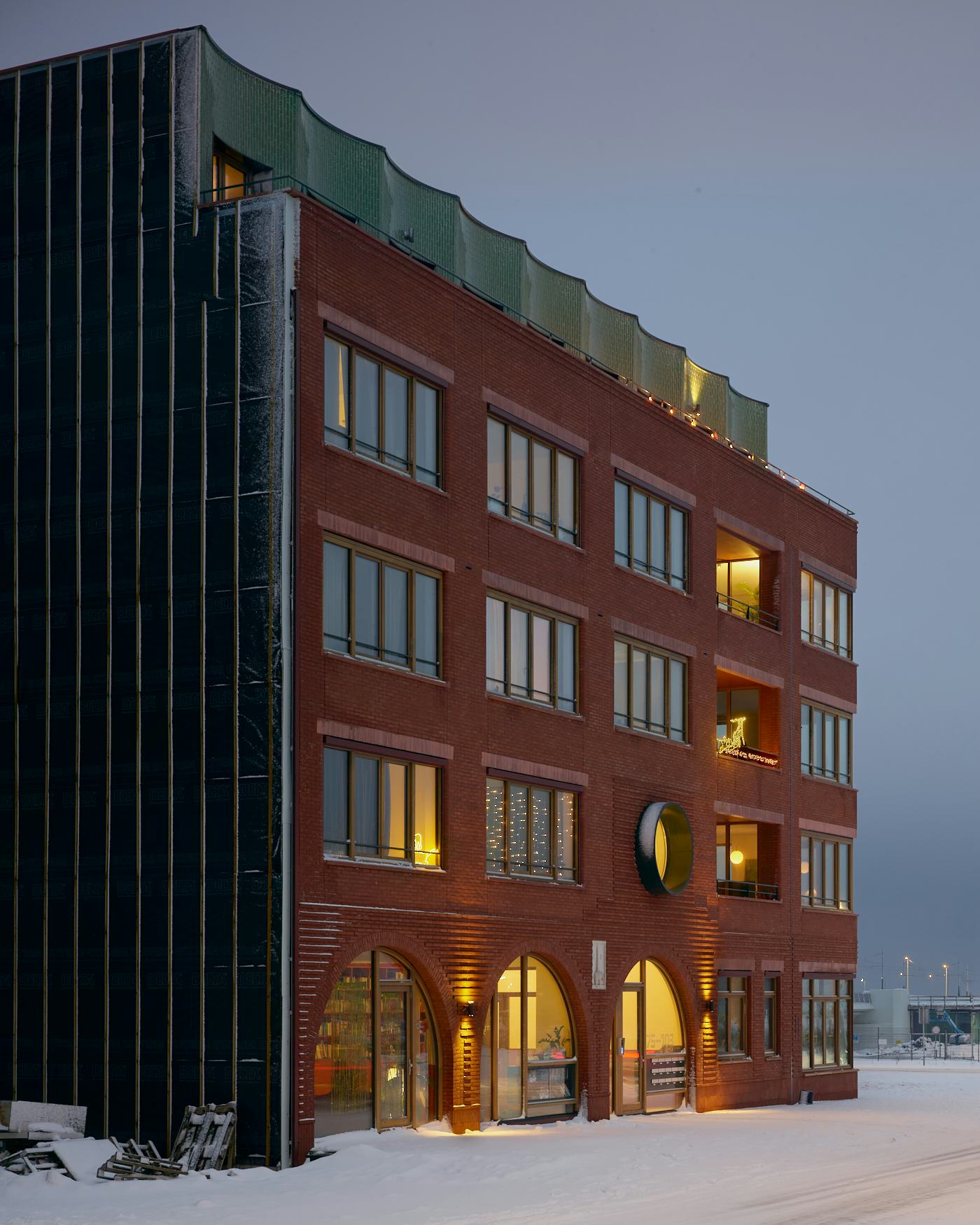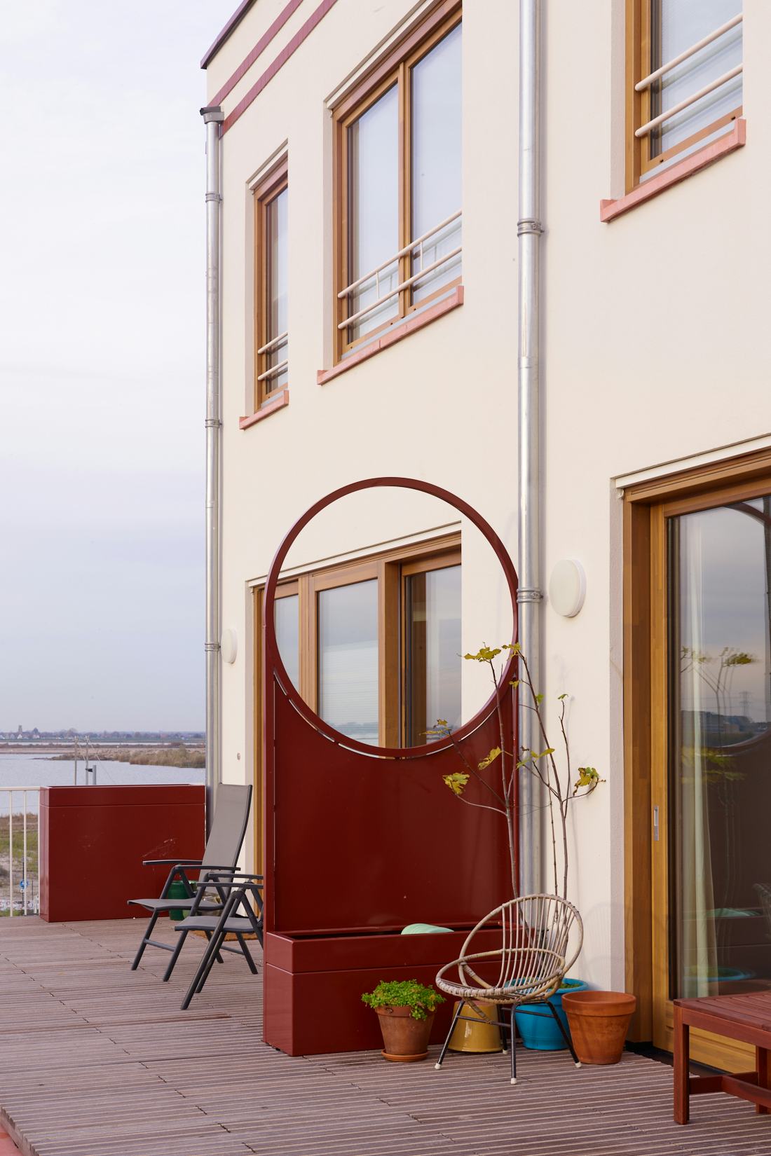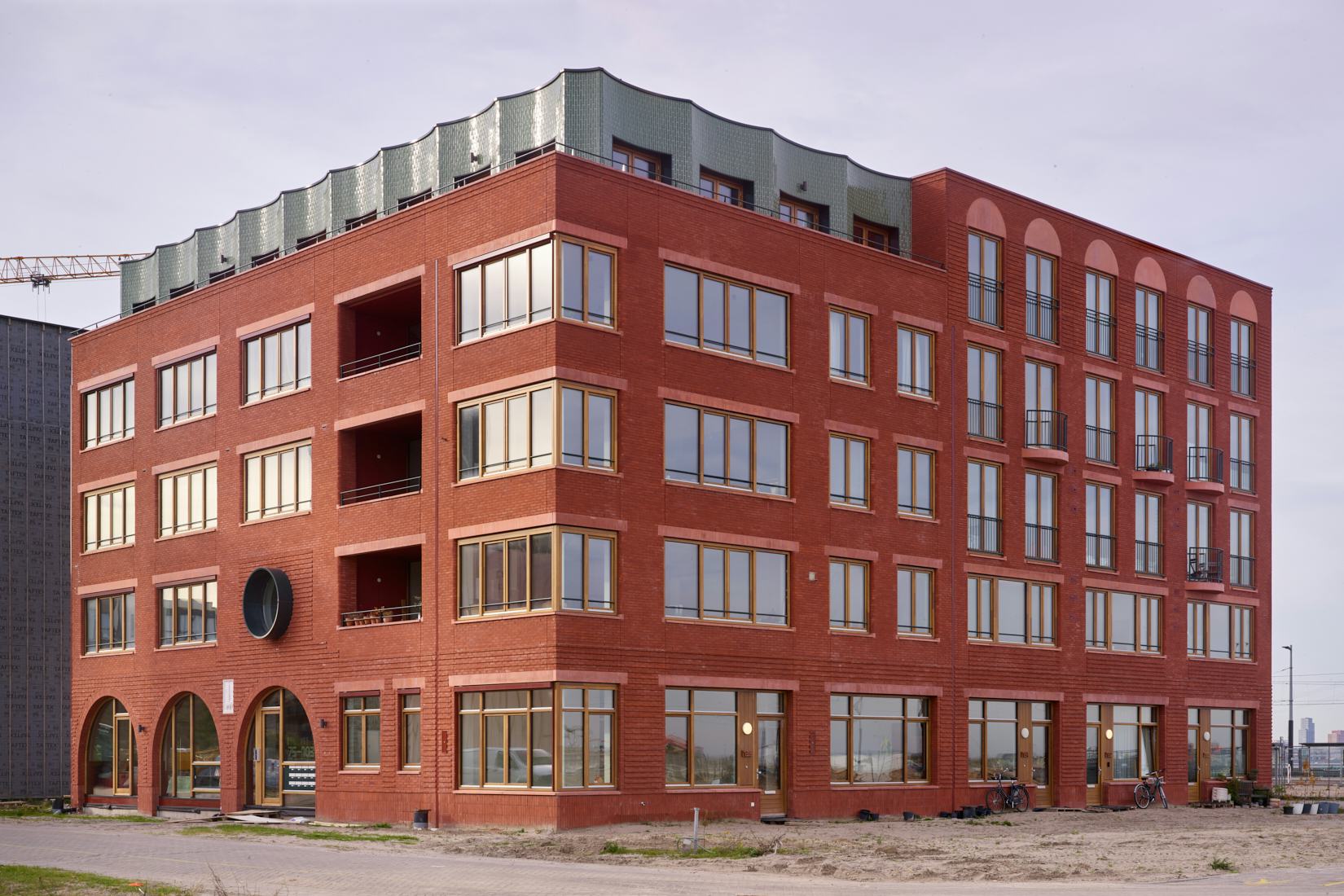 Het gebouw bevat achttien woningen van 60 tot 120 vierkante meter, een gemeenschappelijke ruimte op de begane grond met logeerkamer, een binnentuin met vijver en sauna, en een parkeergarage. De balkons zijn breed genoeg voor ontmoetingen; de cirkelvormige scheidingen tussen de woningen laten de grens tussen privé en gedeeld ruimtelijk open. Het gebouw is energieneutraal en regenbestendig. De gevel verwijst naar de Amsterdamse School met een opbouw uit plint, middenstuk en kroon, rode baksteen afgewisseld met betonnen elementen, en groen-geglazuurde tegels in de kroon. De kozijnen zijn van hout.