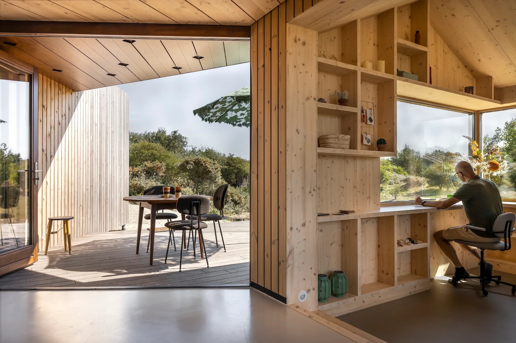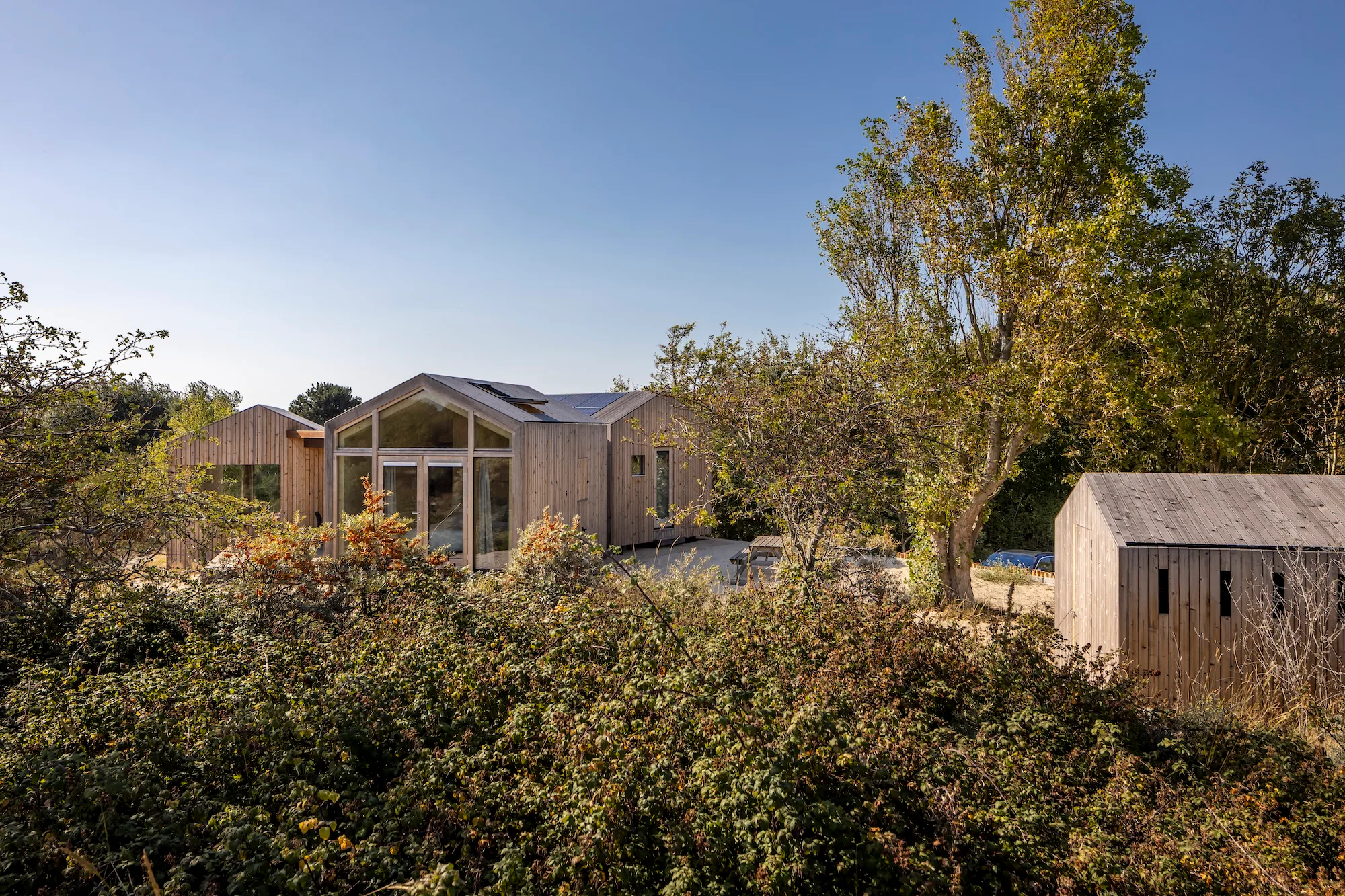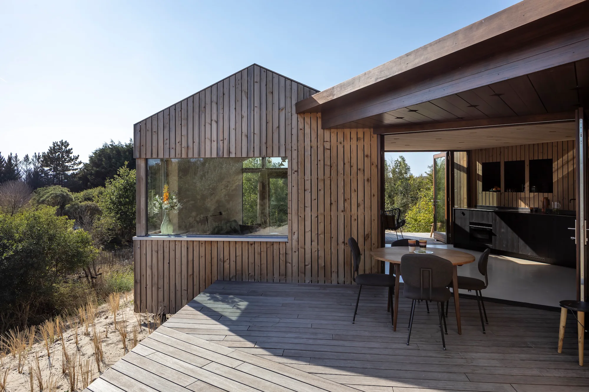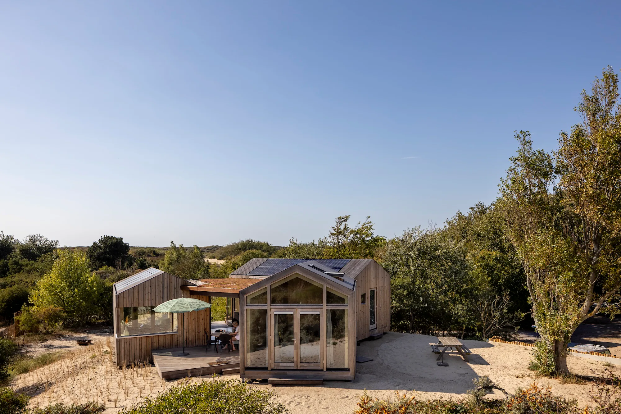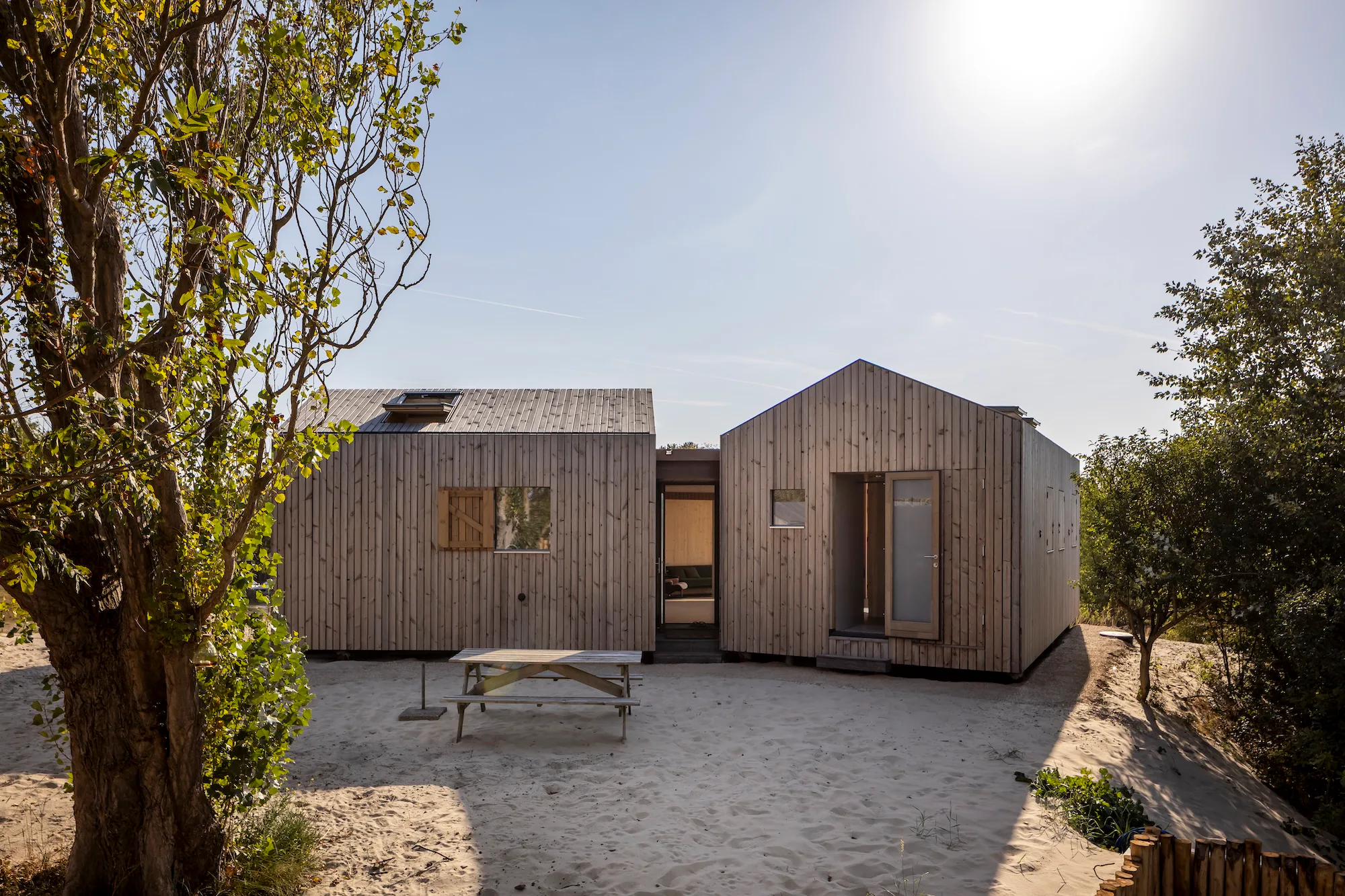 Het ontwerp bestaat uit drie losse bouwvolumes die op verschillende hoogtes aan een centrale keuken zijn geschakeld. Op die manier volgt het gebouw het hoogteverloop van de duin. De keuken fungeert als schakel tussen de drie volumes, met uitzicht naar twee zijden en openingen die het omgevingsgeluid naar binnen brengen. De kopse kanten van de huisjes zijn voorzien van glazen puien, elk met een eigen oriëntatie op het landschap. De positie van de volumes is bepaald op basis van uitzicht en bezonning: de hoofdslaapkamer bevindt zich boven op de duinrug en vangt het ochtendlicht, de woonkamer ligt lager en is gericht op de avondzon. Aan de noordzijde bevinden zich twee gastenkamers met bedsteden, een studeerkamer en een badkamer met een eigen toegang van buiten.