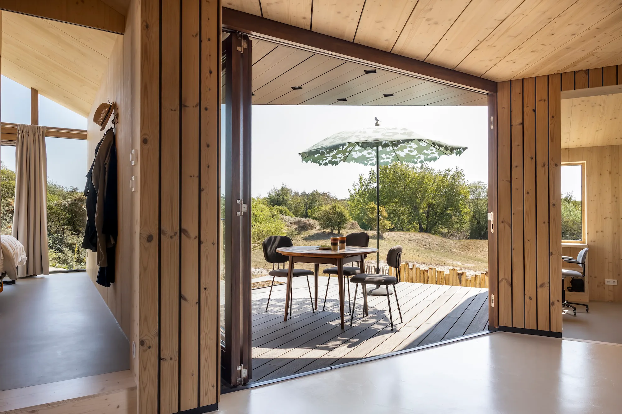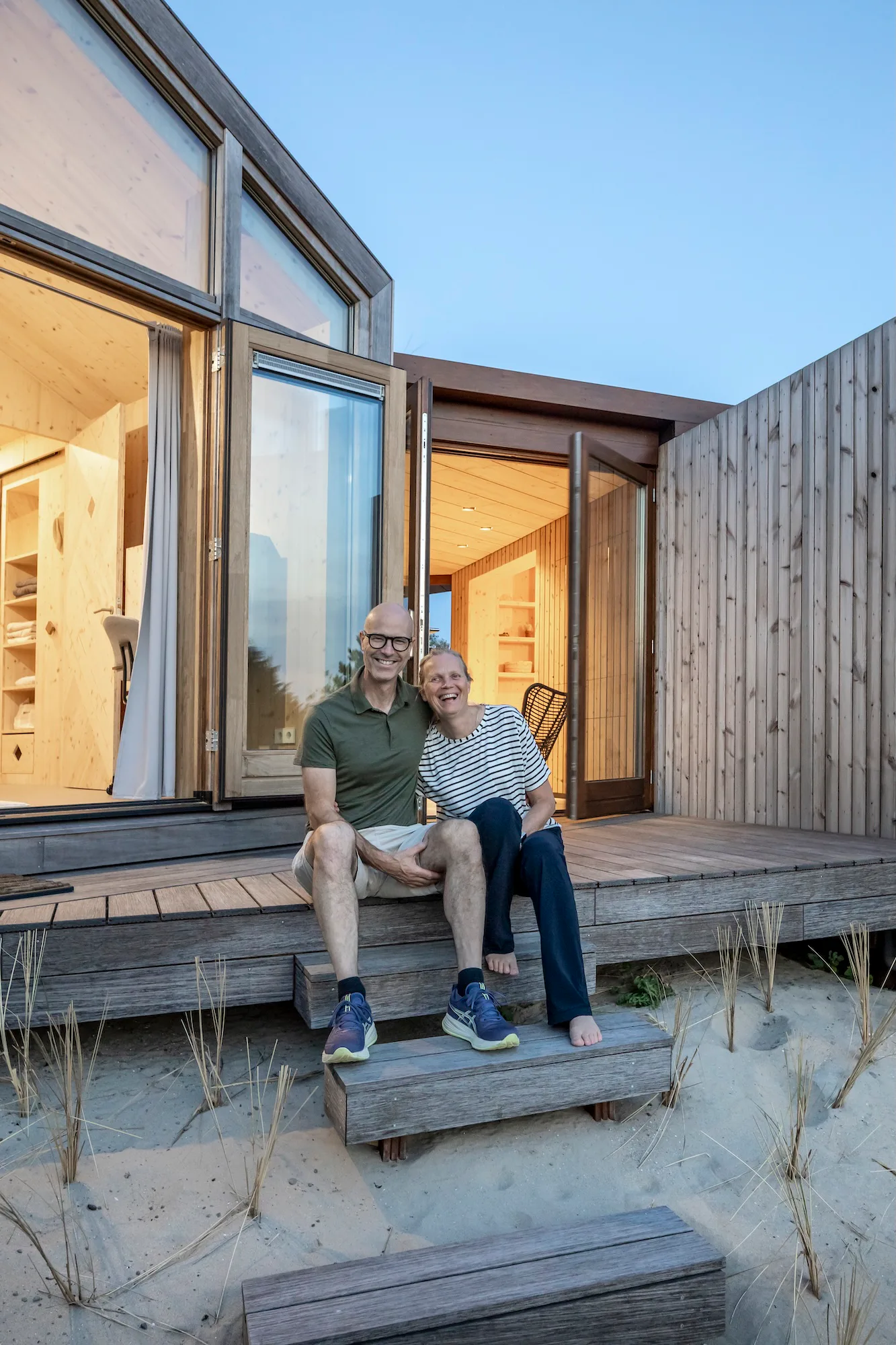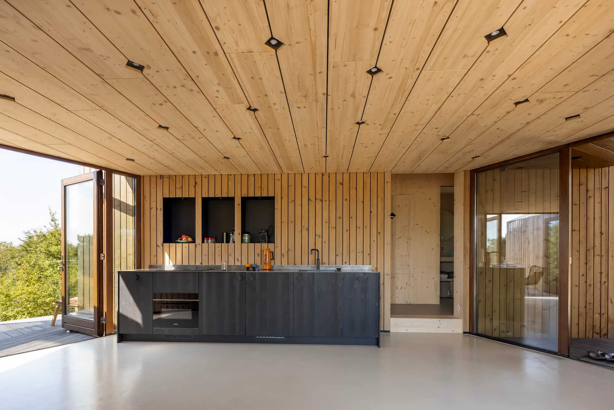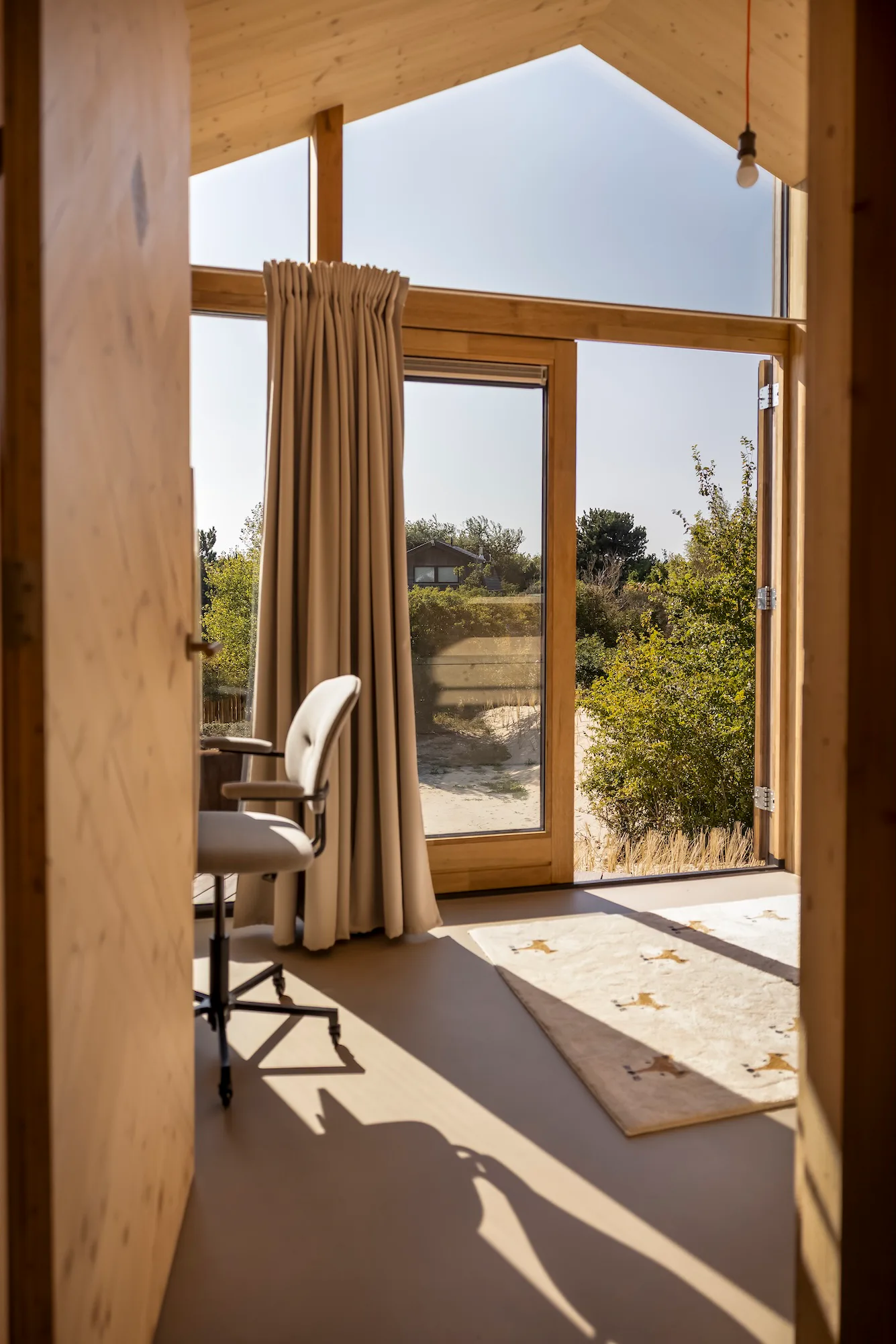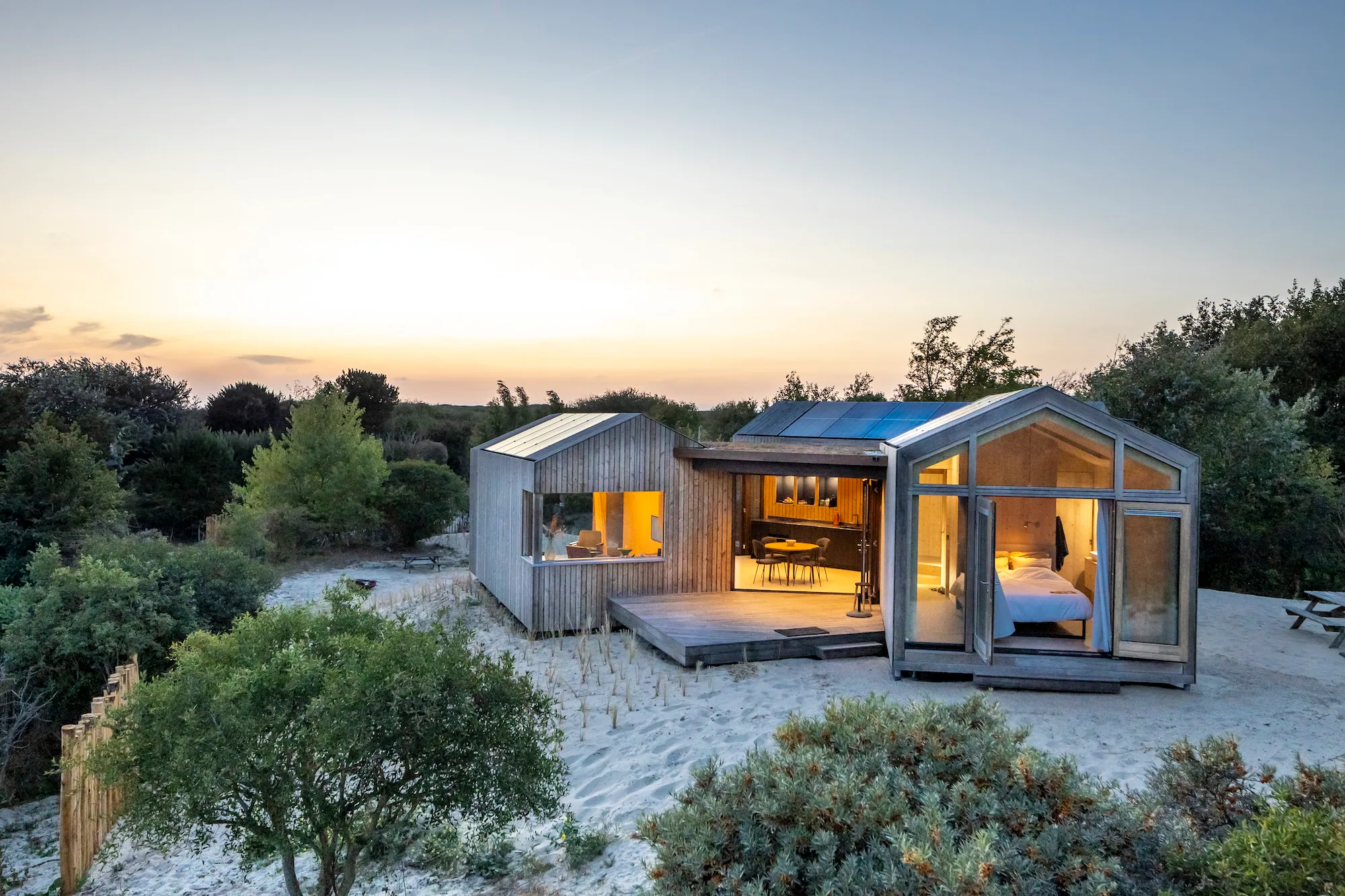 Het ontwerp bestaat uit drie losse bouwvolumes die op verschillende hoogtes aan een centrale keuken zijn geschakeld. Op die manier volgt het gebouw het hoogteverloop van de duin. De keuken fungeert als schakel tussen de drie volumes, met uitzicht naar twee zijden en openingen die het omgevingsgeluid naar binnen brengen. De kopse kanten van de huisjes zijn voorzien van glazen puien, elk met een eigen oriëntatie op het landschap. De positie van de volumes is bepaald op basis van uitzicht en bezonning: de hoofdslaapkamer bevindt zich boven op de duinrug en vangt het ochtendlicht, de woonkamer ligt lager en is gericht op de avondzon. Aan de noordzijde bevinden zich twee gastenkamers met bedsteden, een studeerkamer en een badkamer met een eigen toegang van buiten.