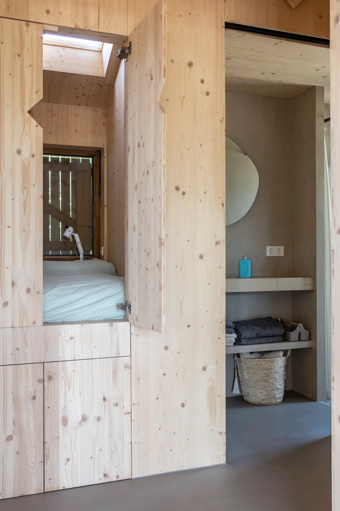 Voor de bouw werd gebruikgemaakt van een modulair bouwsysteem. De drie bouwdelen werden in de fabriek geproduceerd en in één dag wind- en waterdicht op locatie geplaatst. Interieuronderdelen zoals bedsteden, inbouwkasten en badkamers werden in de prefabfase afgewerkt. De opdrachtgevers en hun kinderen werkten mee in de loods, samen met bouwbedrijf Bouwpioniers. De heiwerken begonnen in september en de oplevering, inclusief alle interieurwerkzaamheden, volgde eind november.