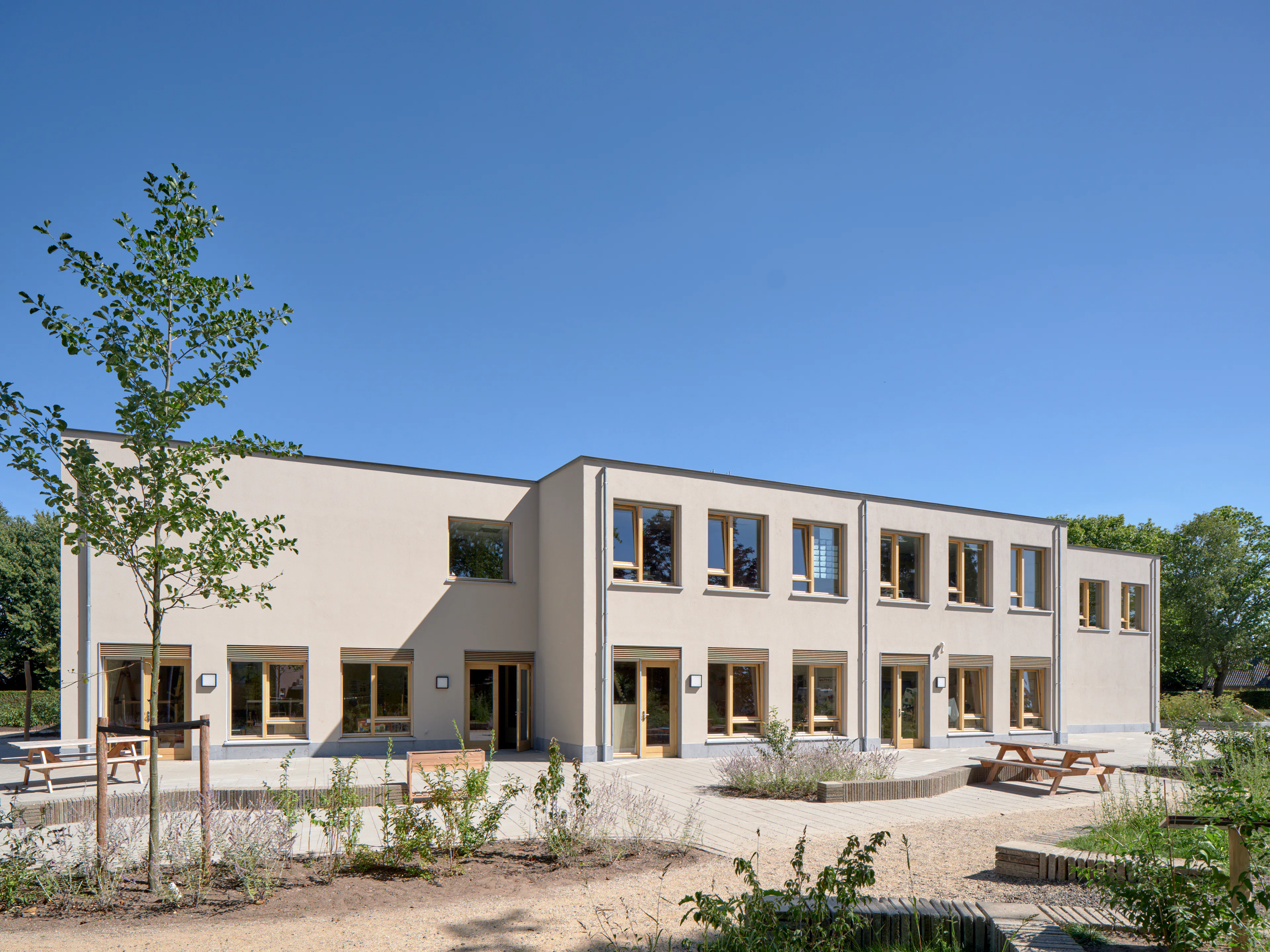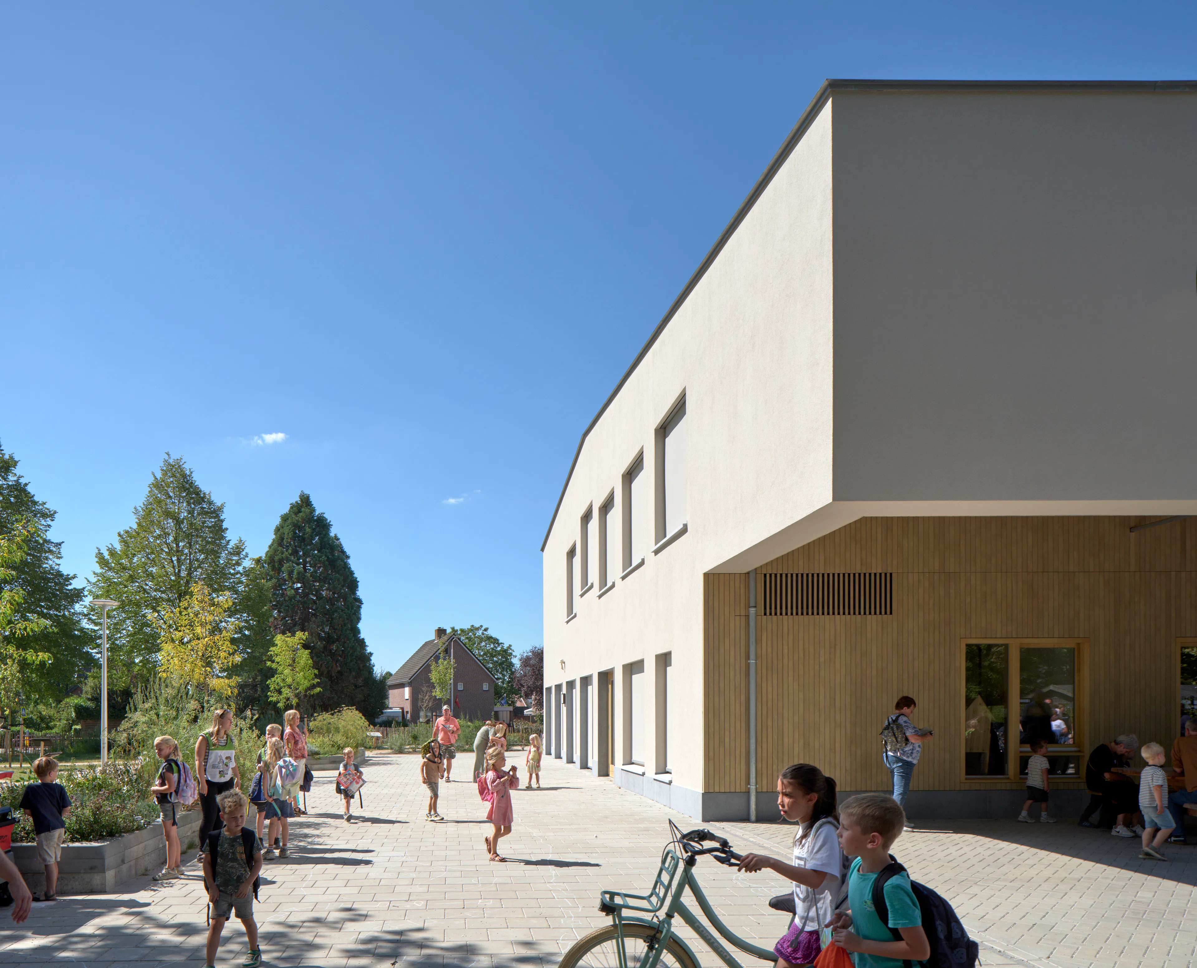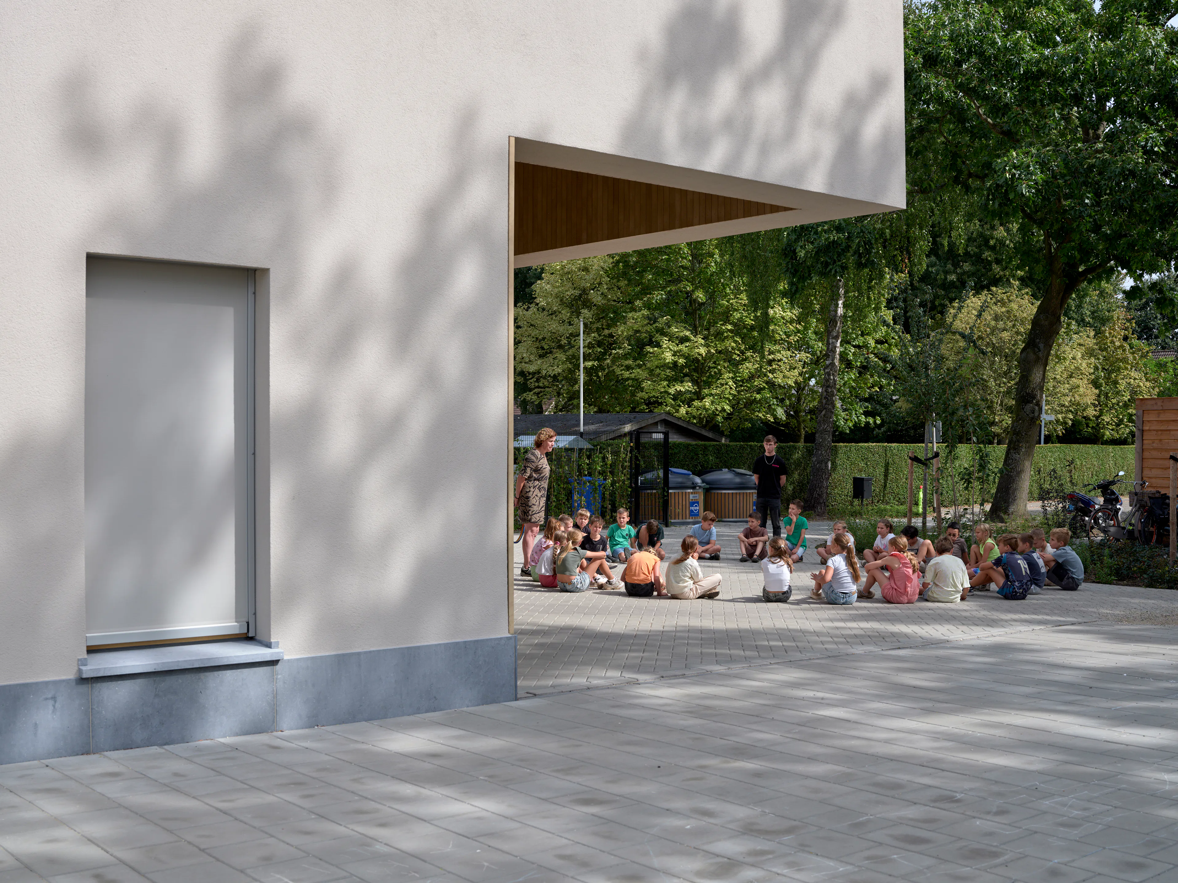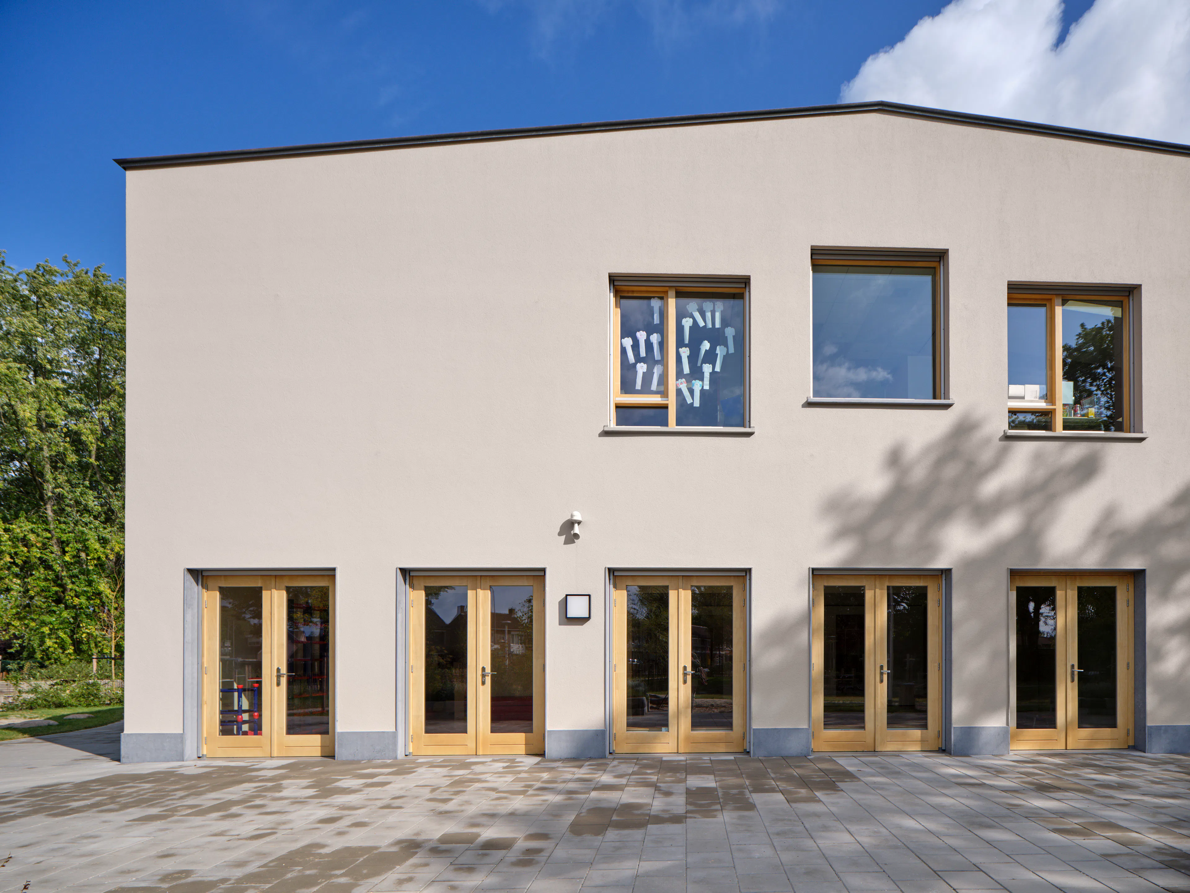 De gevel bestaat uit leemkleurig pleisterwerk met houten kozijnen in accoya. Zonwering in de kleur van de gevel en de vorm van het hellende dak geven het gebouw een positie naast de kerk als een gebouw met betekenis voor de gemeenschap. Het project is gerealiseerd tussen 2022 en 2024, met Archimedes als constructeur, Vintis als installatieadviseur, ZRi als adviseur voor bouwfysica, akoestiek en brandveiligheid, en VB Bouw als aannemer. Het programma omvat dertien klaslokalen, een speellokaal en ondersteunende functies.
