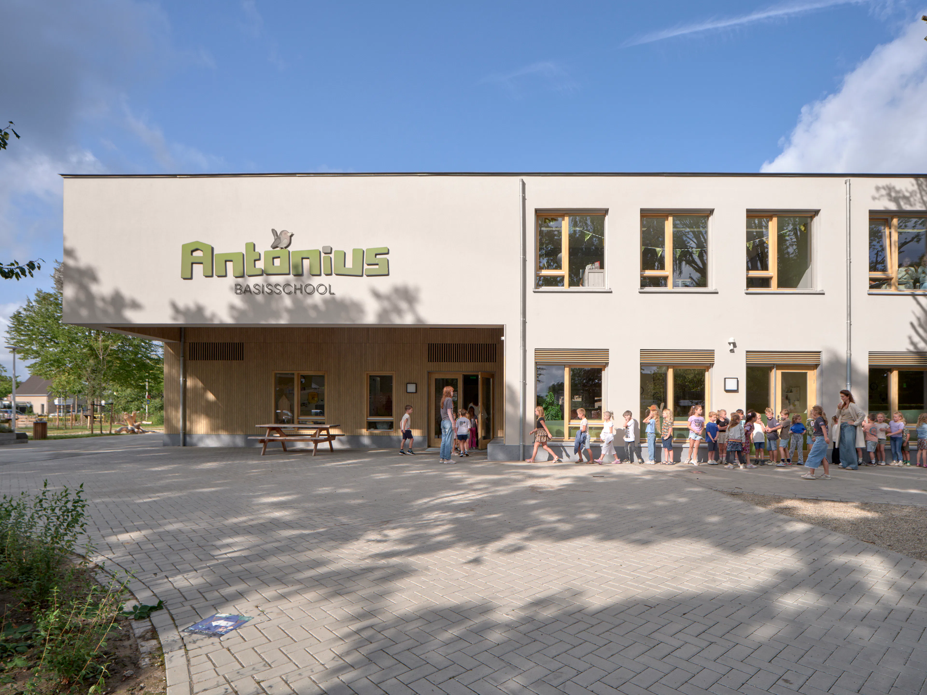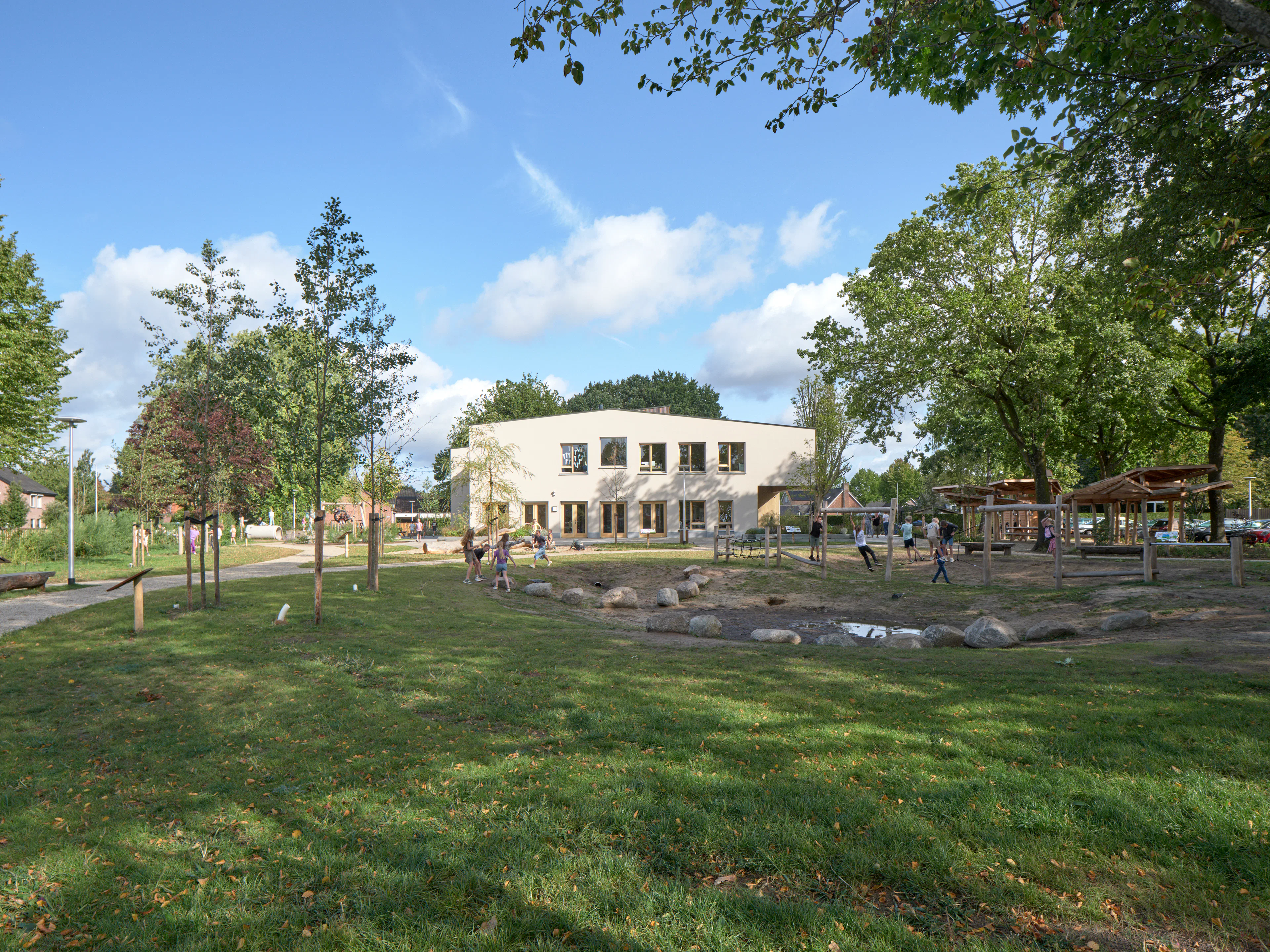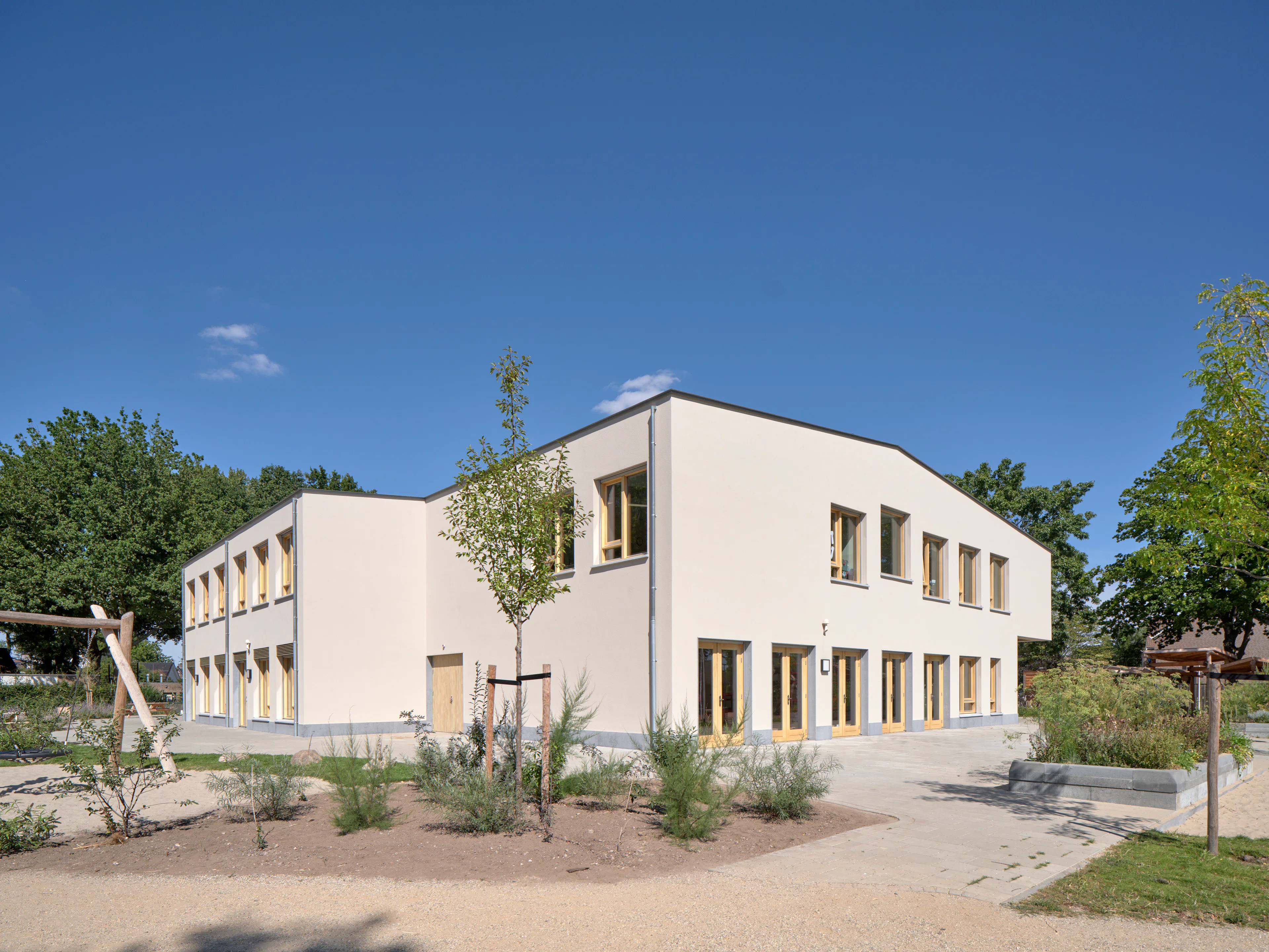 De gevel bestaat uit leemkleurig pleisterwerk met houten kozijnen in accoya. Zonwering in de kleur van de gevel en de vorm van het hellende dak geven het gebouw een positie naast de kerk als een gebouw met betekenis voor de gemeenschap. Het project is gerealiseerd tussen 2022 en 2024, met Archimedes als constructeur, Vintis als installatieadviseur, ZRi als adviseur voor bouwfysica, akoestiek en brandveiligheid, en VB Bouw als aannemer. Het programma omvat dertien klaslokalen, een speellokaal en ondersteunende functies.