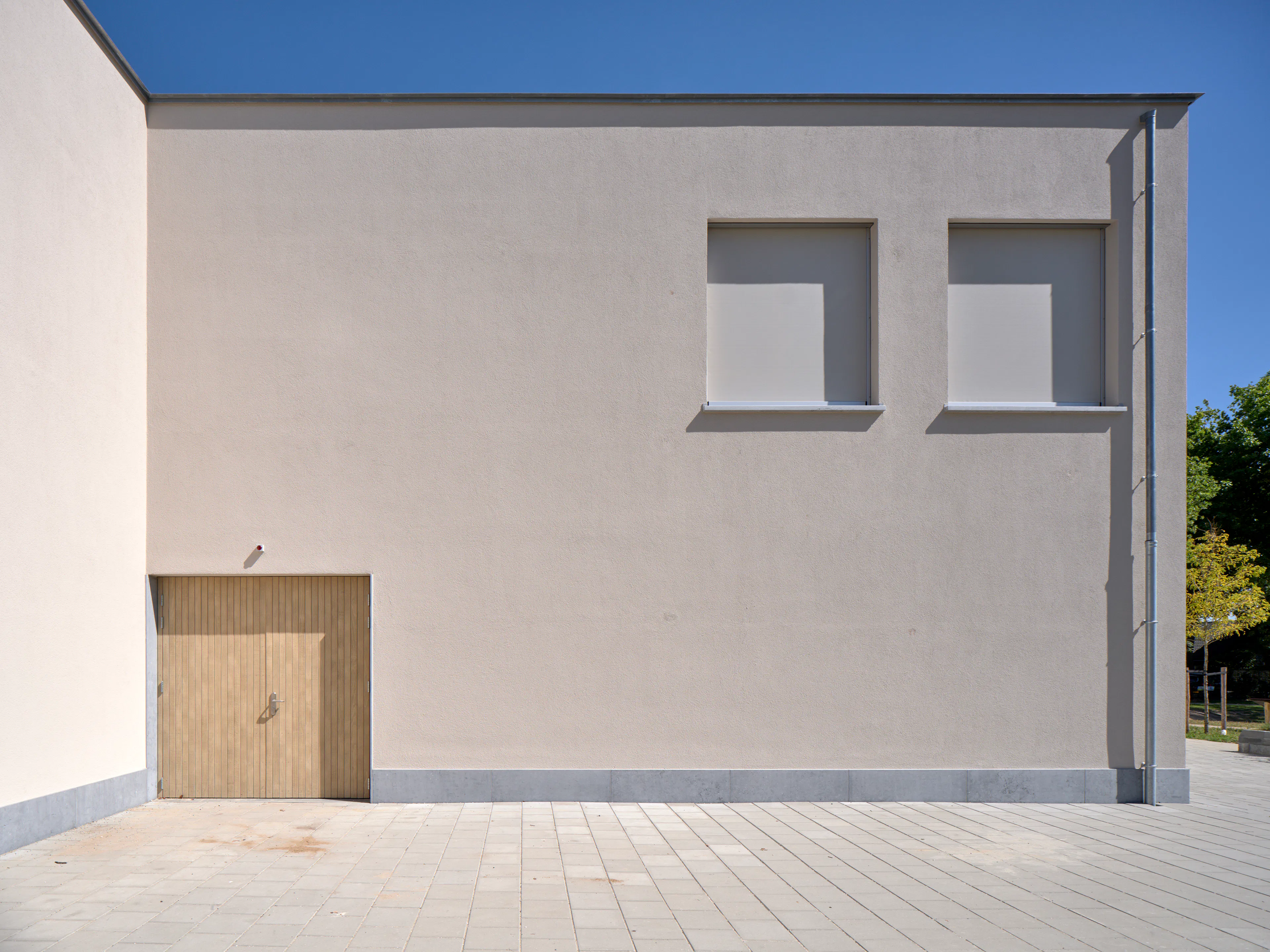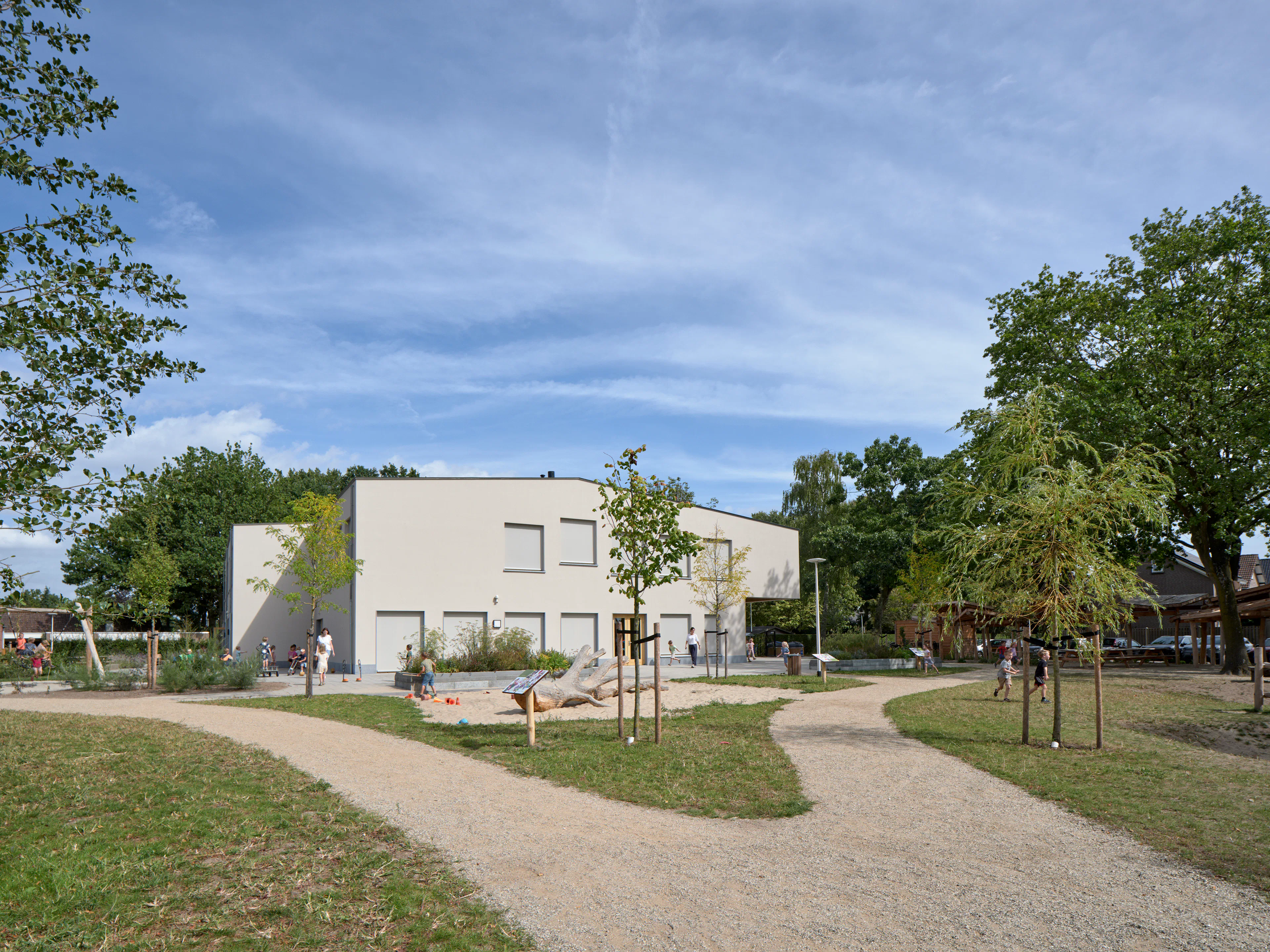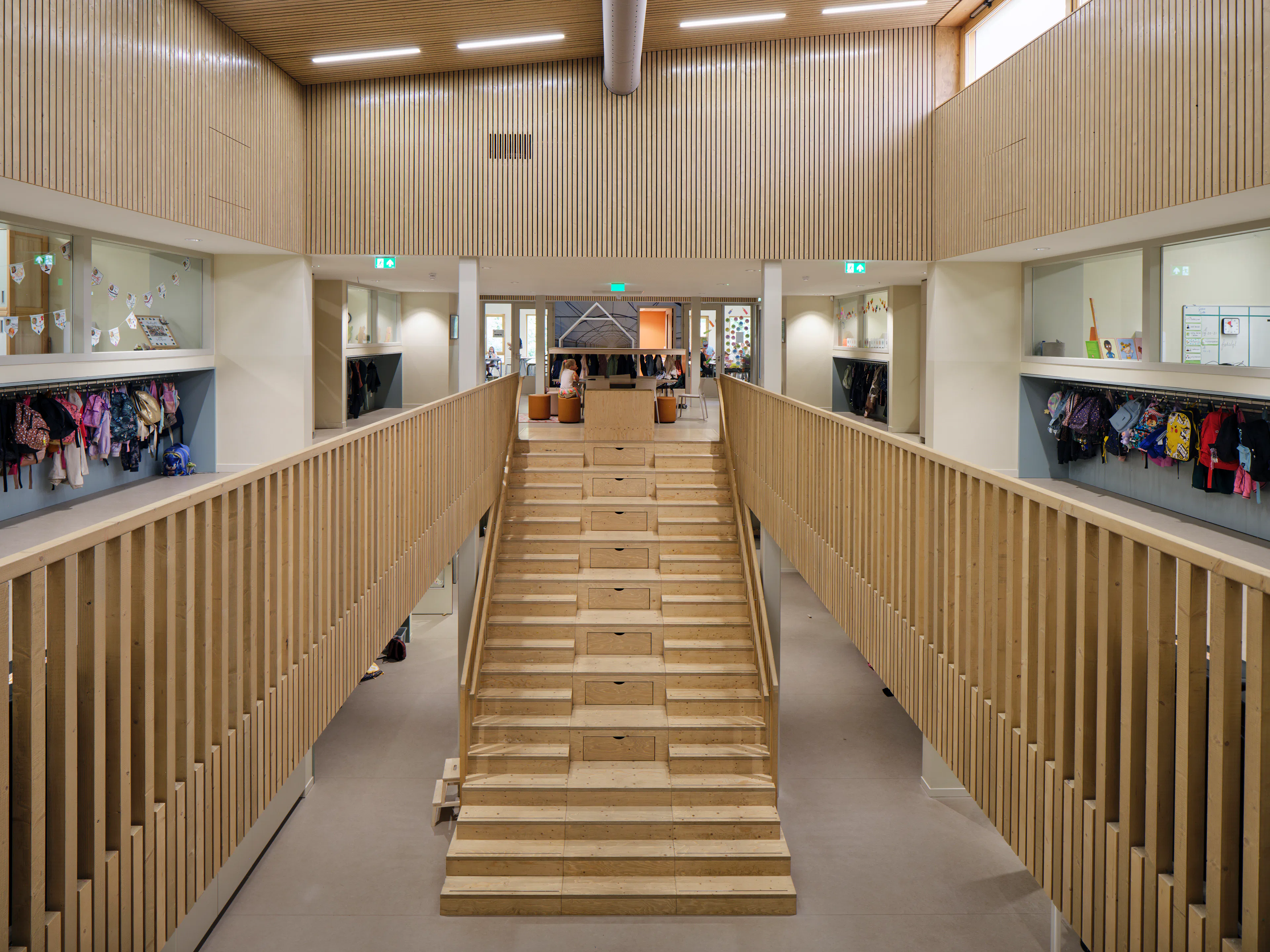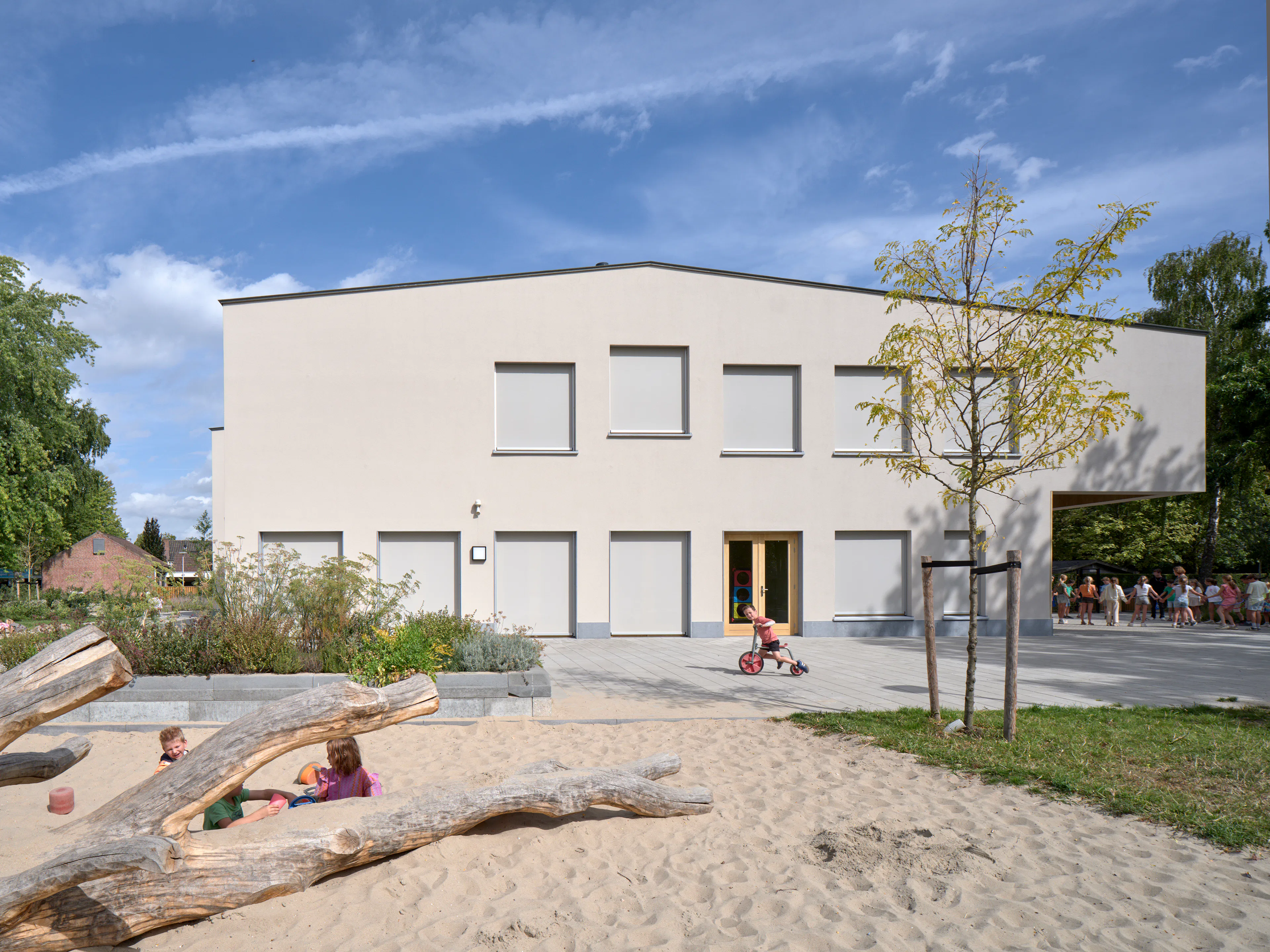 De gevel bestaat uit leemkleurig pleisterwerk met houten kozijnen in accoya. Zonwering in de kleur van de gevel en de vorm van het hellende dak geven het gebouw een positie naast de kerk als een gebouw met betekenis voor de gemeenschap. Het project is gerealiseerd tussen 2022 en 2024, met Archimedes als constructeur, Vintis als installatieadviseur, ZRi als adviseur voor bouwfysica, akoestiek en brandveiligheid, en VB Bouw als aannemer. Het programma omvat dertien klaslokalen, een speellokaal en ondersteunende functies.