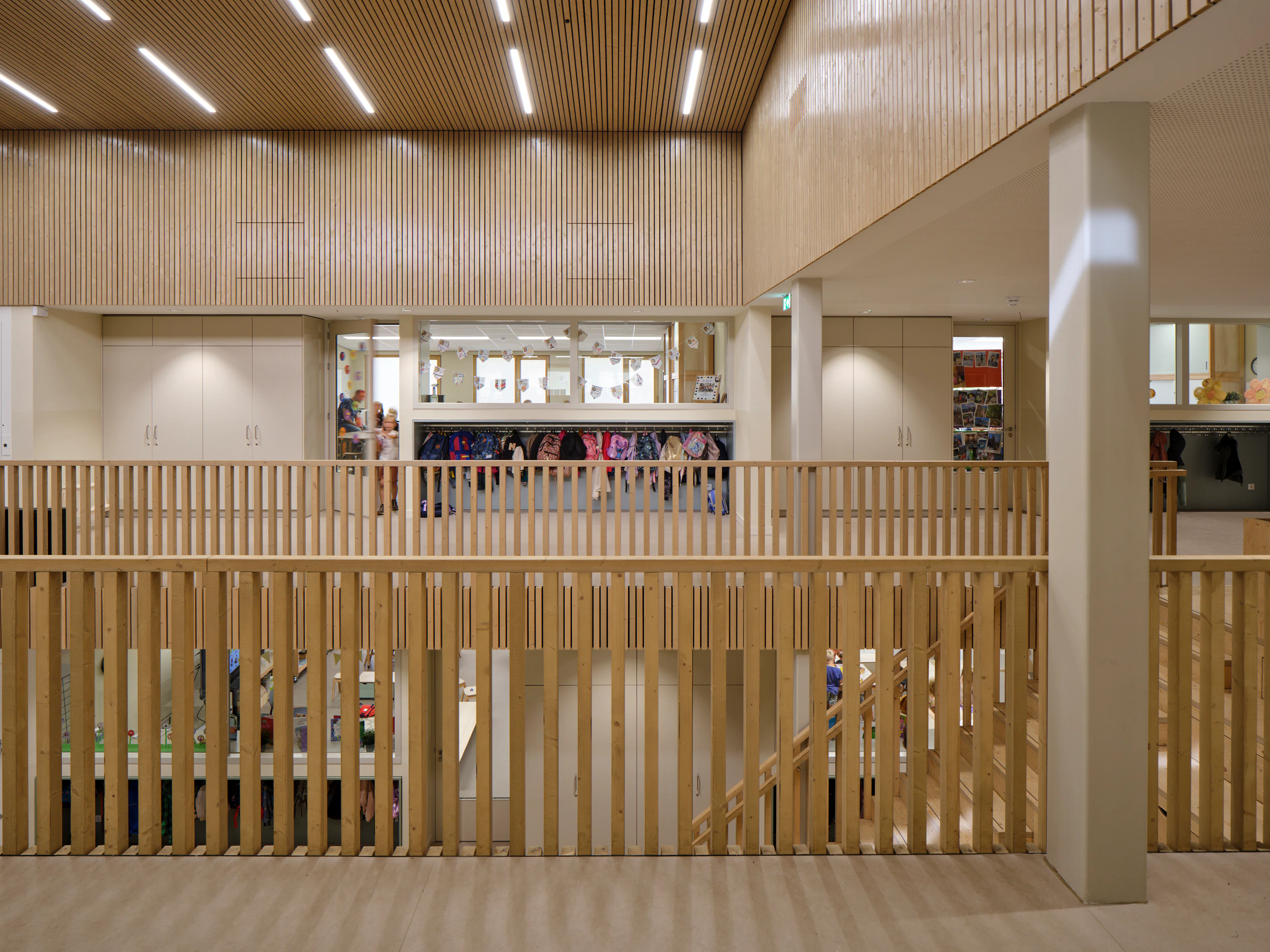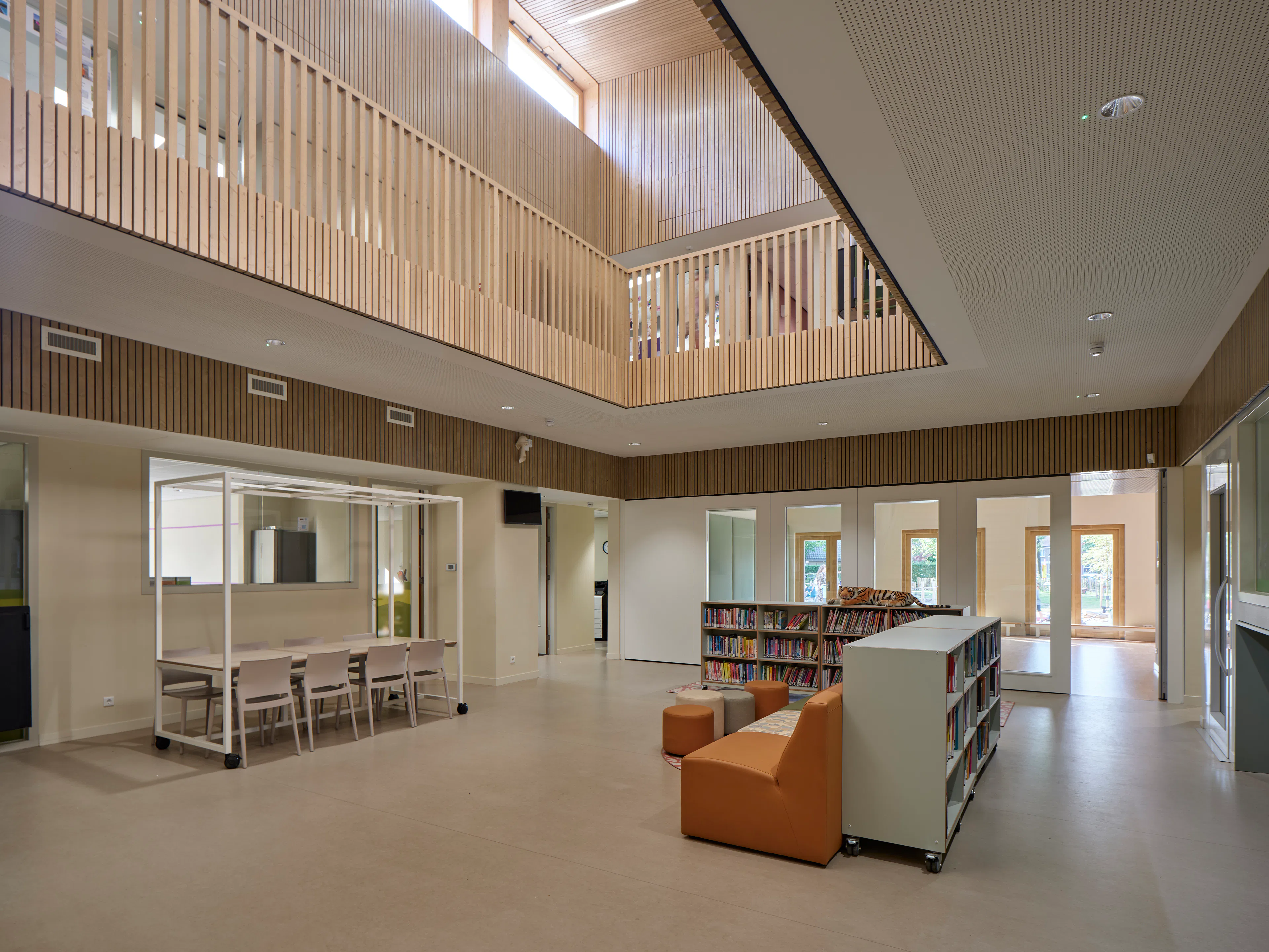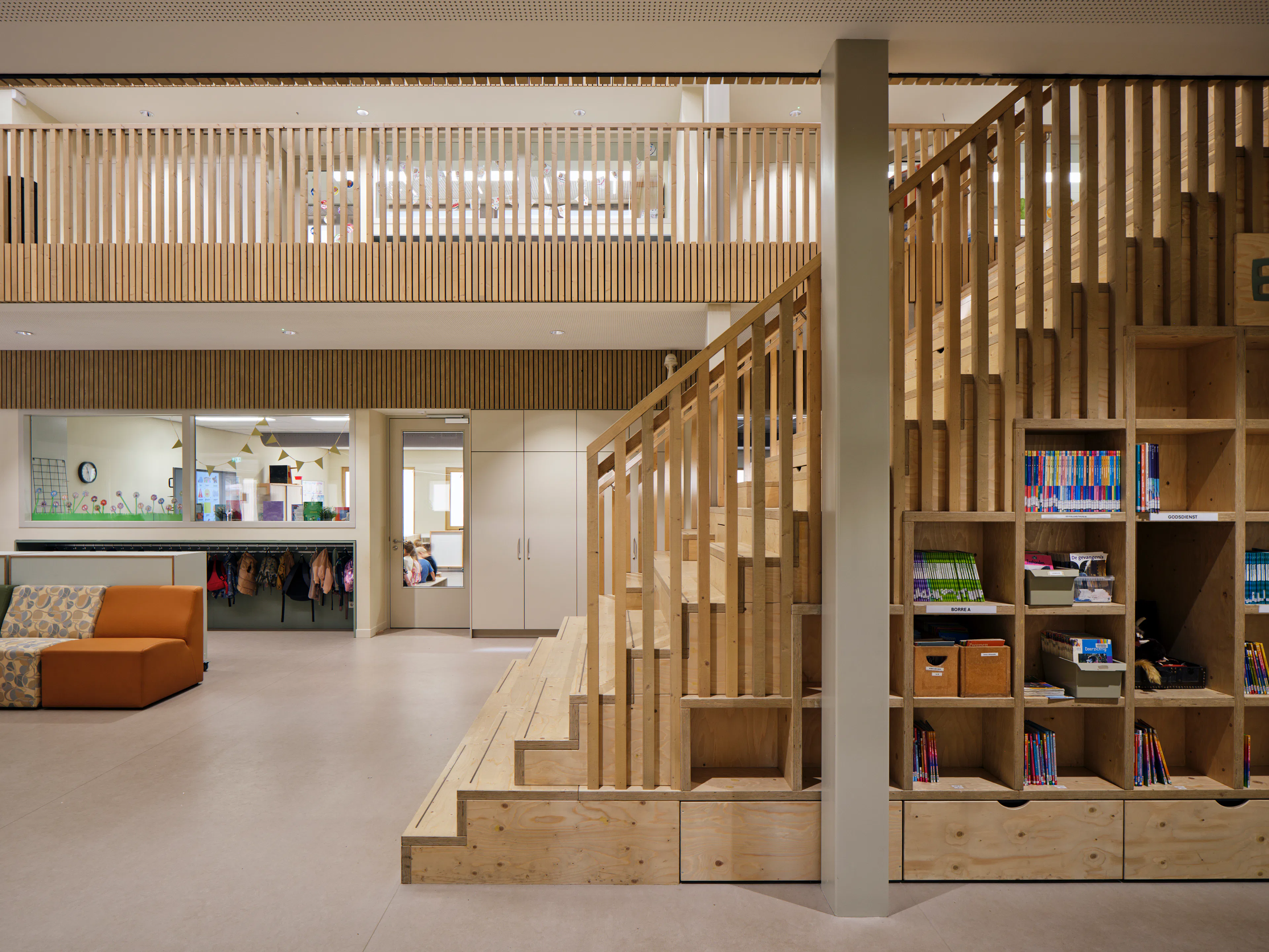 De speelzaal verbindt het hart van de school met het omringende park en kan worden samengevoegd met de aula tot één ruimte voor vieringen en bijeenkomsten. Het interieur is uitgevoerd in lichte, natuurlijke tonen met houten details, zodat leerlingen zelf kleur en invulling kunnen geven aan hun school. Aan de buitenkant zijn de entree herkenbaar door een insnijding in het kruismotief van de massa, en volgt de ritmiek van de vensters de organisatie van de klaslokalen.