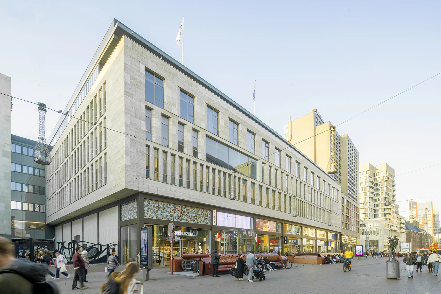 Het complex heeft een geschiedenis die teruggaat tot 1930, toen het oorspronkelijke deel aan het Spui werd geopend naar een ontwerp van architect Jan Kuijt in een overgangsstijl van de Amsterdamse School naar het zakelijk expressionisme. Dit rijksmonument heeft een interieur met marmeren accenten, houten lambriseringen en plafondcassettes met cannelures. In 1964 werd het pand uitgebreid met een zakelijker bouwdeel met open vloeren en paddenstoelkolommen. Na een verbouwing tot Hudson's Bay-vestiging in 2017 stond het pand na het faillissement van de keten in 2019 grotendeels leeg.