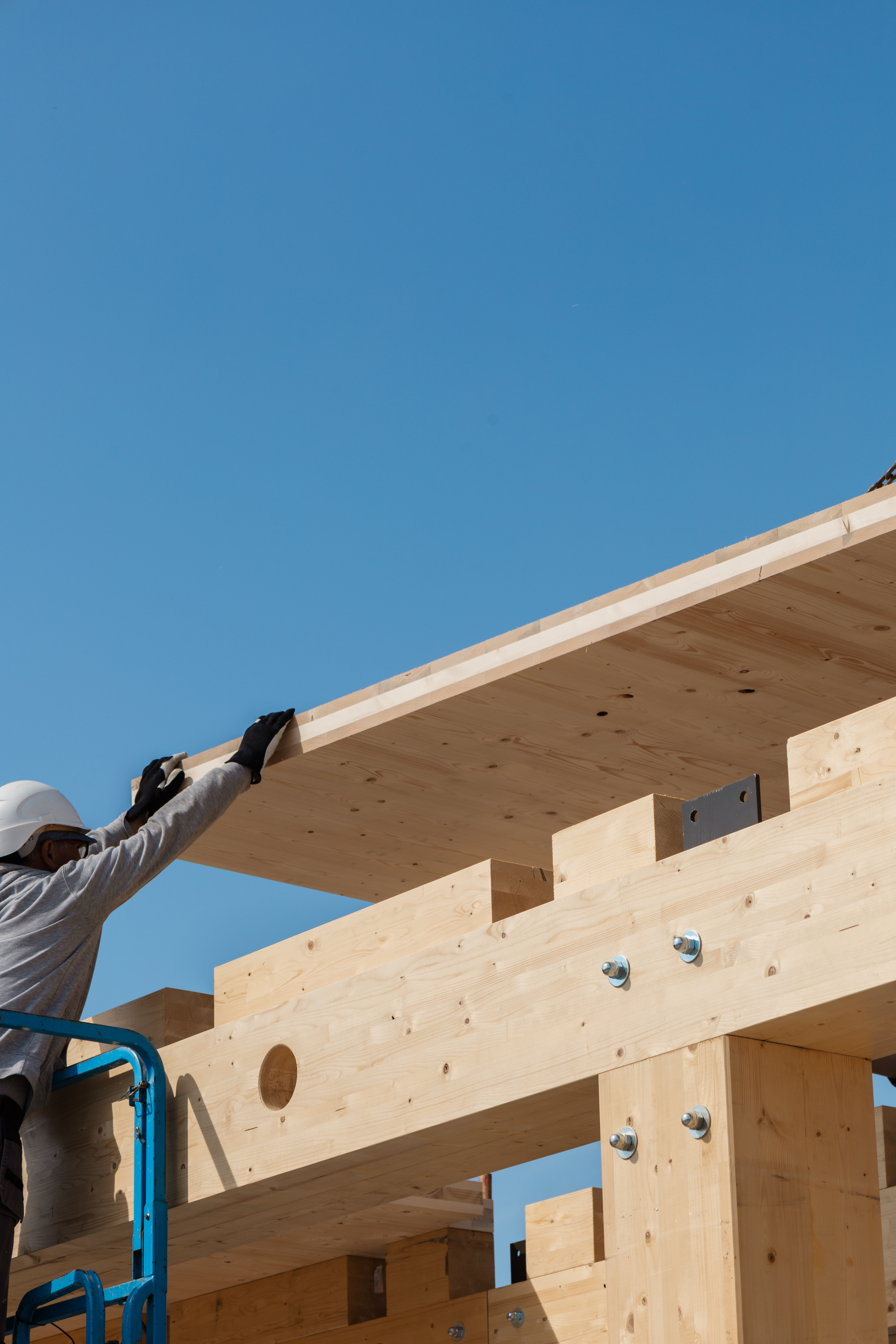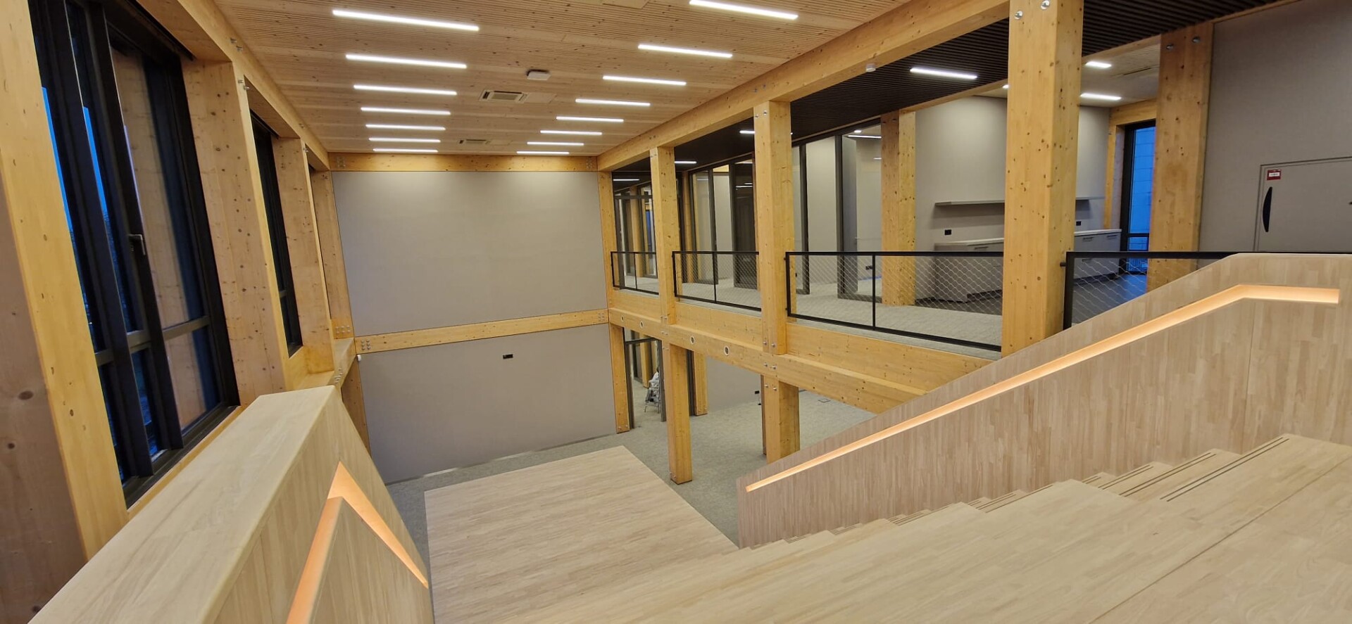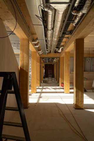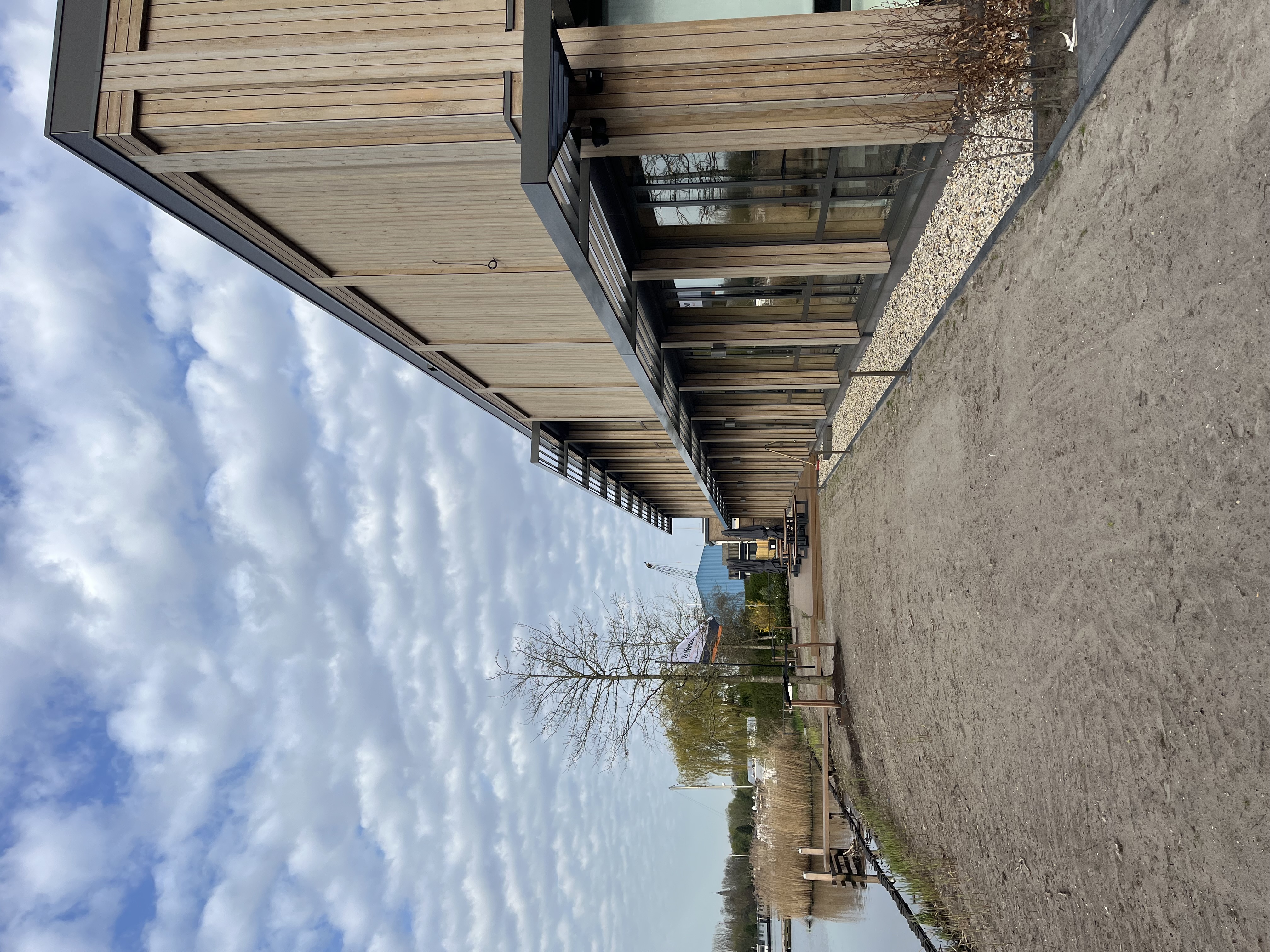 In het ontwerp is ervoor gekozen om zowel de houtconstructie als de houten vloeren zichtbaar te laten. ‘De gevel is afgewerkt met WaxedWood gevelbekleding, uitgevoerd met een equal weathering afwerking’, zegt Van Meeuwen. ‘In tegenstelling tot de natuurlijke vergrijzing, waarbij hout vaak onregelmatig grijs verkleurt door zon en regen, zorgt deze afwerking voor een gelijkmatige grijstint over het gehele oppervlak. De houten gevelbekleding is geleverd en volledig gemonteerd door Foreco Houtconstructies uit Noordeloos.’
