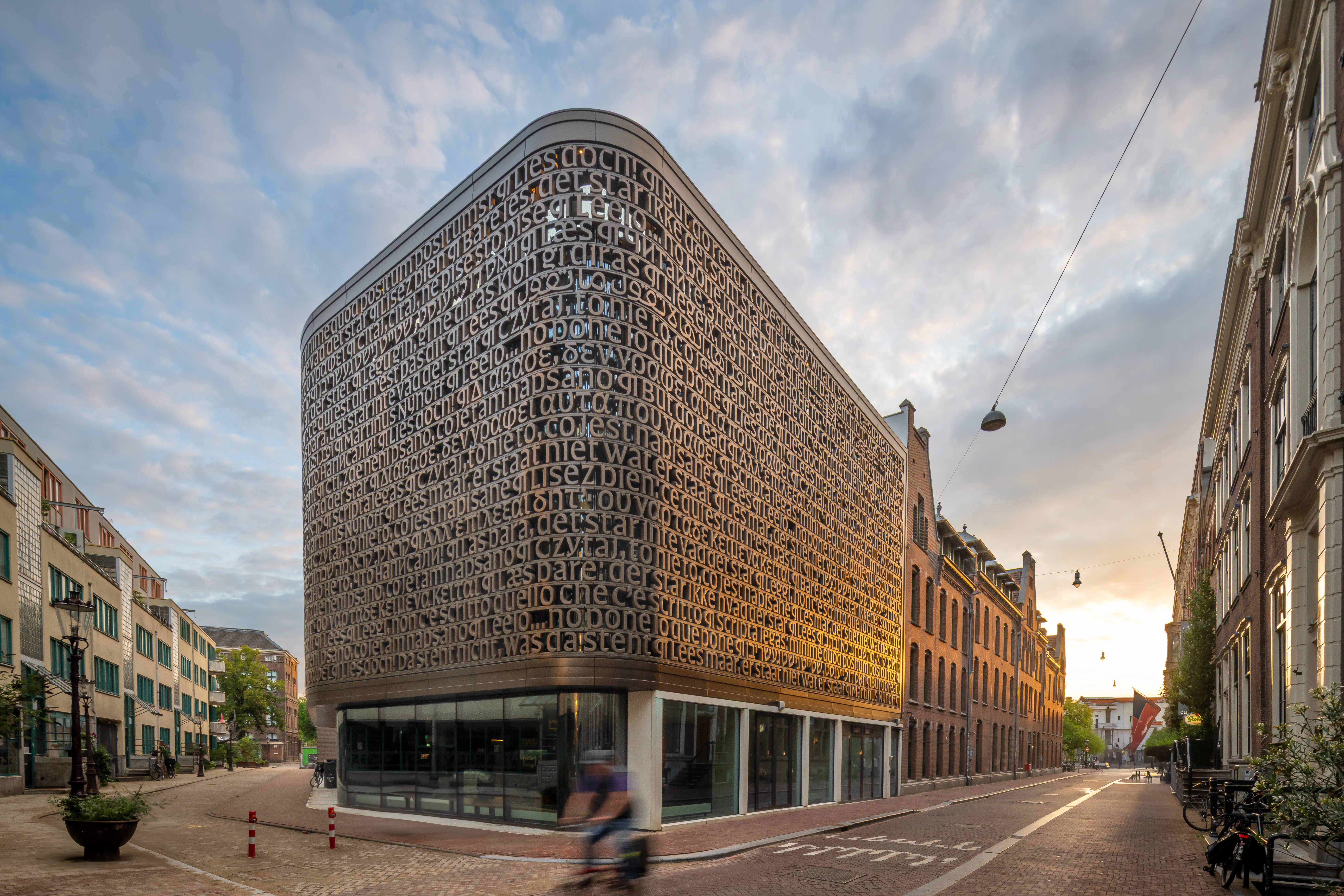De gevel van het nieuwbouwdeel bestaat uit een zin uit het gedicht Awater (1934) van Martinus Nijhoff, vertaald in de 24 talen en 6 schriften die aan de UvA worden onderwezen. De letters zijn ontworpen door typograaf Erik van Blokland, 3D geprint en in brons gecoat. Het gevelscherm staat voor de glazen gevel en fungeert als zonlichtfilter en privacyscherm. Het nieuwbouwdeel beslaat circa tien procent van het totale bouwvolume; het grootste deel betreft de renovatie en restauratie van de twee monumenten.
