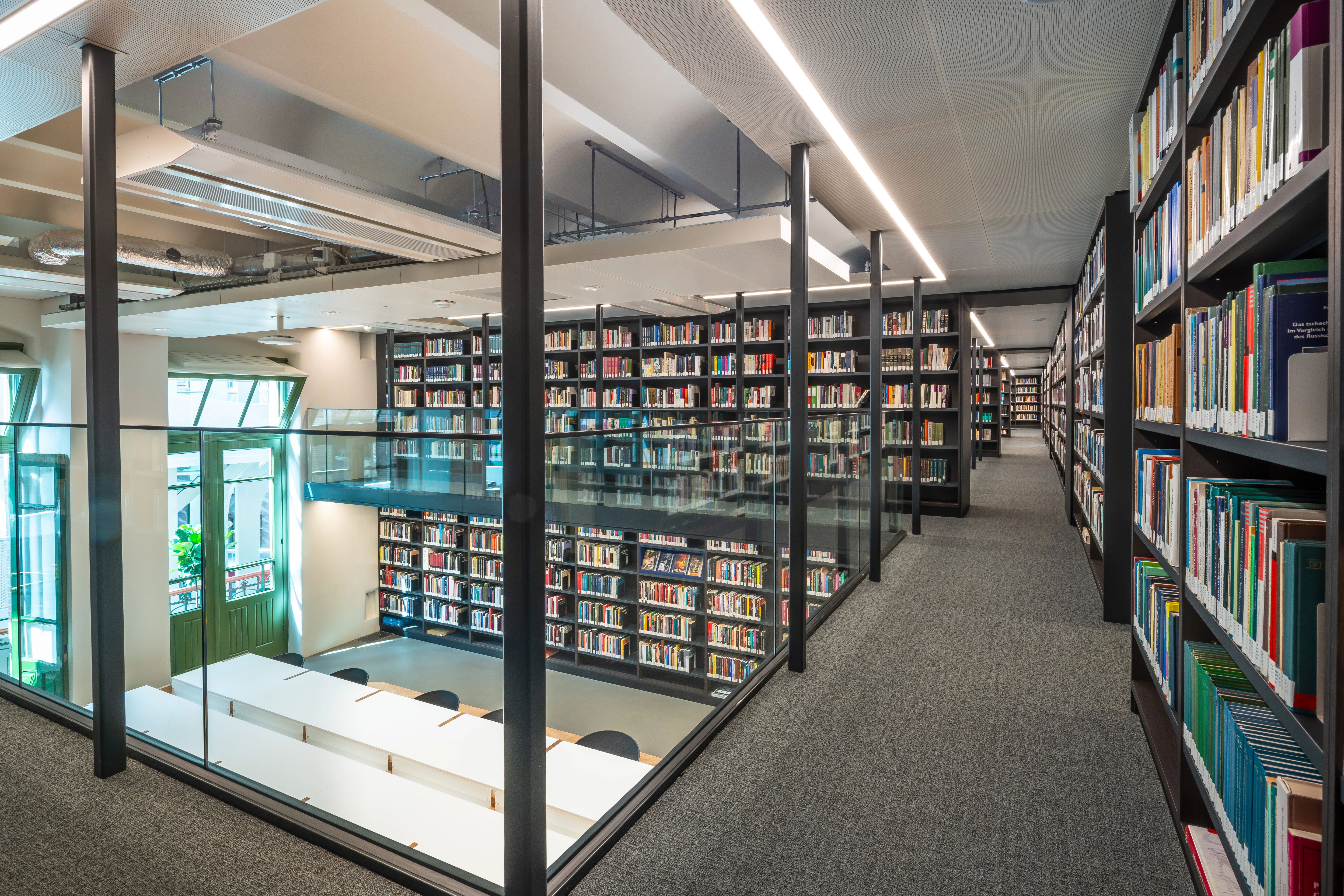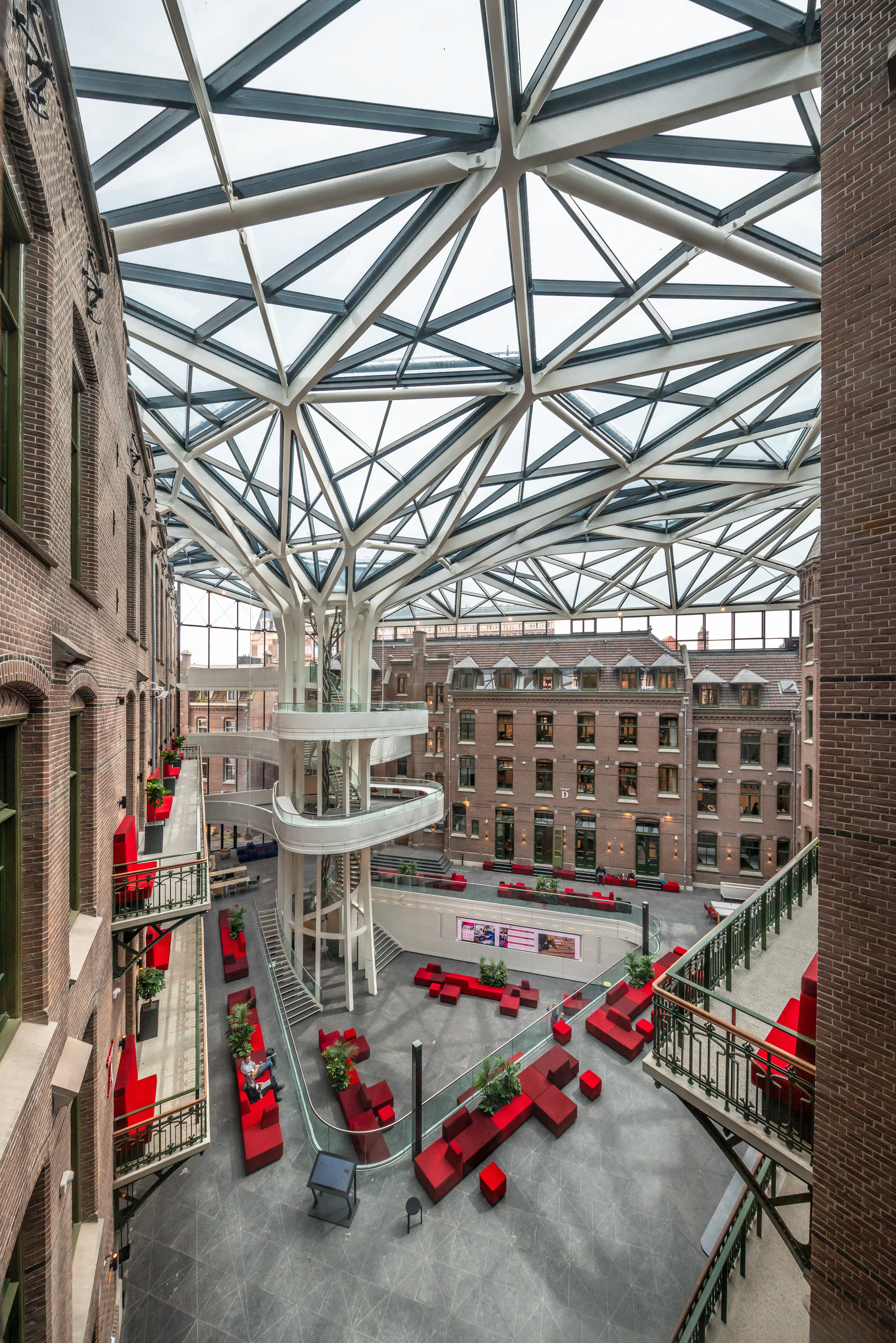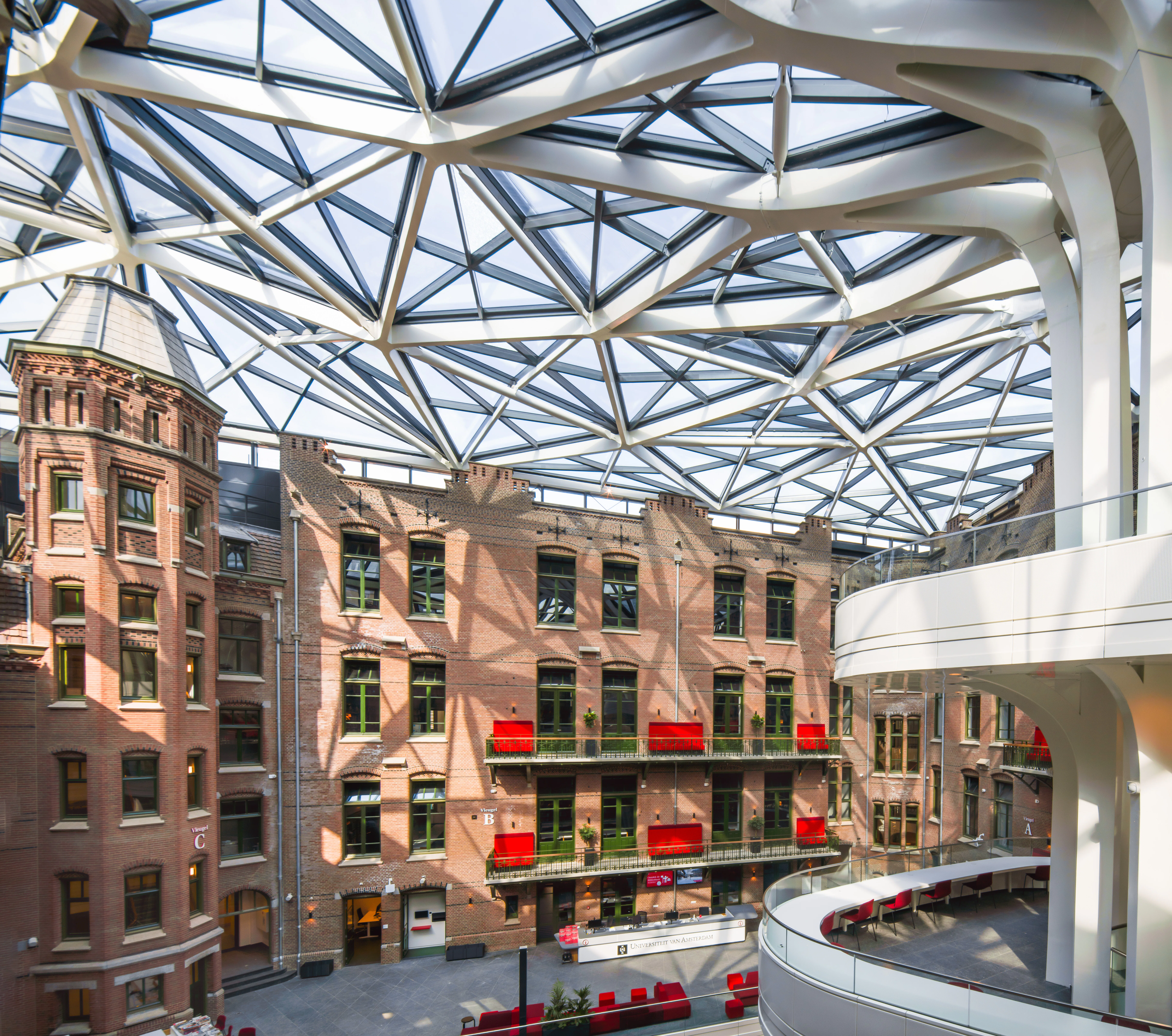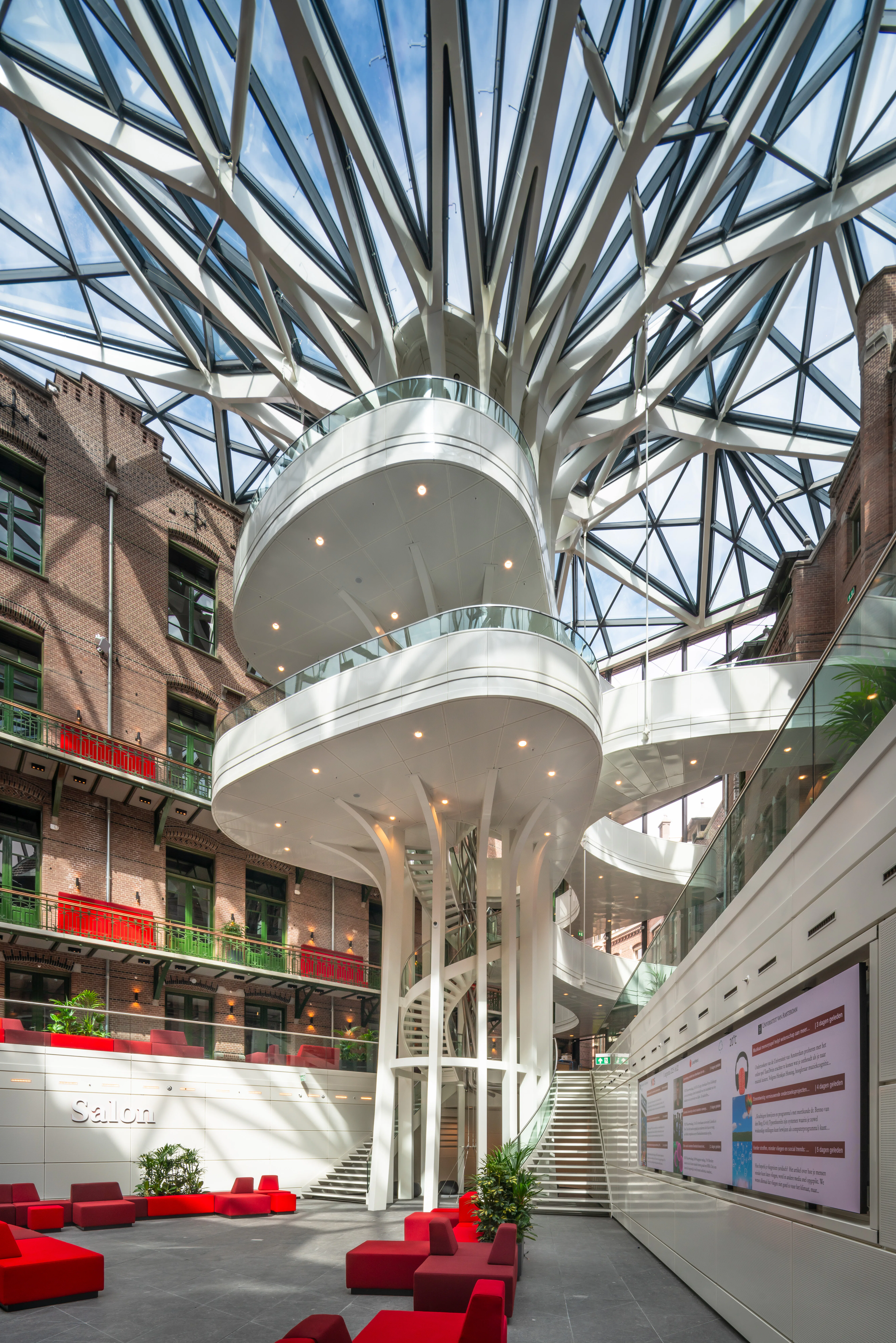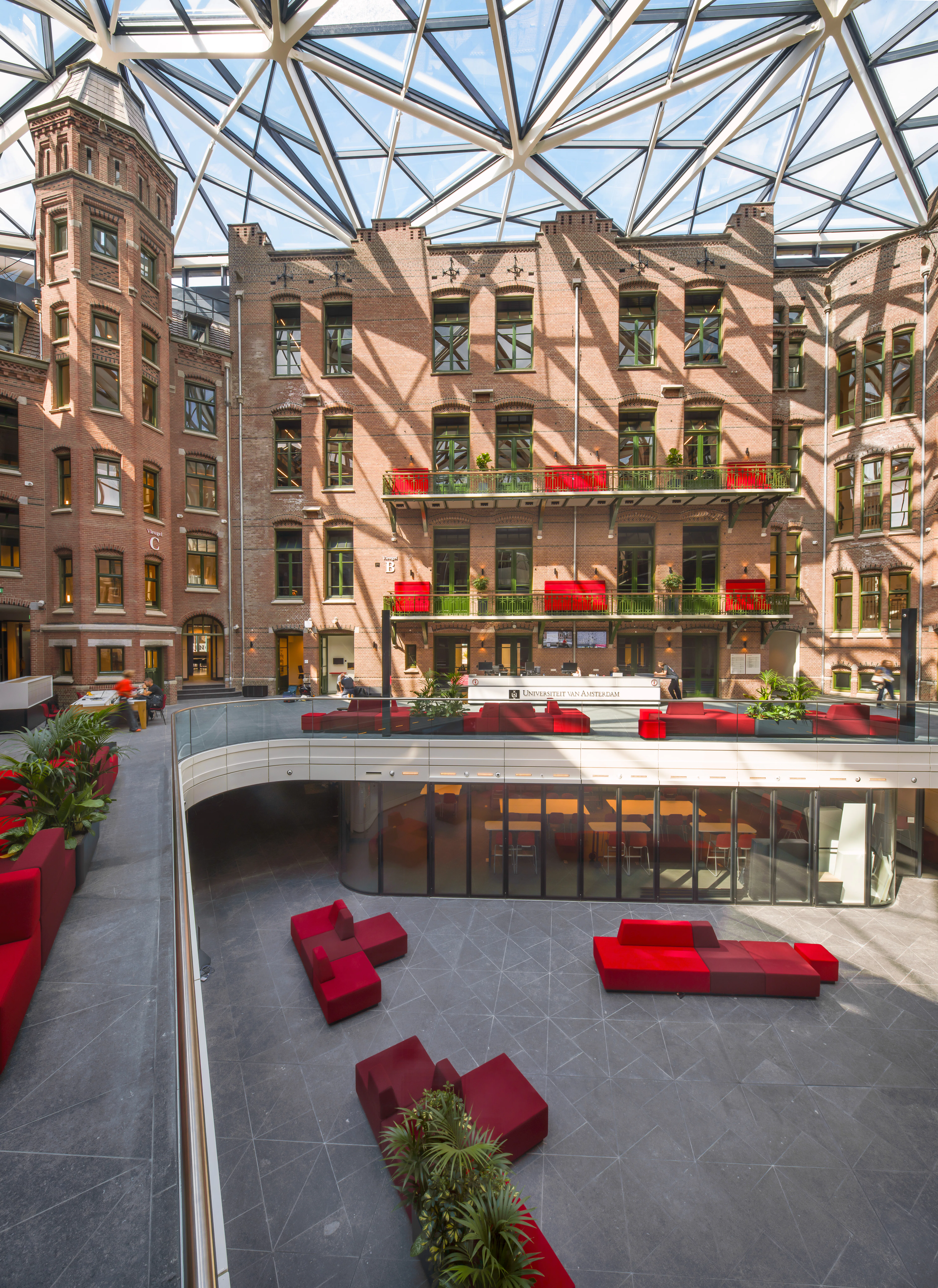 De kern van het vernieuwde complex is een overdekt atrium, dat de vroegere binnentuin beslaat. Het atrium wordt overkapt door een glazen dak, gedragen door een constructie van wit staal. Doordat deze constructie vrijstaat van de bestaande bebouwing, hoefden er geen zware ingrepen in de monumentale oudbouw te worden gedaan. In het atrium bevinden zich een infobalie, studie- en collegezalen en ruimte voor lezingen en tentoonstellingen. In de kelderverdieping zijn een uitleenbalie en een stalling voor 900 fietsen ondergebracht. De oude ziekenzalen van het Zusterhuis zijn omgebouwd tot 1100 studieplekken, aangevuld met projectruimtes en samenwerkruimtes.