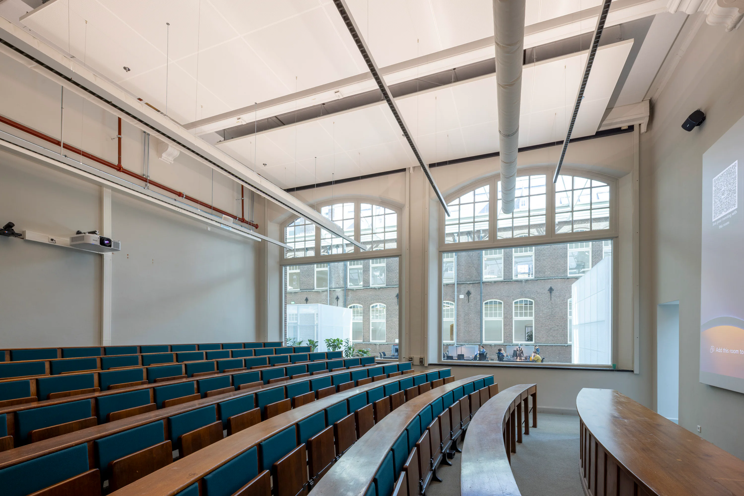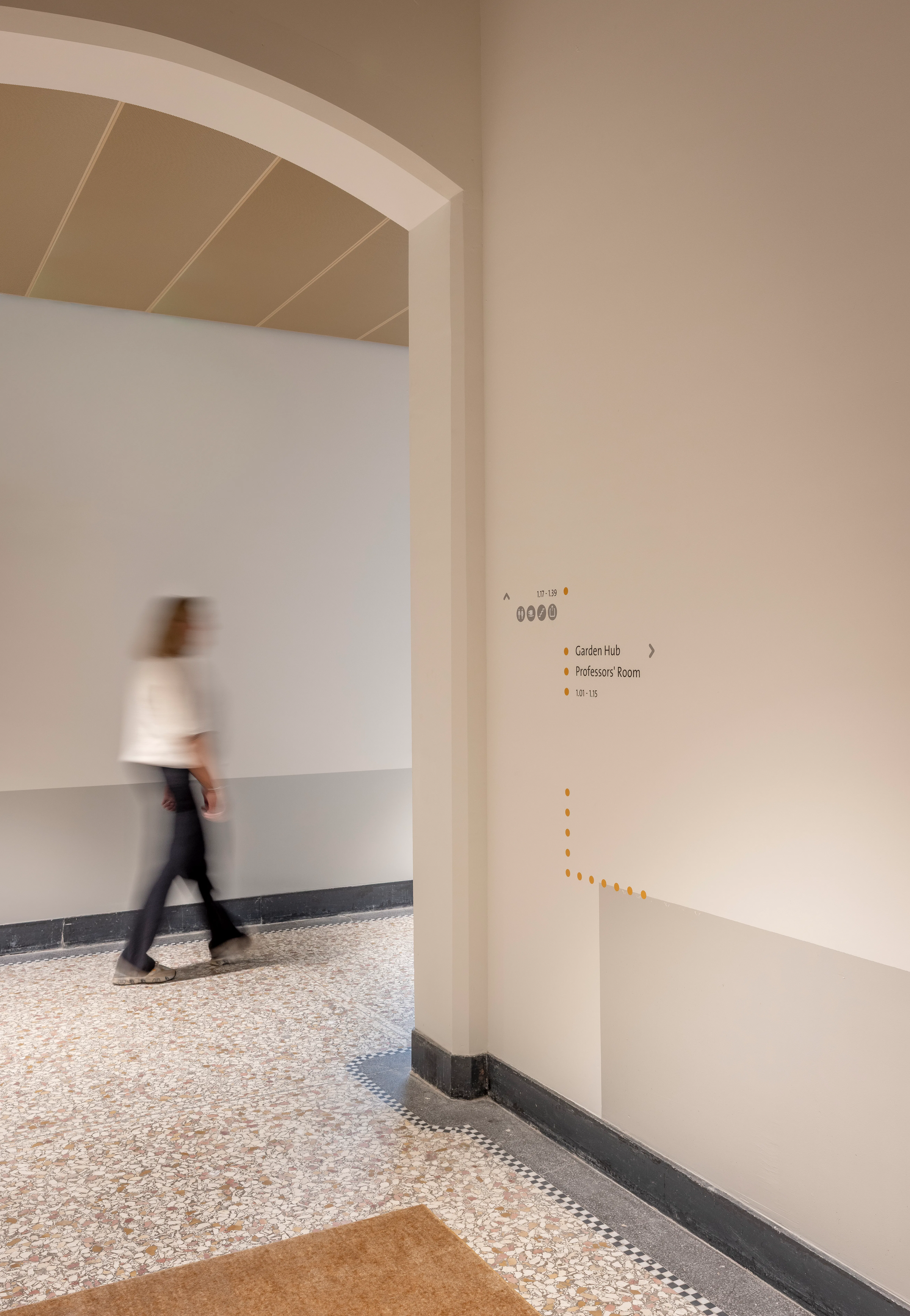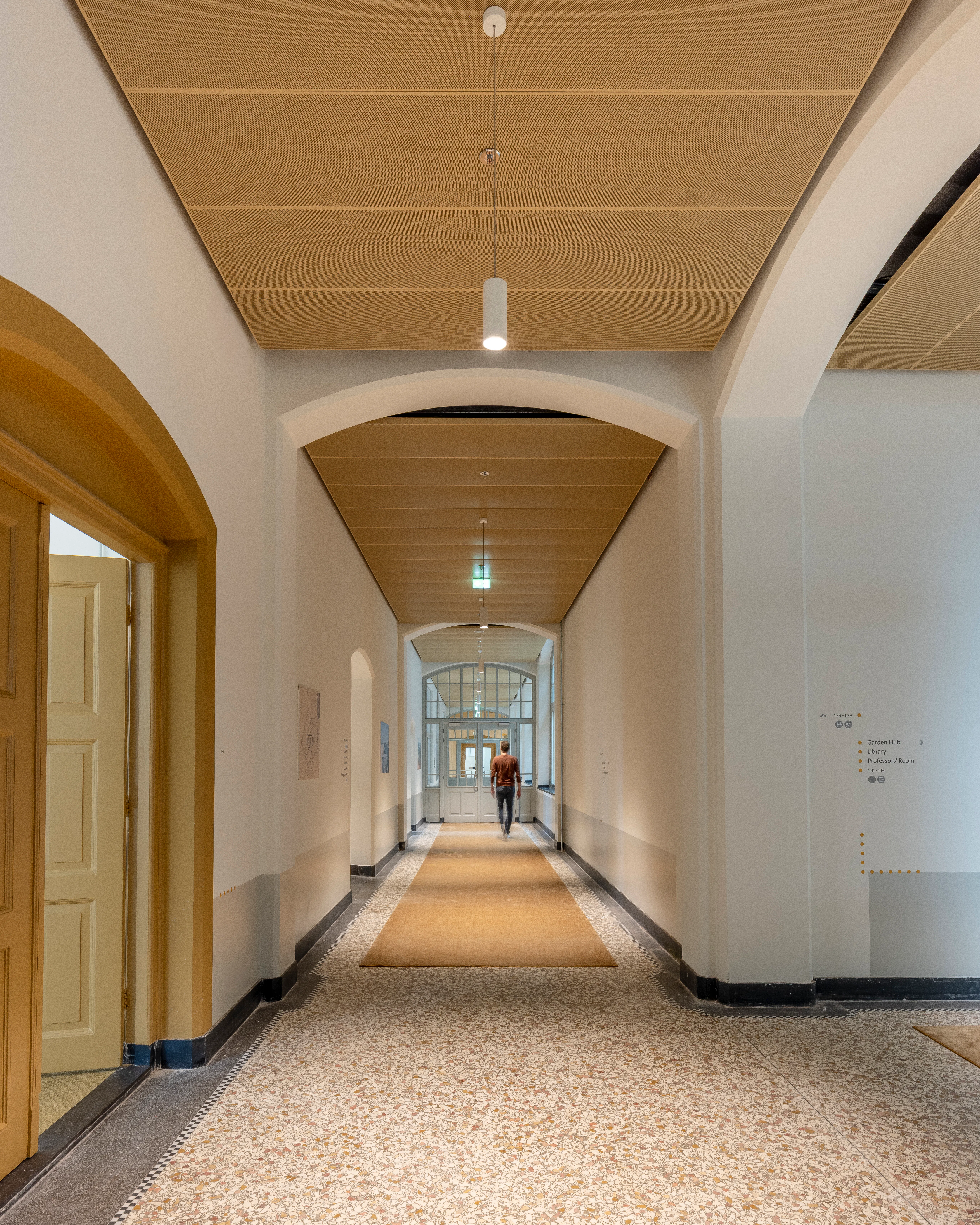 De bestaande structuur van het gebouw vormde de basis voor het werkplekkenprogramma. De gangstructuur is hersteld als drager van de interne routing, de vroegere laboratoria zijn ingericht als open werkruimten, en kenmerkende ruimten zoals de aulazaal zijn gerestaureerd en opnieuw in gebruik genomen. Kleuronderzoek door Fokkema & Partners bracht de oorspronkelijke decoratieve afwerkingen en eikenhouten lambriseringen aan het licht; de huidige kleuren zijn gebaseerd op de originele muurstencils. Tijdens de werkzaamheden stuitte het projectteam op asbest, chroom-6, aangetaste houten balken en vleermuizen, wat nauwe samenwerking met monumentenzorg vereiste.