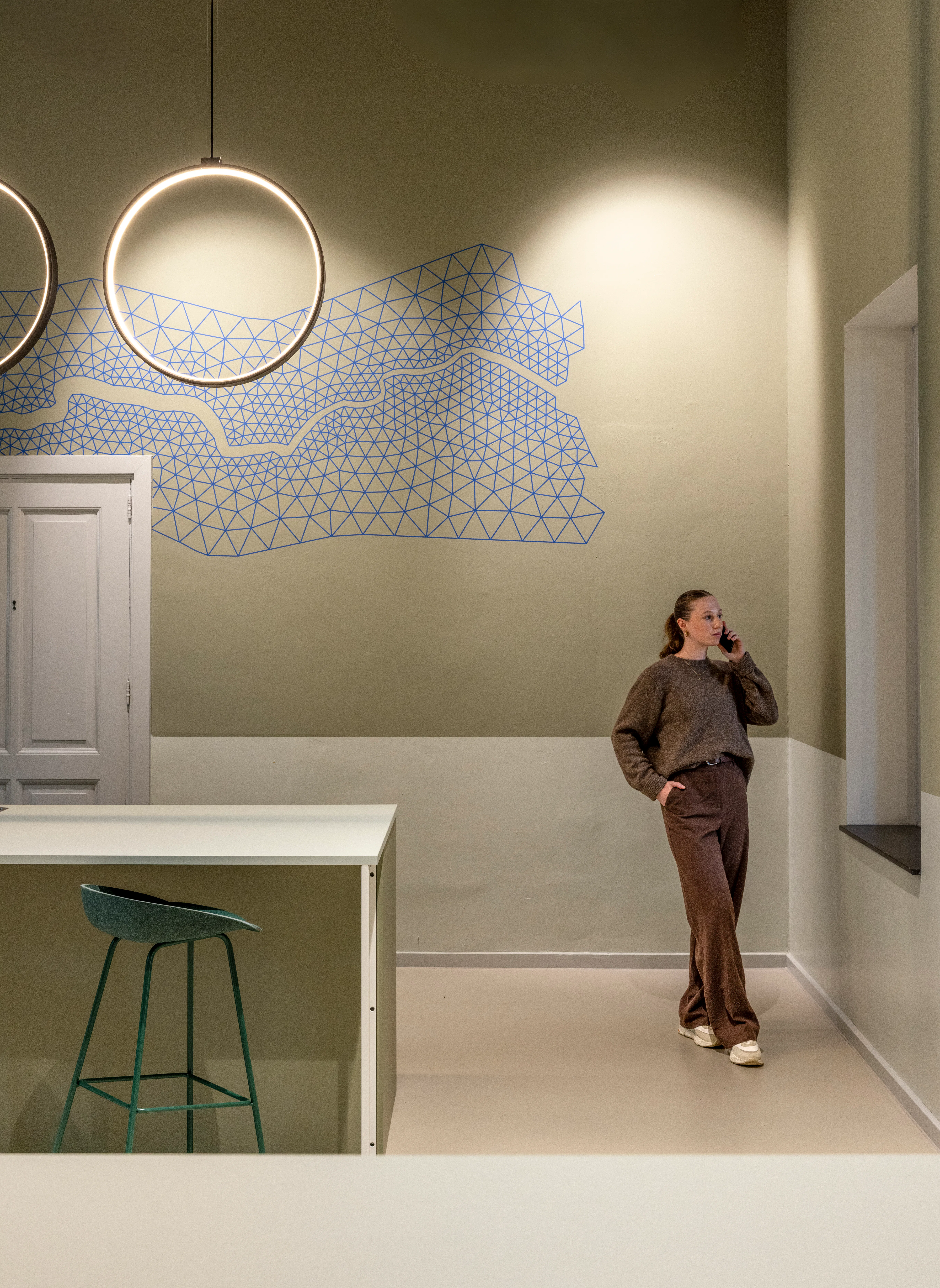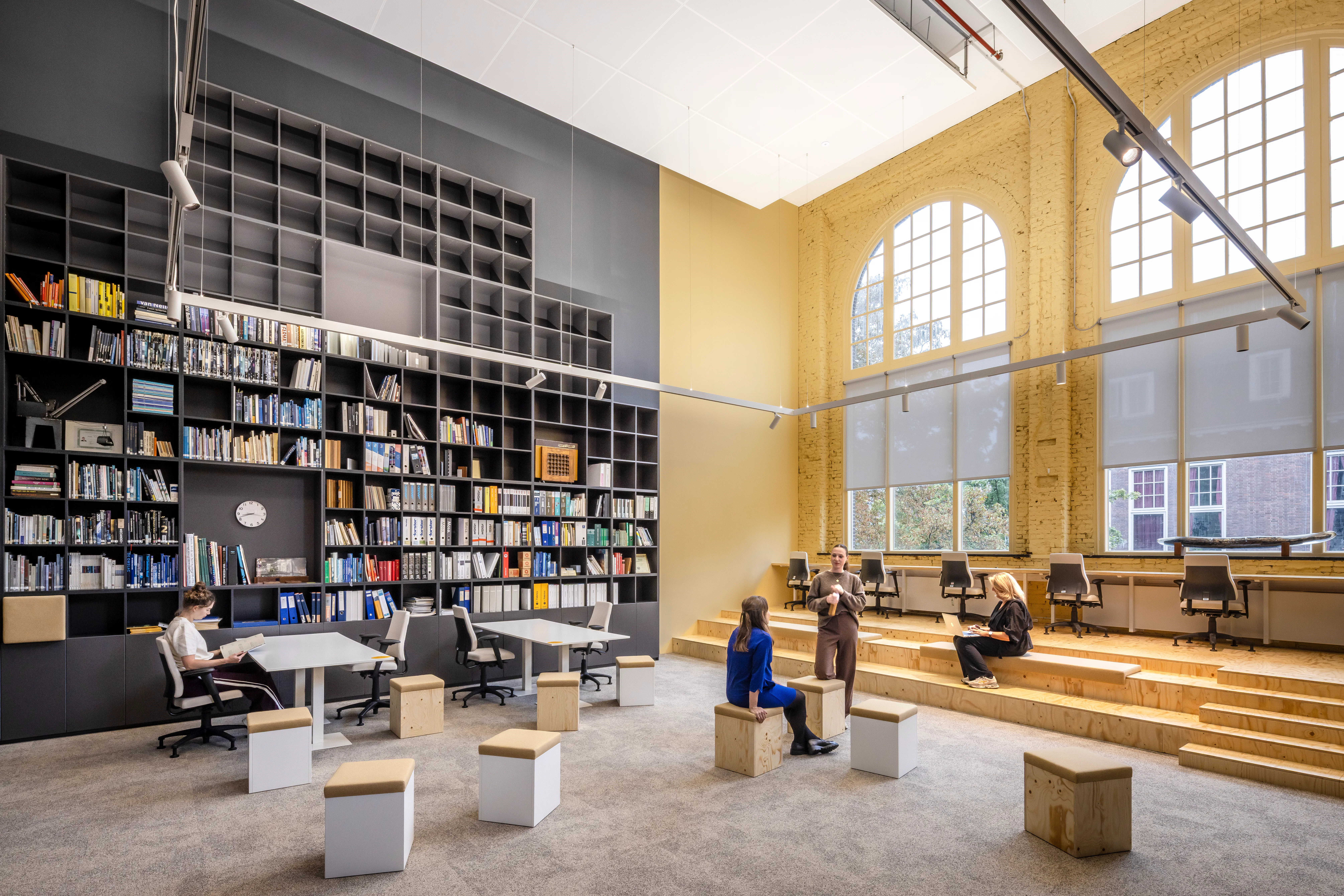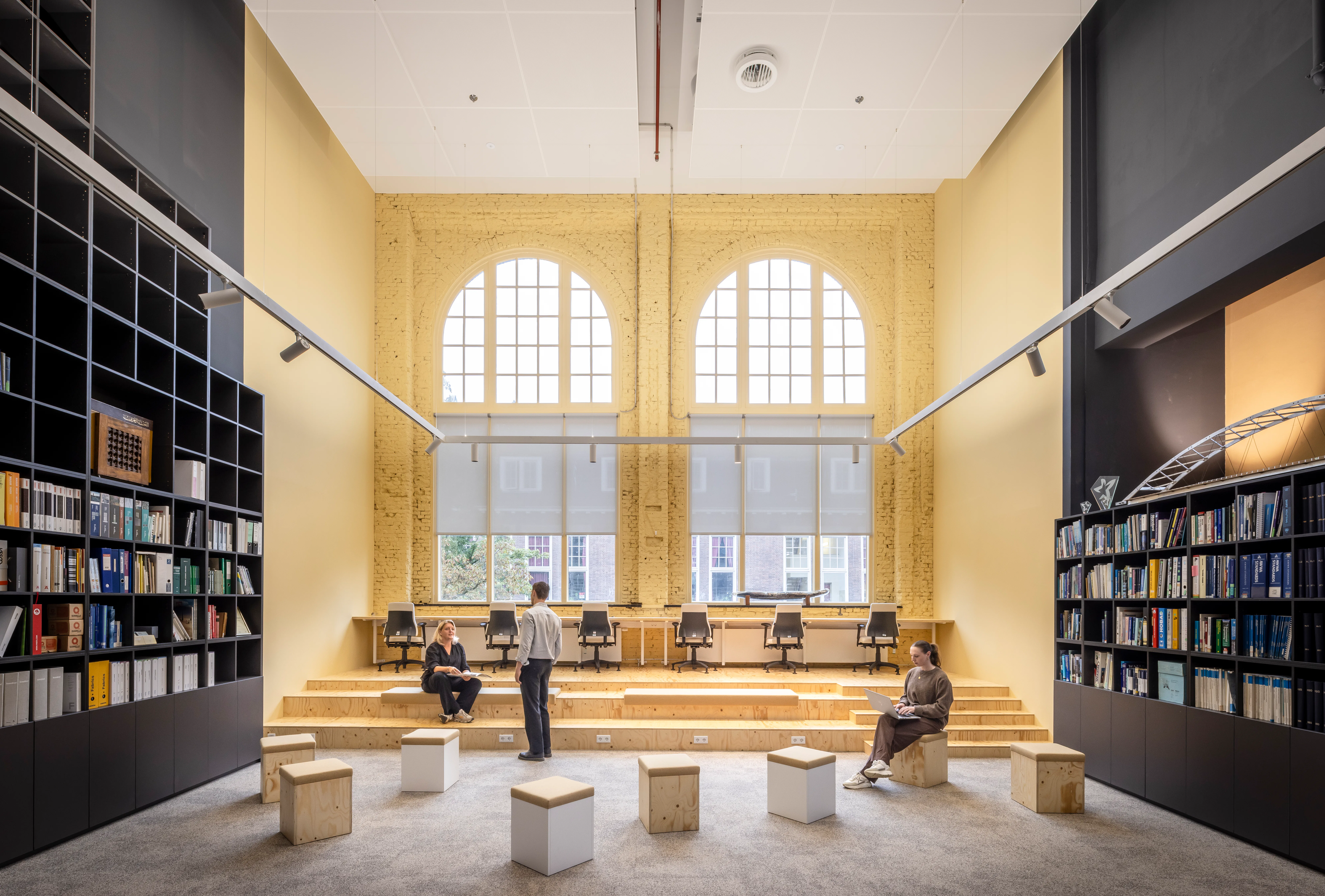 De bestaande structuur van het gebouw vormde de basis voor het werkplekkenprogramma. De gangstructuur is hersteld als drager van de interne routing, de vroegere laboratoria zijn ingericht als open werkruimten, en kenmerkende ruimten zoals de aulazaal zijn gerestaureerd en opnieuw in gebruik genomen. Kleuronderzoek door Fokkema & Partners bracht de oorspronkelijke decoratieve afwerkingen en eikenhouten lambriseringen aan het licht; de huidige kleuren zijn gebaseerd op de originele muurstencils. Tijdens de werkzaamheden stuitte het projectteam op asbest, chroom-6, aangetaste houten balken en vleermuizen, wat nauwe samenwerking met monumentenzorg vereiste.