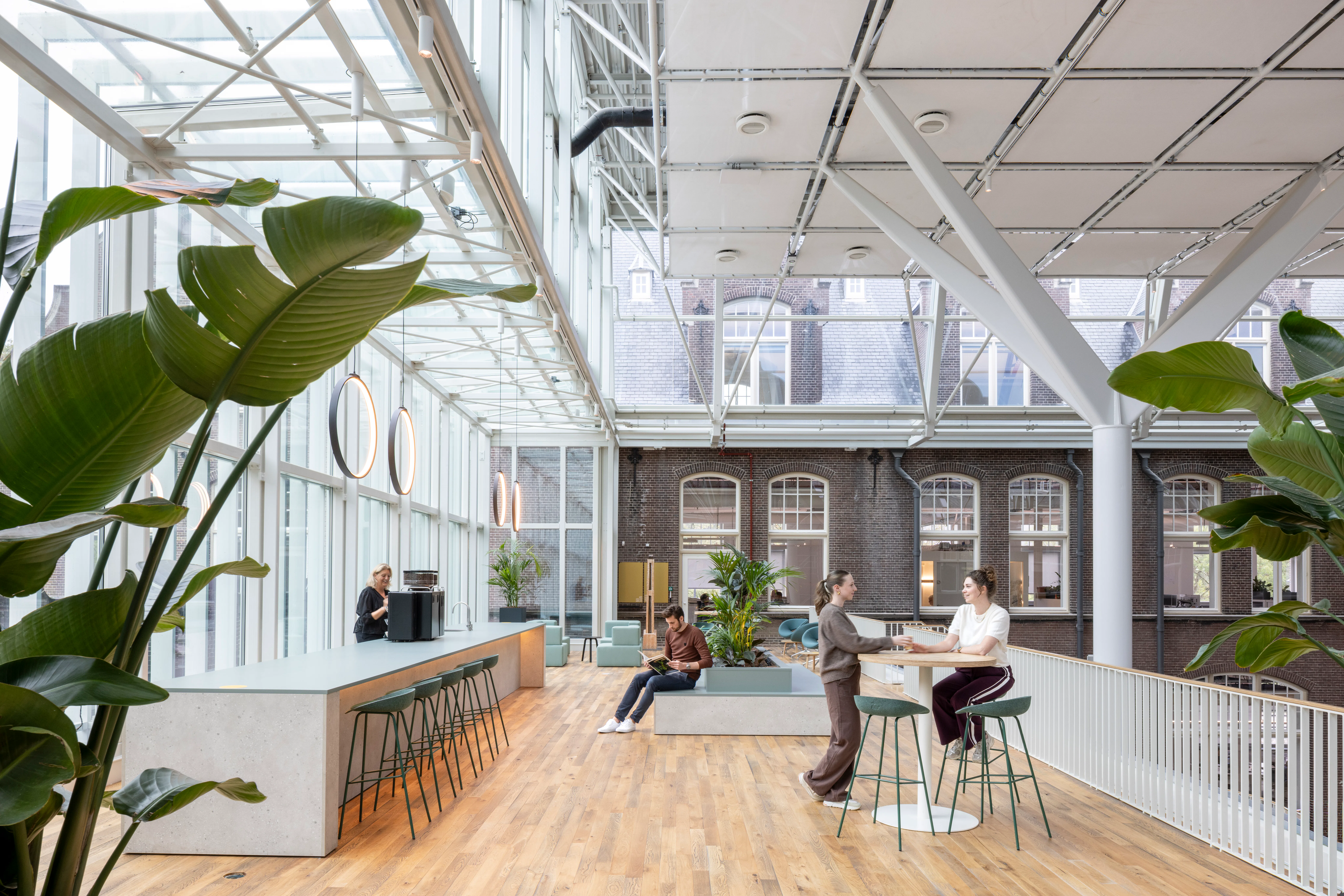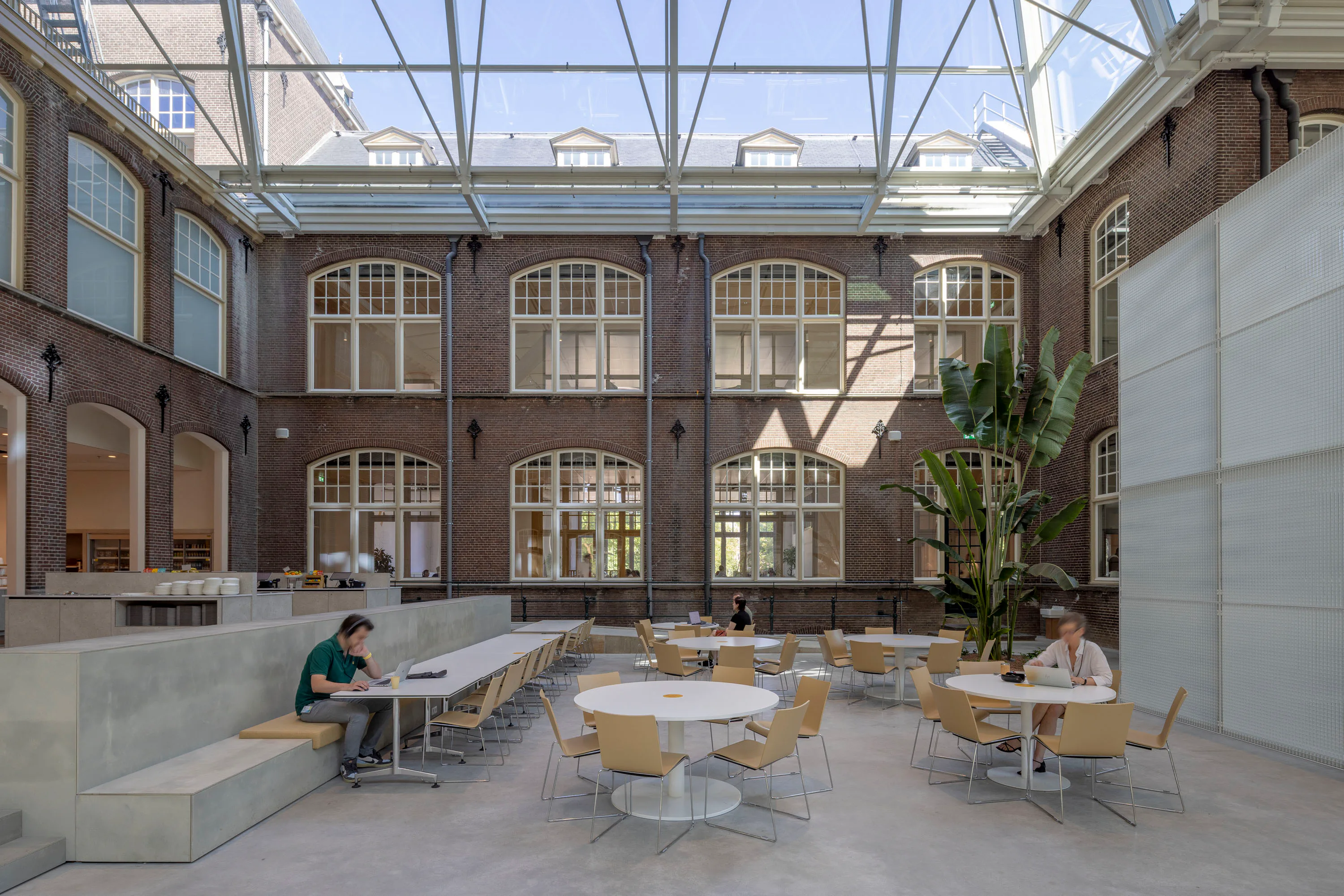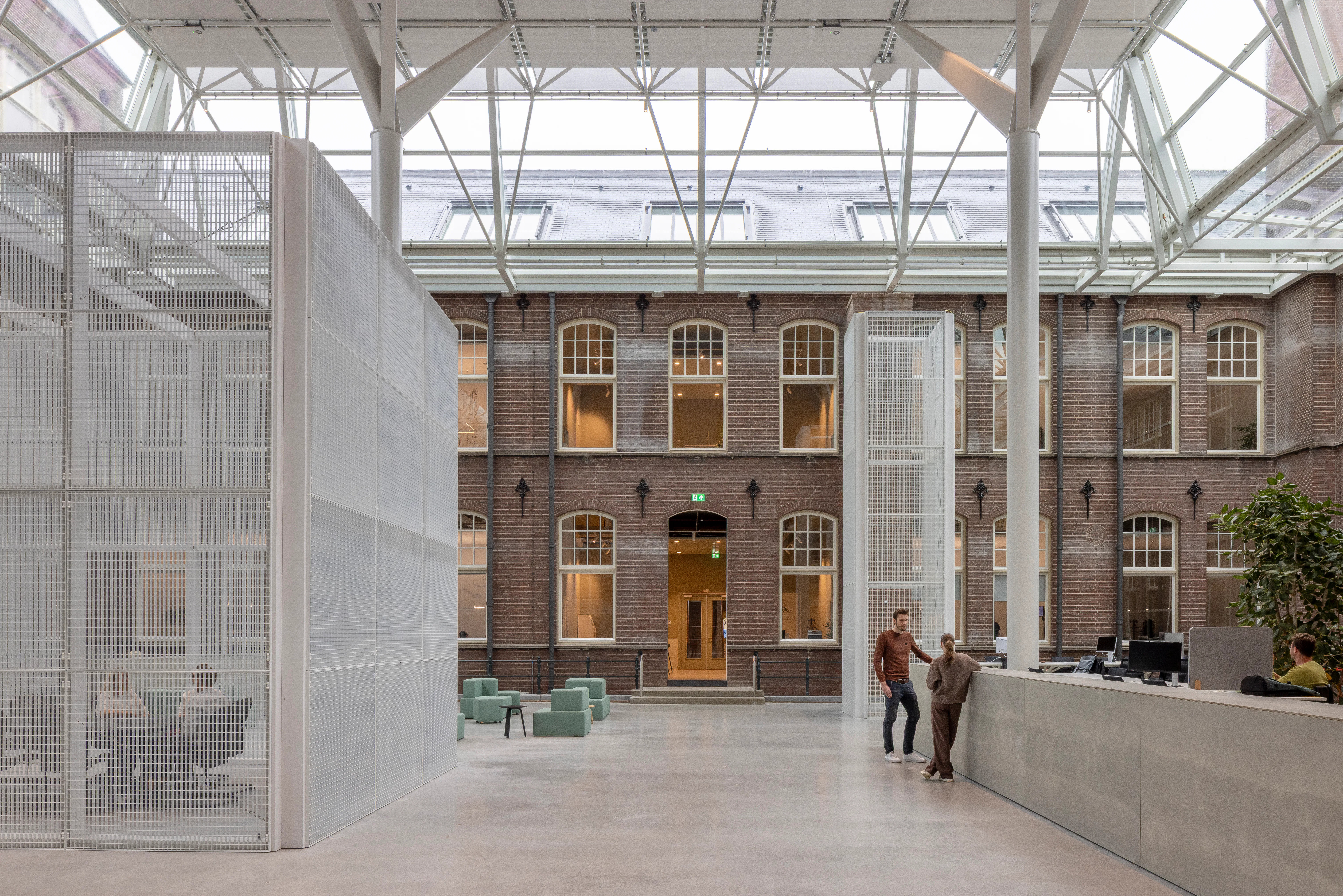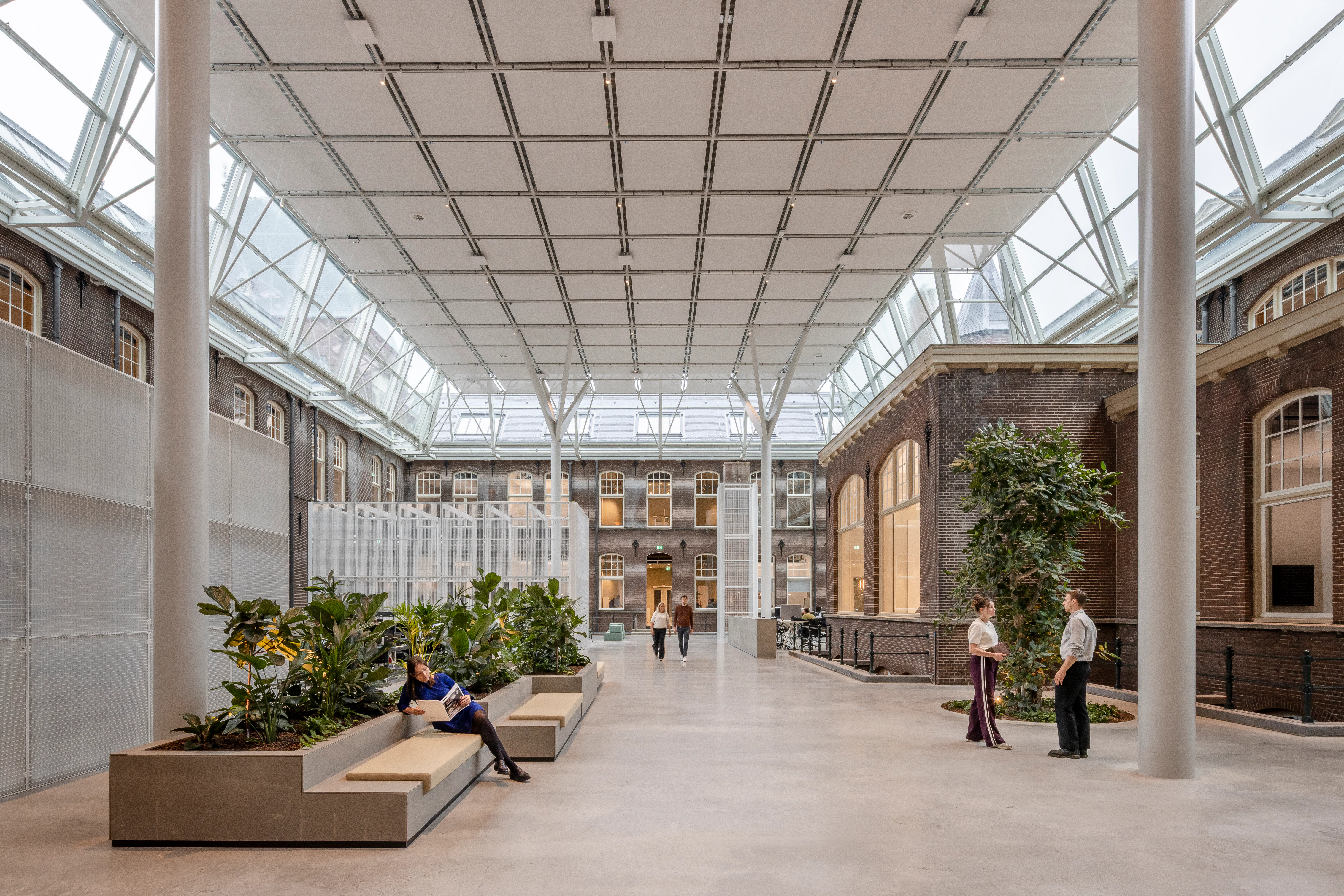 Het gebouw kenmerkt zich door een neorenaissance-stijl met een functionele indeling en twee open binnenhoven die oorspronkelijk zorgden voor lichtinval en ventilatie. In de transformatie zijn deze hoven overkapt met transparante glazen daken en omgevormd tot atria, die nu functioneren als het ruimtelijke hart van het kantoor. De overkapping is als zelfstandig element op zolderniveau aangebracht, los van de bestaande constructie, zodat de historische gevels en kapconstructies zichtbaar blijven. Eén atrium is ingericht als sociale hub met eet- en lunchplekken, het andere als werkruimte met flexwerkplekken.