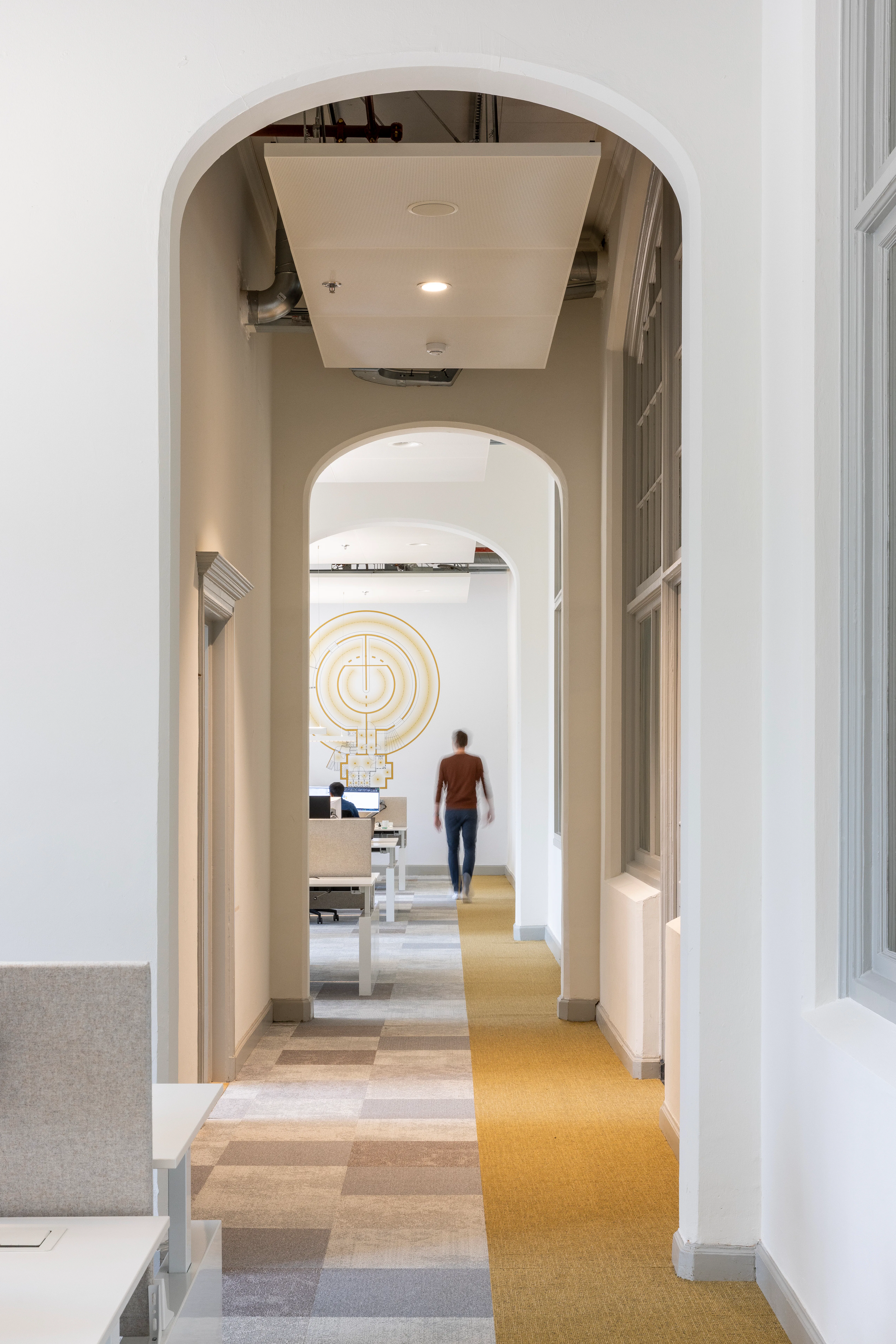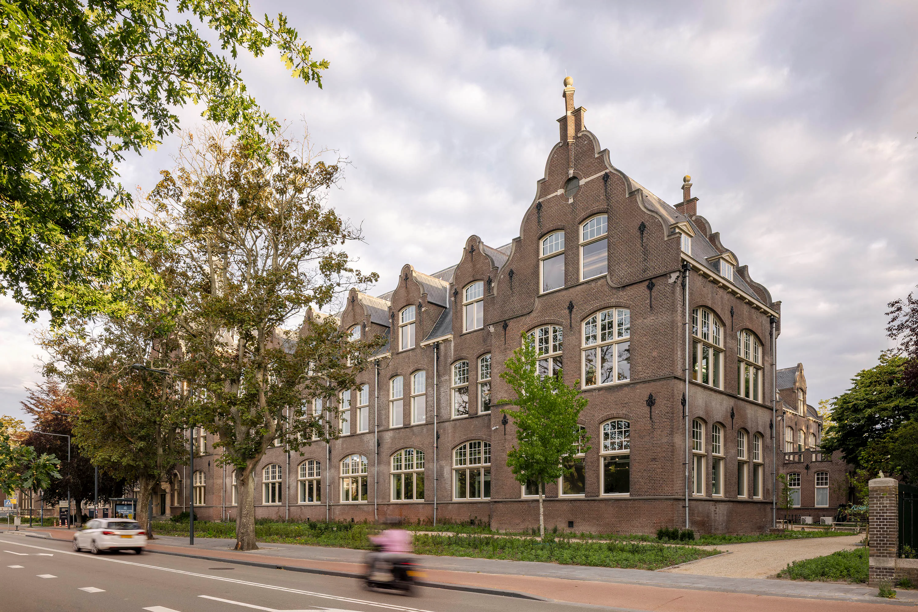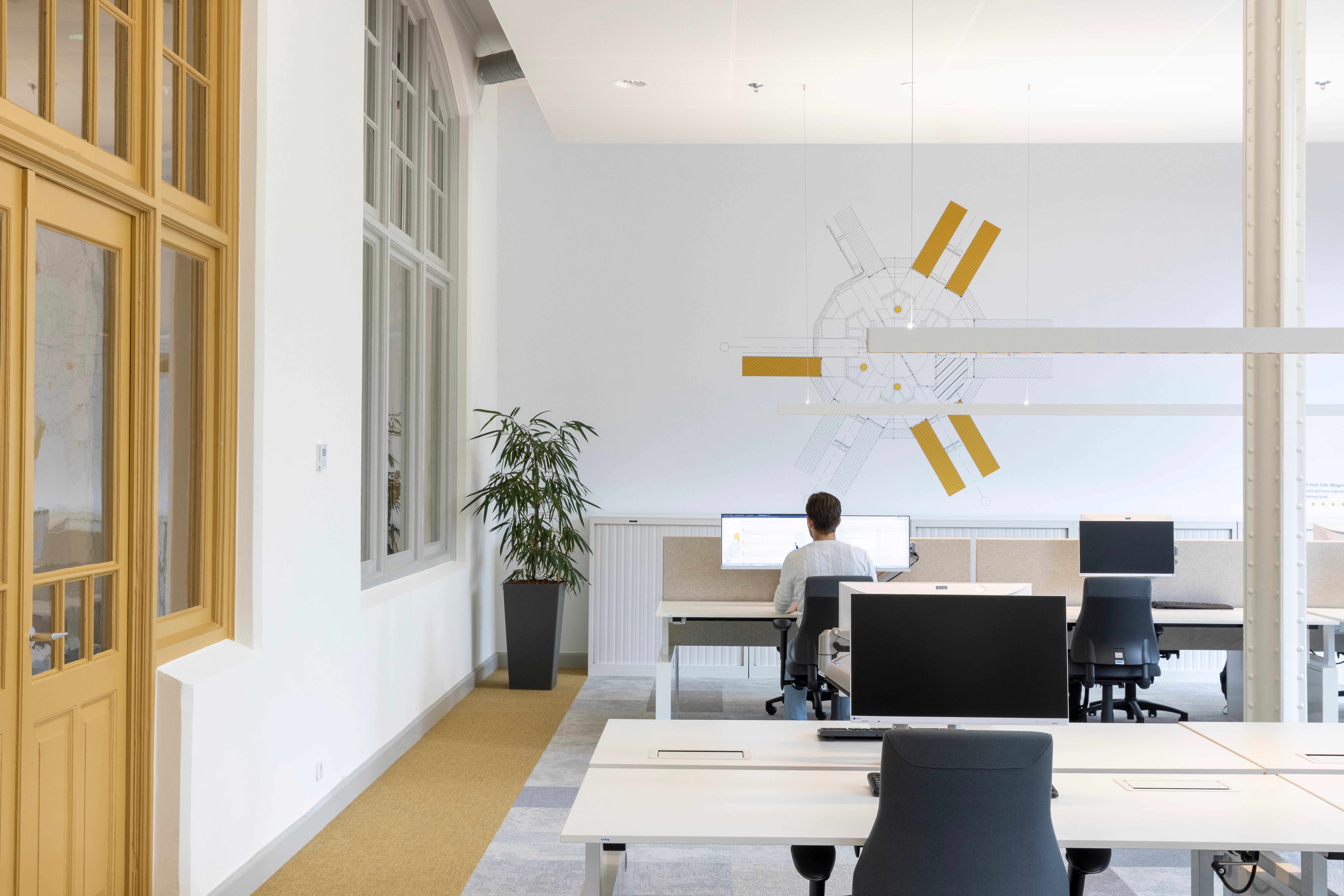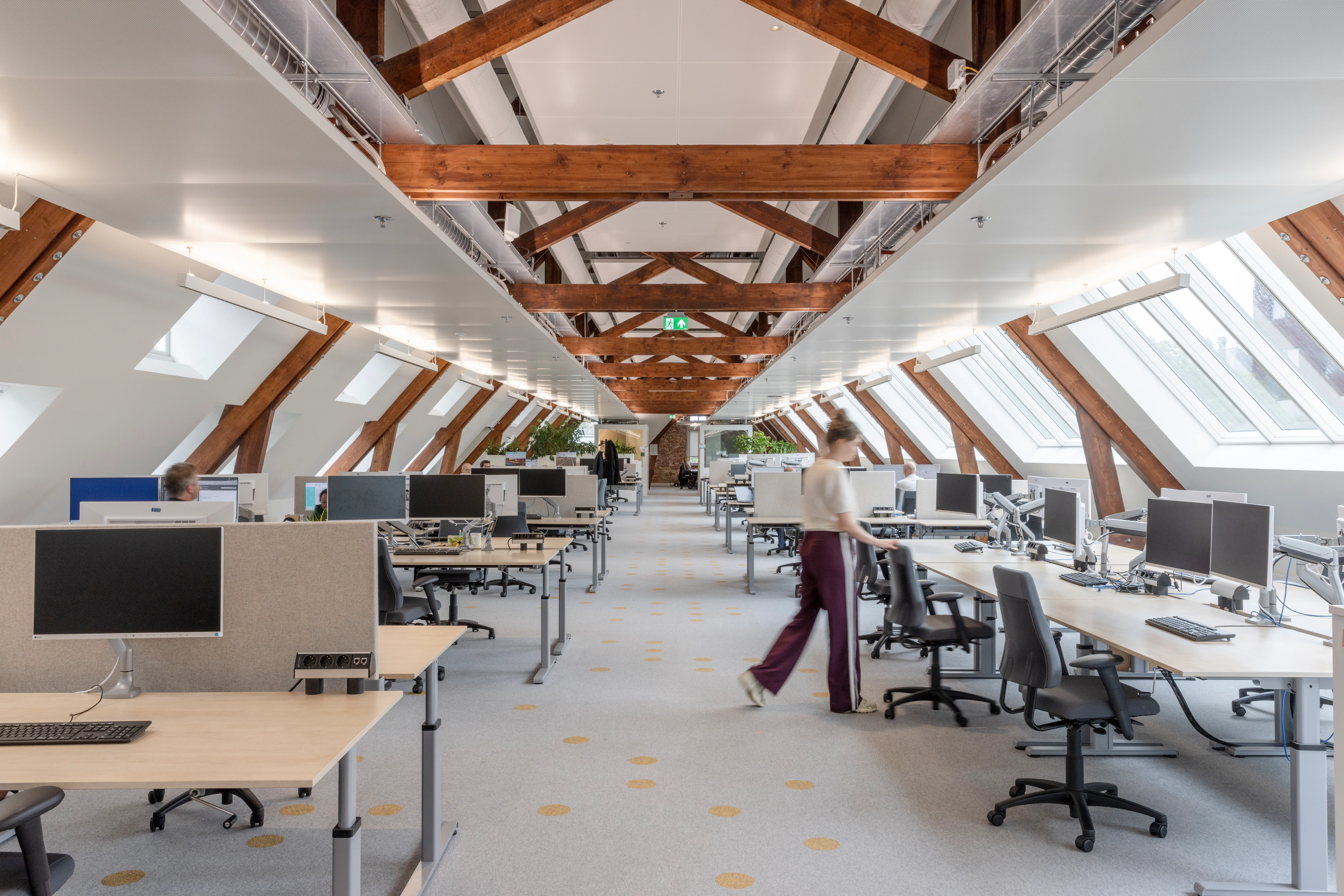 Het gebouw kenmerkt zich door een neorenaissance-stijl met een functionele indeling en twee open binnenhoven die oorspronkelijk zorgden voor lichtinval en ventilatie. In de transformatie zijn deze hoven overkapt met transparante glazen daken en omgevormd tot atria, die nu functioneren als het ruimtelijke hart van het kantoor. De overkapping is als zelfstandig element op zolderniveau aangebracht, los van de bestaande constructie, zodat de historische gevels en kapconstructies zichtbaar blijven. Eén atrium is ingericht als sociale hub met eet- en lunchplekken, het andere als werkruimte met flexwerkplekken.
