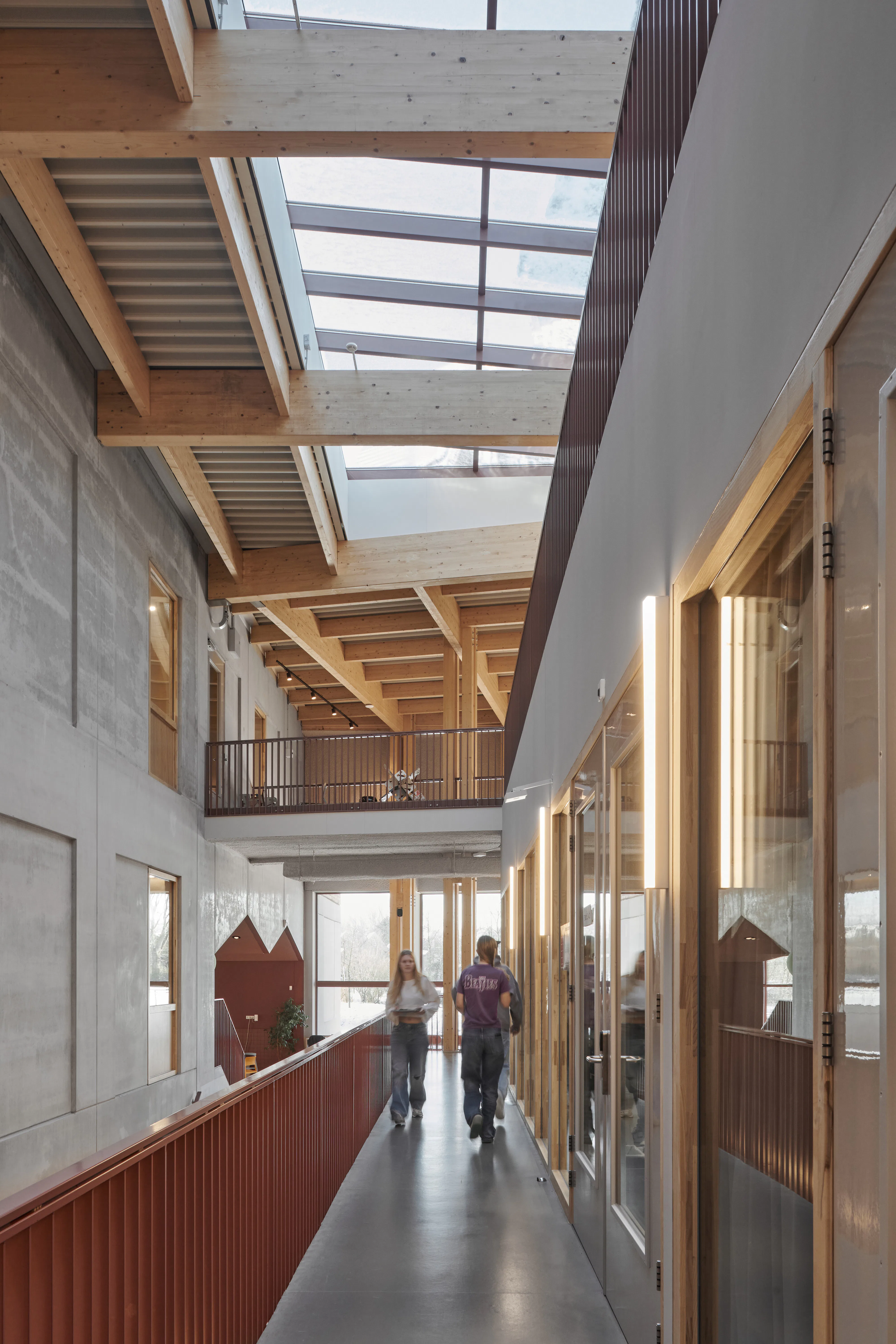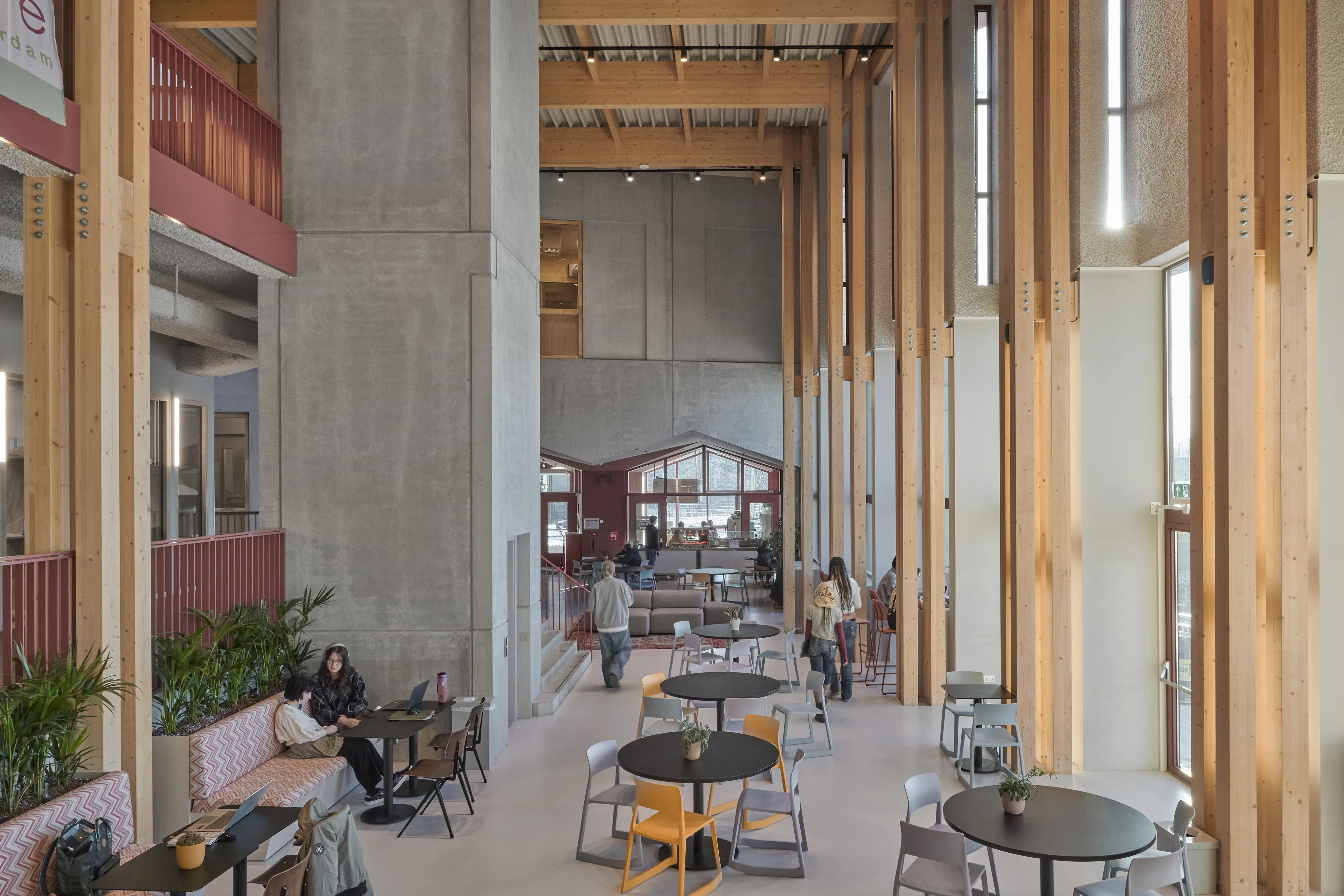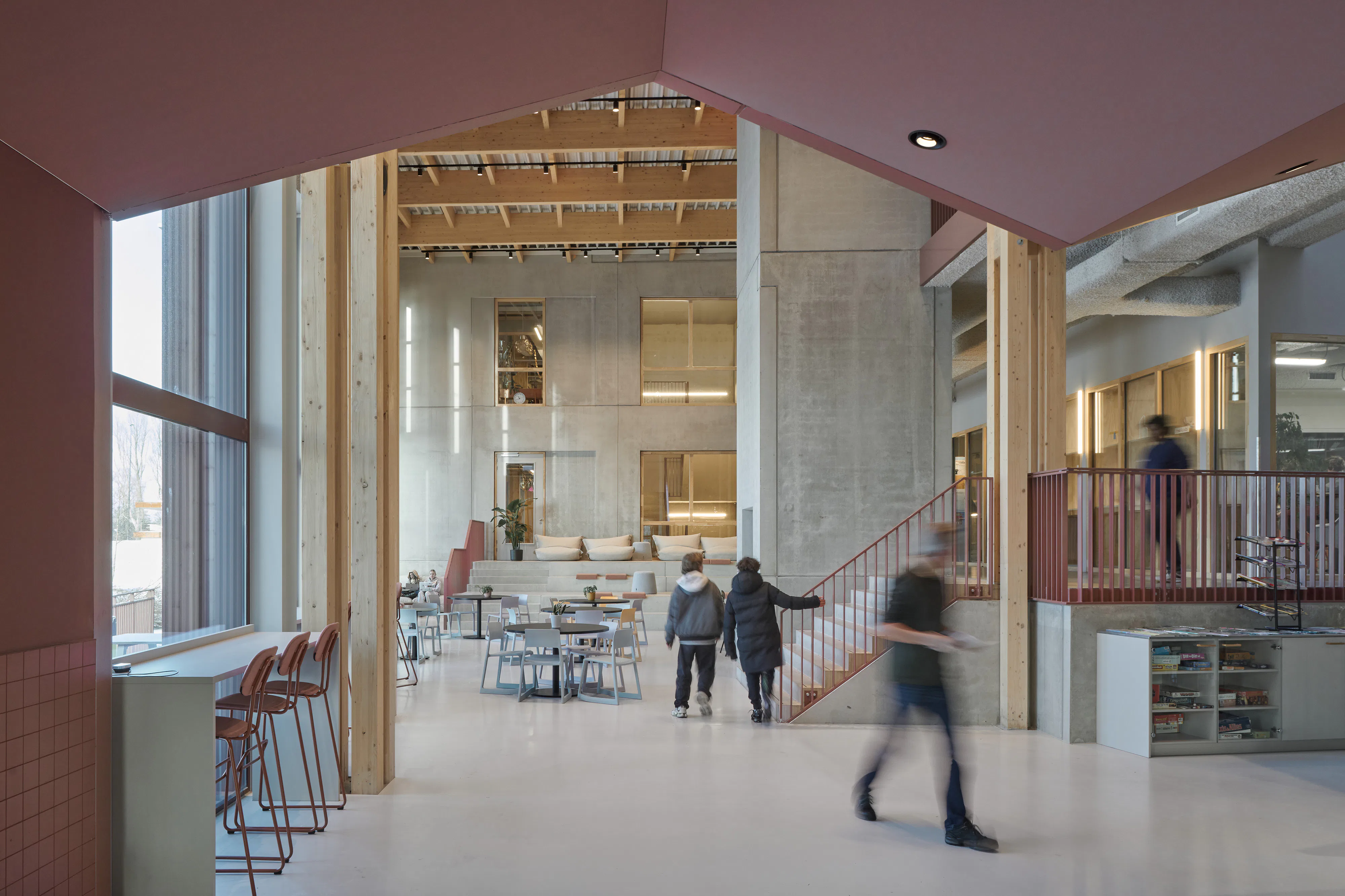De entree is uitgevoerd in donkerrood keramiek, met een hoekig, gefacetteerd dak dat deels de aula insteekt. Daarachter bevindt zich een tien meter hoge aula met zichtbare houten spanten, die het ruimtelijke en organisatorische hart van de school vormt. Rondom deze centrale ruimte liggen coachruimtes en zes makerspaces - waaronder een techlab, atelier en muziekstudio - die via glazen wanden in verbinding staan met de aula. Alle ruimtes zijn met flexibele tussenwanden af te scheiden of te verbinden, waardoor het gebouw toekomstige veranderingen kan opvangen. Er zijn geen gangen, lokalen, kluisjes of lerarenkamer; leerlingen nemen hun eigen stoel en bureau mee naar school.