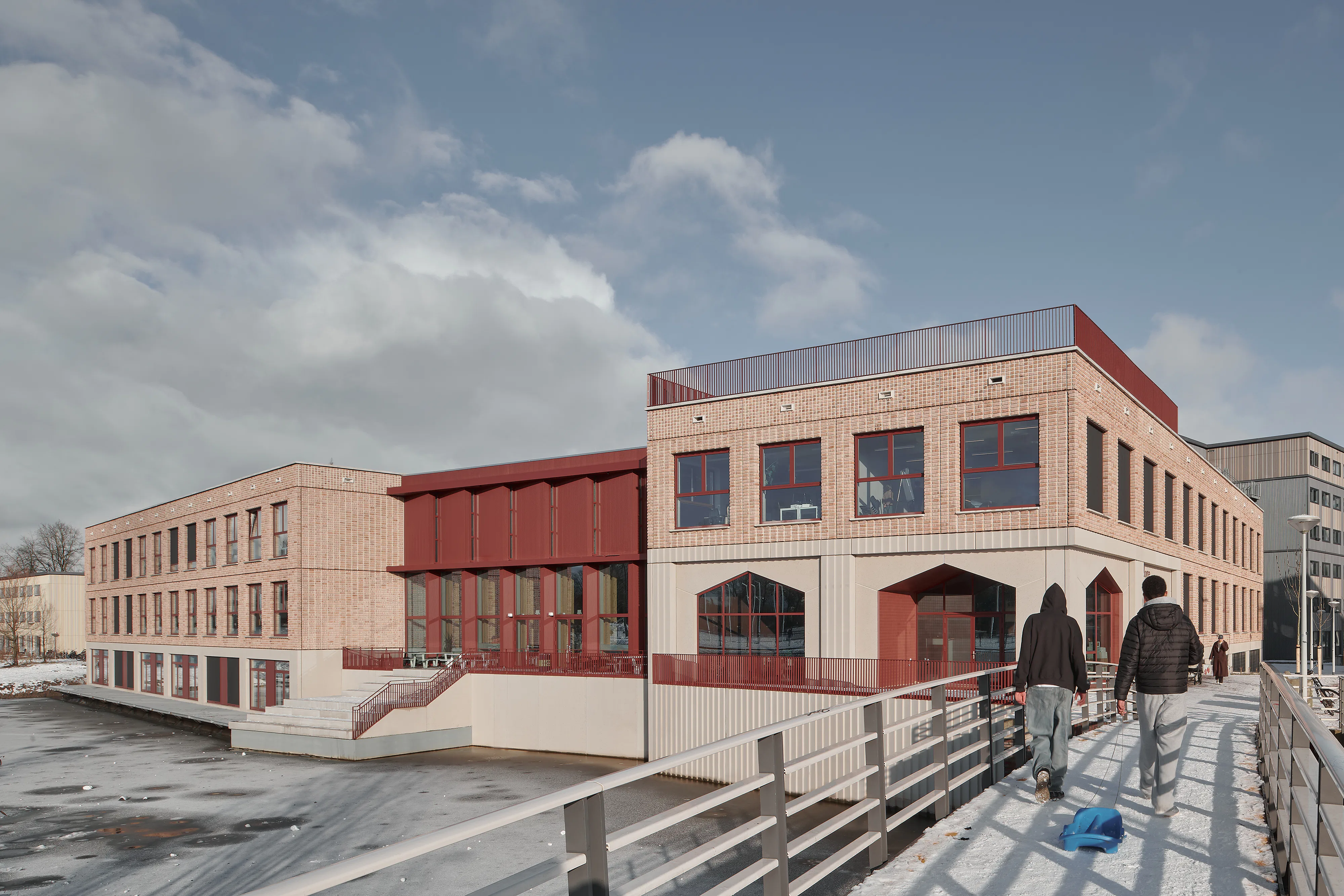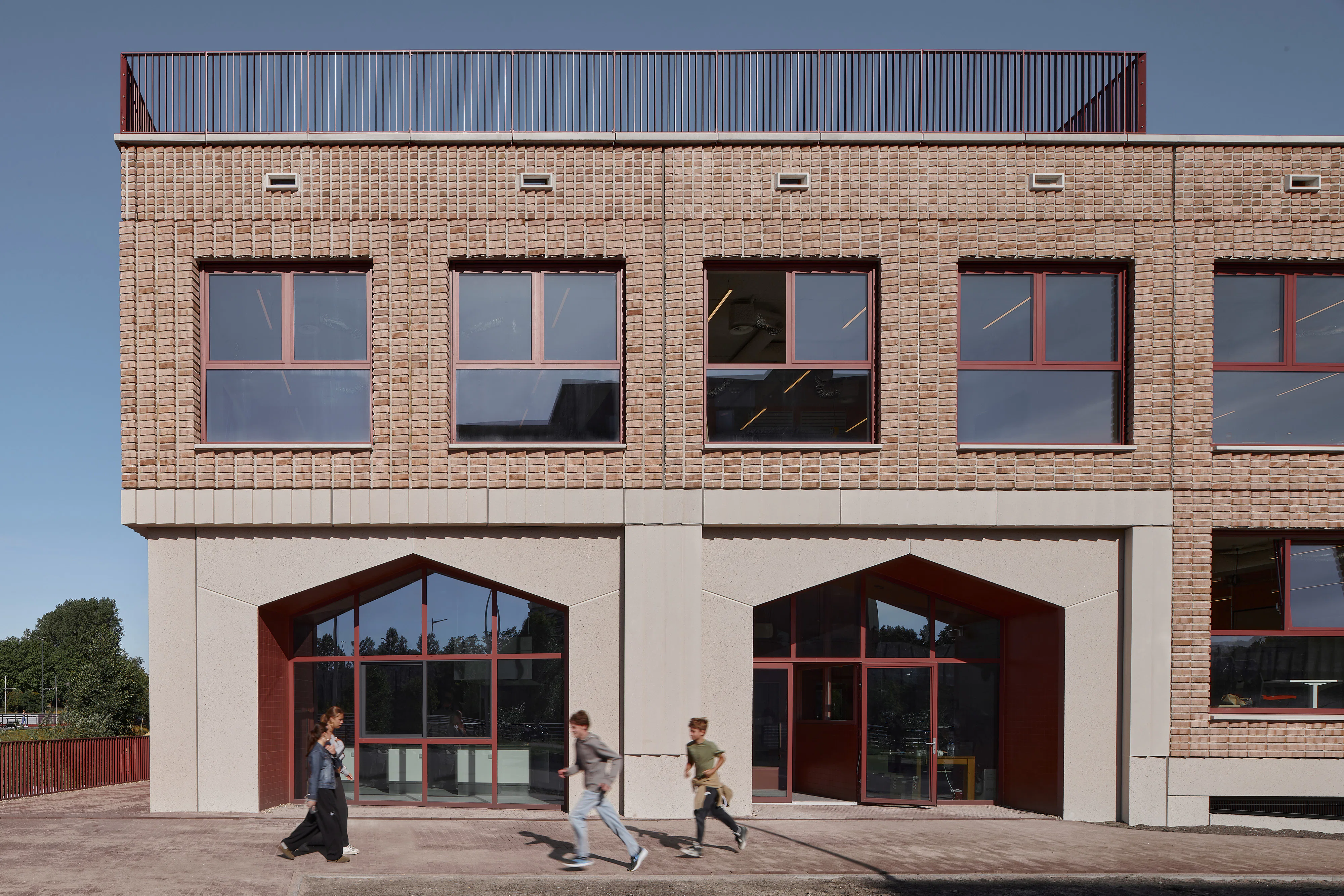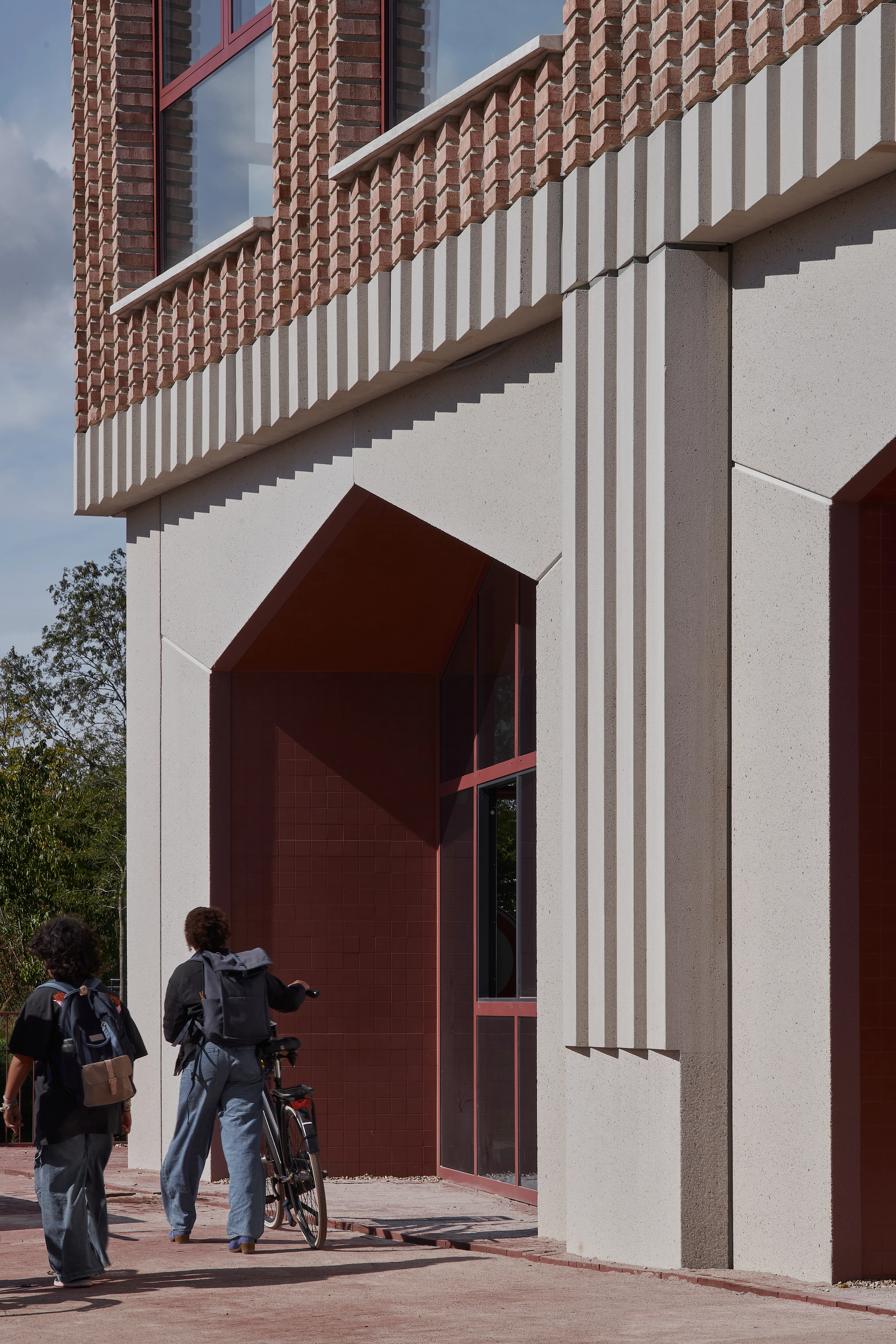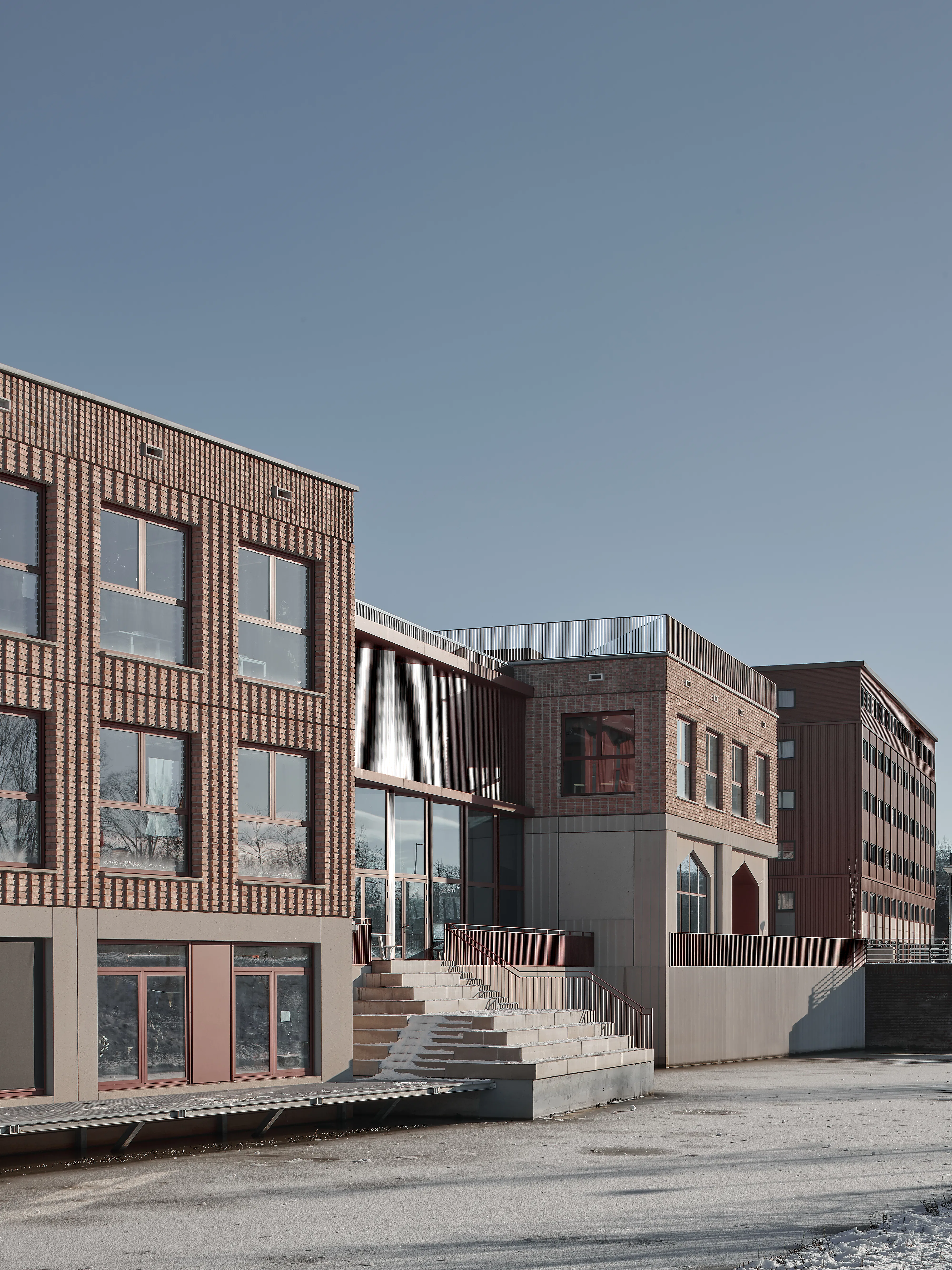De L-vorm van het gebouw - ontstaan doordat het zich om een bestaande sportzaal heen plooit - stelde beperkingen aan de daglichttoetreding. Verkeersruimtes zijn verblijfsruimtes geworden, trappenhuizen nodigen uit tot gebruik en daglicht bereikt via vides tot diep in het gebouw het hart van de school. De gevels zijn opgebouwd uit prefab betonelementen met ingestorte bakstenen die diagonaal zijn doorgezaagd, waardoor de punten uitsteken en reliëf ontstaat terwijl het materiaalgebruik beperkt blijft.