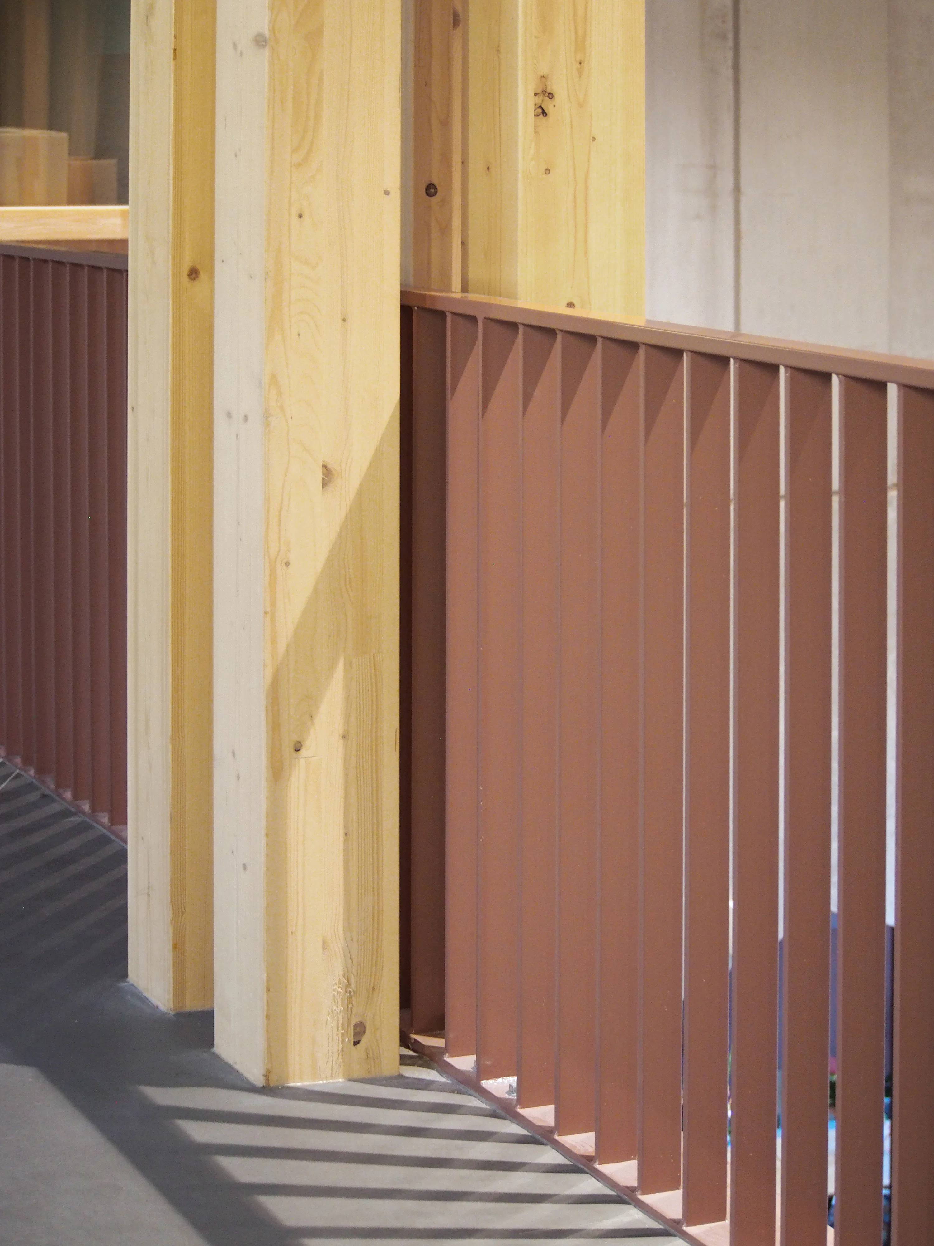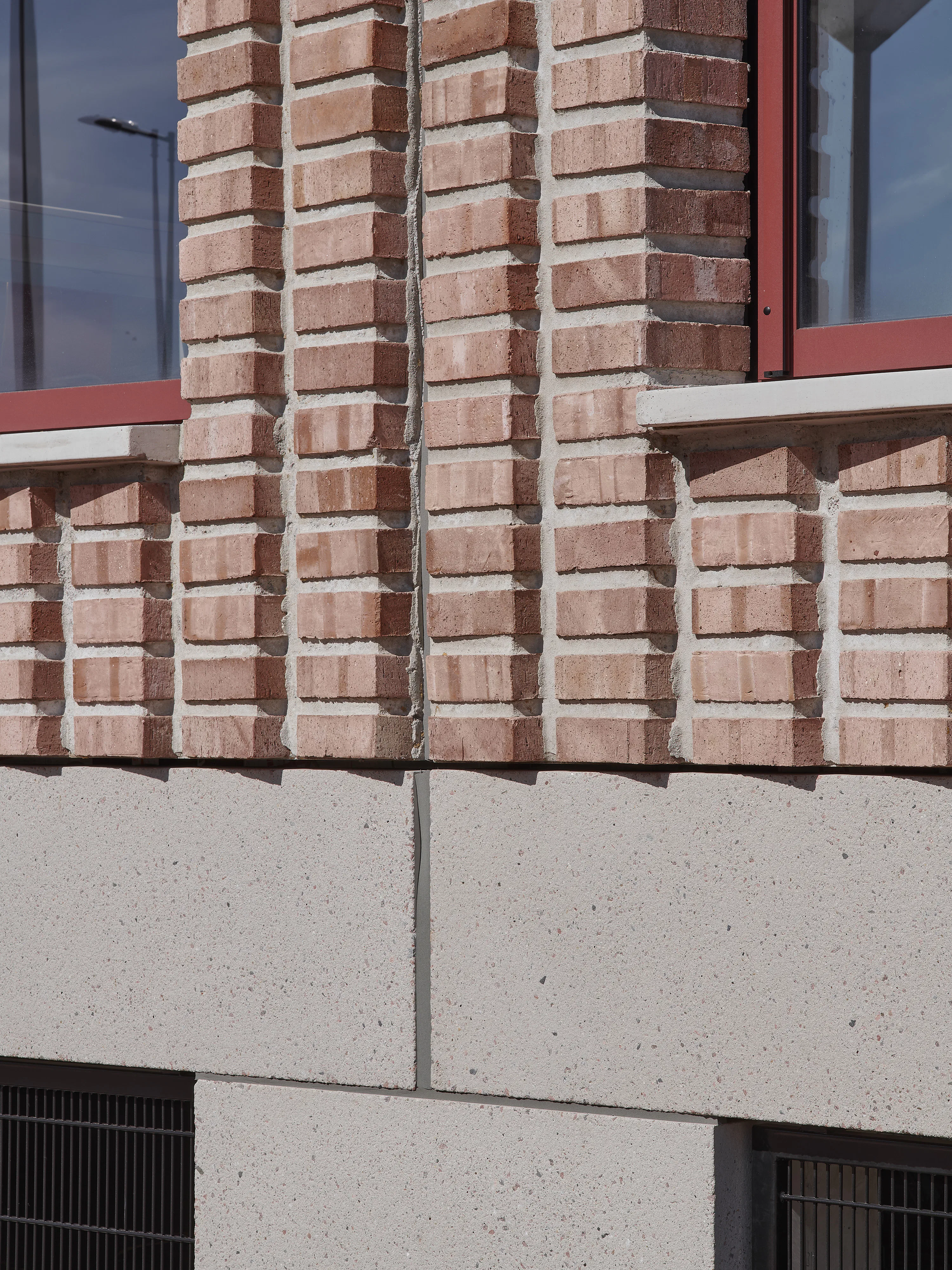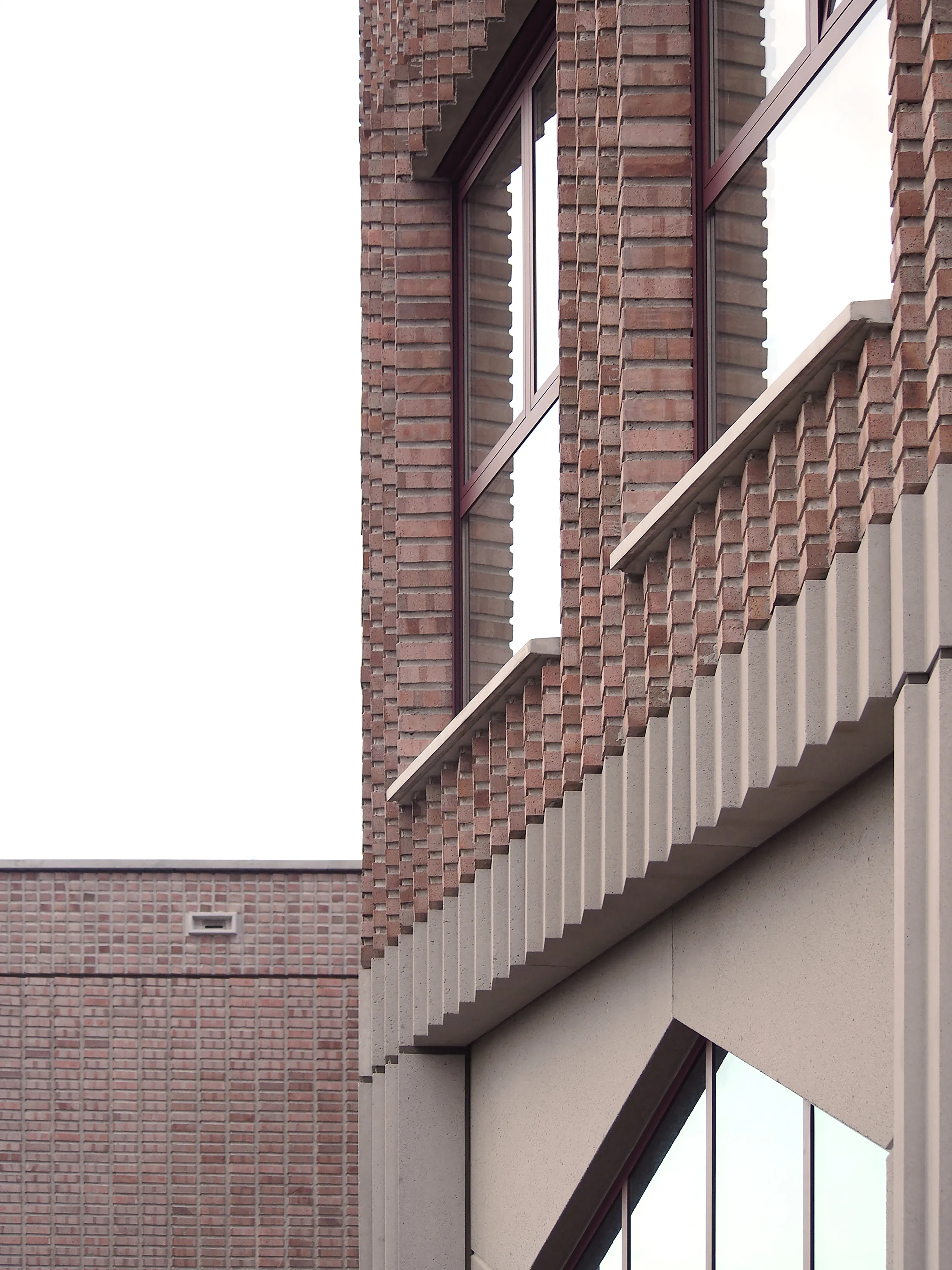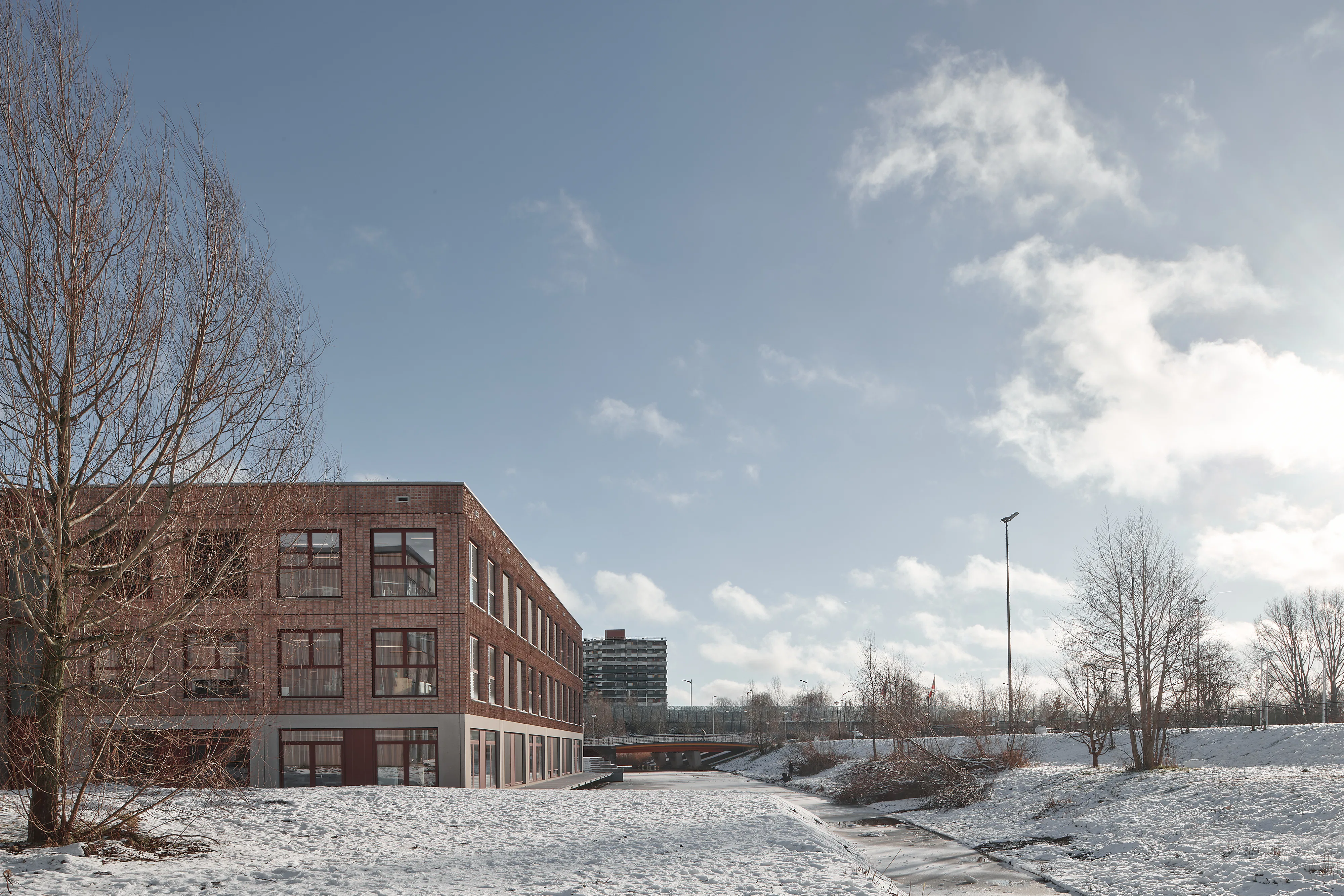 De L-vorm van het gebouw - ontstaan doordat het zich om een bestaande sportzaal heen plooit - stelde beperkingen aan de daglichttoetreding. Verkeersruimtes zijn verblijfsruimtes geworden, trappenhuizen nodigen uit tot gebruik en daglicht bereikt via vides tot diep in het gebouw het hart van de school. De gevels zijn opgebouwd uit prefab betonelementen met ingestorte bakstenen die diagonaal zijn doorgezaagd, waardoor de punten uitsteken en reliëf ontstaat terwijl het materiaalgebruik beperkt blijft.