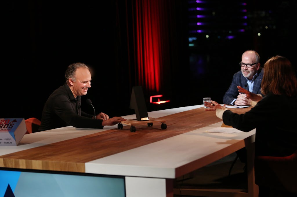 De ARC20 Award Show is dit jaar rechtstreeks uitgezonden vanuit de Mediahaven in Amsterdam. De rust en de concentratie in de studio werkten weldadig en kwam de aandacht voor de projecten ten goede. Aan tafel host Harm Tilman met Thijs Asselbergs, voorzitter van de ARC20 Oeuvre jury. Beeld Cynthia van Dijke