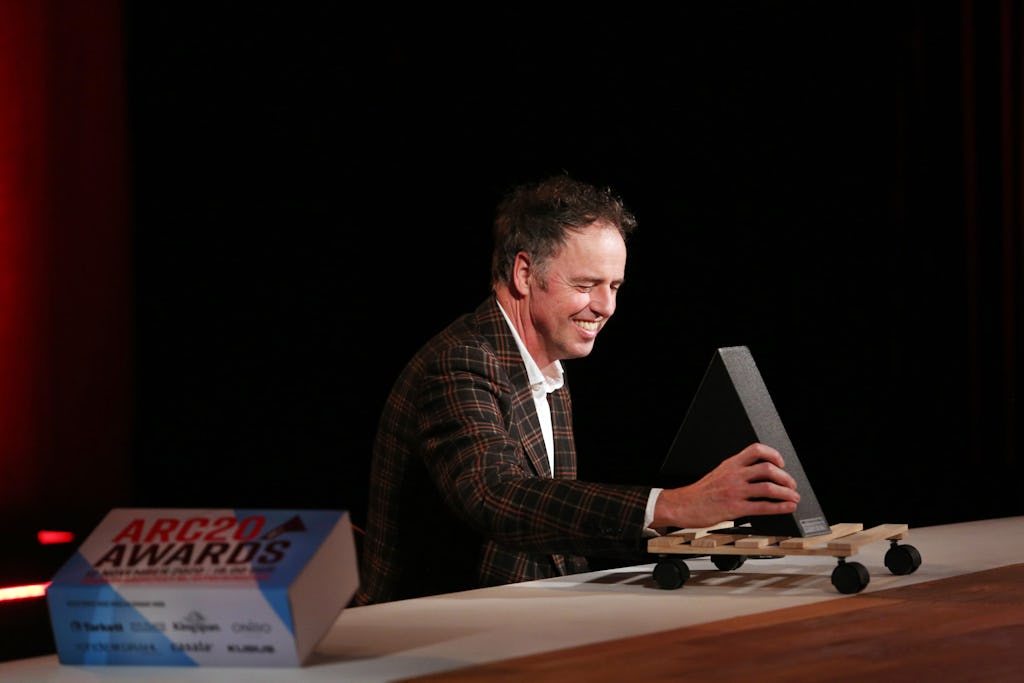 Adriaan Geuze van West 8 neemt glunderend de ARC20 Stedenbouw Award in ontvangst voor De Nieuwe Kern in Ouder Amstel. Hij kreeg de Award voor dit sterke stedenbouwkundige plan uitgereikt door juryvoorzitter Marco Broekman. Beeld Cynthia van Dijke