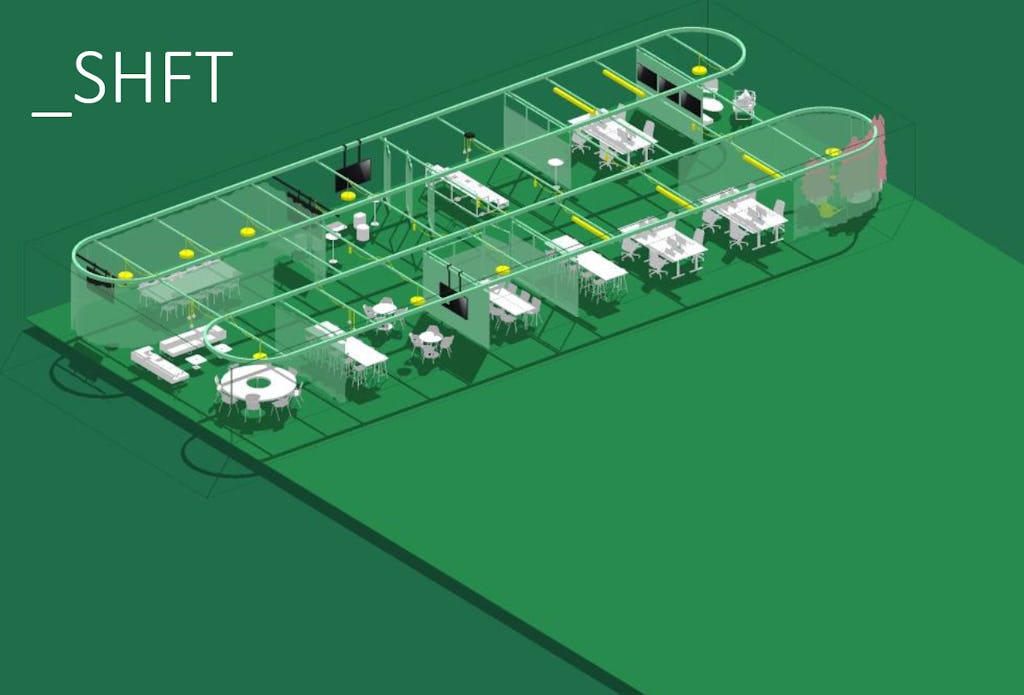 Kantoren zijn volgens Hollandse Nieuwe Interieur en Architectuur niet meer plekken om te produceren, maar om persoonlijke doelen te realiseren en ons voor korte of langere tijd te verbinden met gelijkgestemde mensen. Als antwoord hierop is SHFT ontwikkeld, een verzameling ruimte-verdelende elementen voor de werkomgeving .