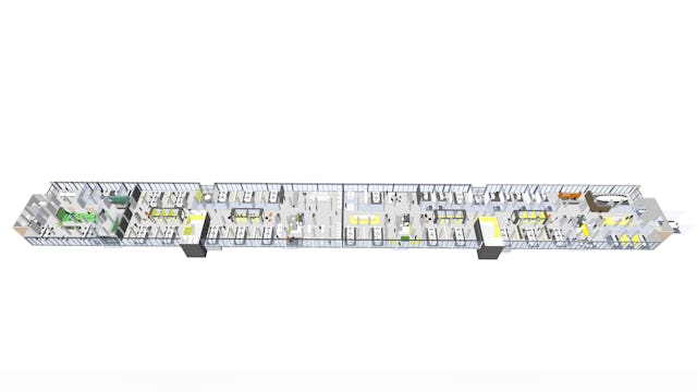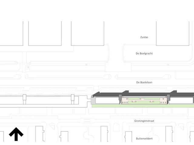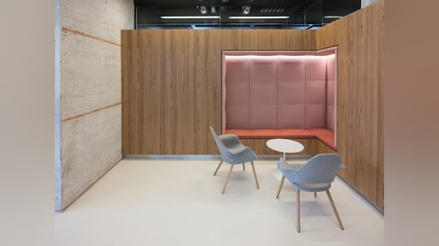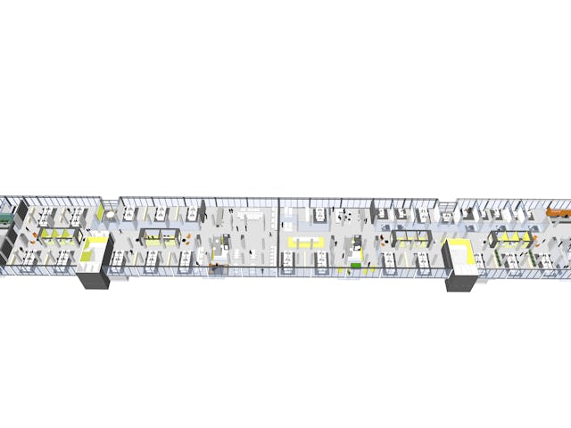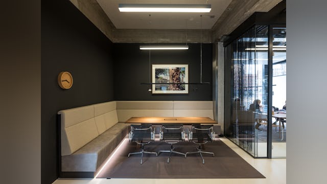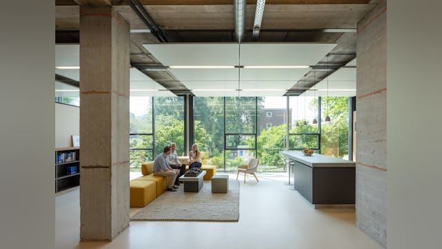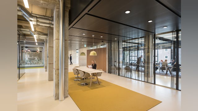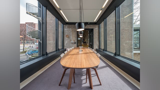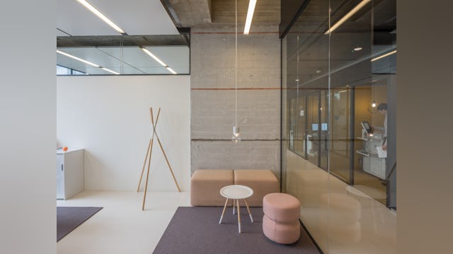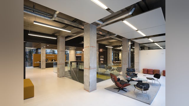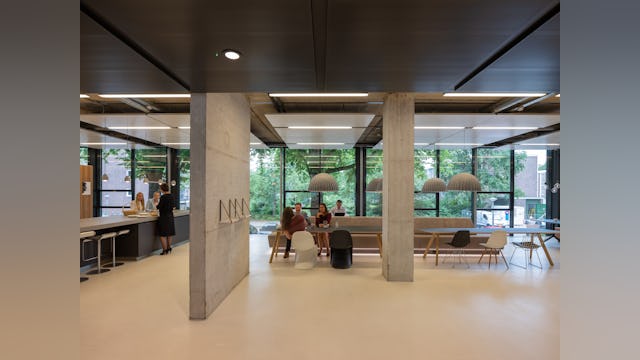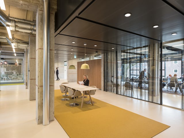 Bij aanvang werd het bestaande interieur gesloopt zodat het authentieke casco en daarmee ook de potentie van de ruimte zichtbaar werd: een monumentale betonconstructie uit de jaren ‘60, hoge ruimten en een lange doorgaande zichtlijn over de volle 160 meter van het gebouw. Hans van Heeswijk architecten maakte op basis hiervan een karaktervol interieurontwerp, waarin 125 medewerkers intensief samenwerken en dagelijks genieten van het open en loftachtige karakter van hun nieuwe werkomgeving. Naast werkplekken en vergaderfaciliteiten is er ook volop ruimte voor ontspanning en ontmoeting in de personeelslounge en het restaurant. De nieuwe volglazen gevel biedt een mooie inkijk in het bedrijvige kantoorleven en zorgt voor levendigheid en dynamiek in het gebied.