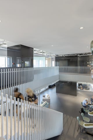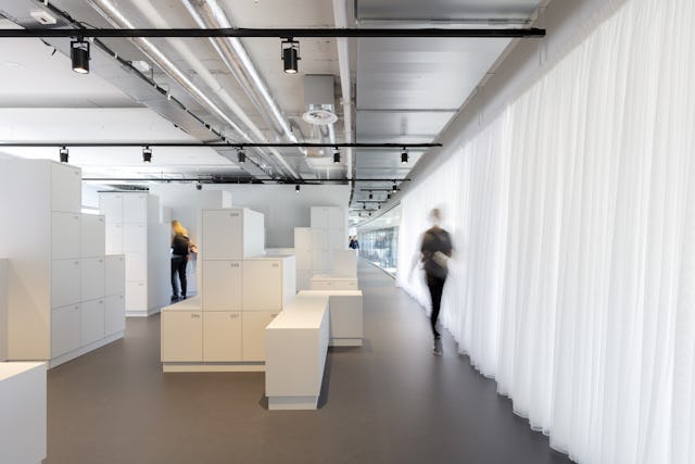 Op de derde verdieping liggen het netwerkcafé en het service-center, waar medewerkers terecht kunnen met vragen over bijvoorbeeld IT of faciliteiten. Ook de ruimte met lockers is prominent vormgegeven als een informele overlegplek.