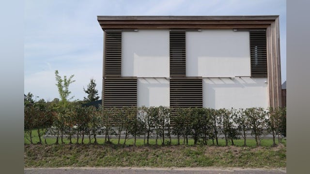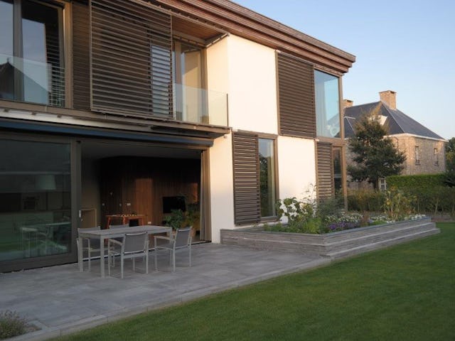 De betonstenen plint en de vergrijzende houten lijst vormen een opengewerkt kader dat het huis verbindt met de tuin en de terrassen. Hierbinnen springt de sterke dynamiek van de architectonische klimaatregeling in het oog: de aluminium lamellenschuifluiken laten opengeschoven de zonnewarmte binnen in de winter en het tussenseizoen. Dichtgeschoven zorgen ze voor koelte in de zomer, met steeds genoeg daglicht.