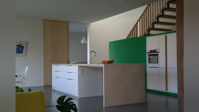 Het dak tenslotte is wit tegen de opwarming en voorzien van zonnepanelen. Alle benodigde energie (nul op de meter) wordt zo uit het zicht opgewekt.