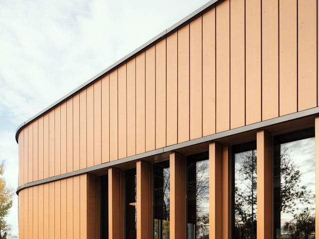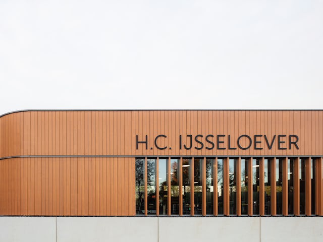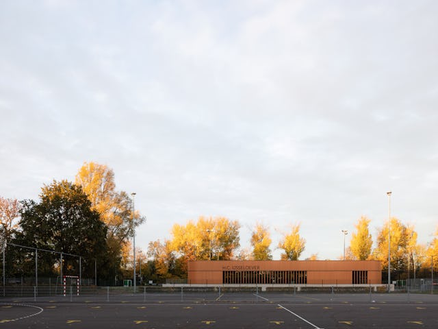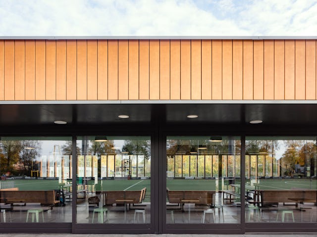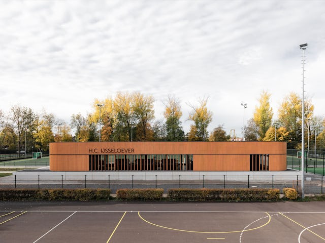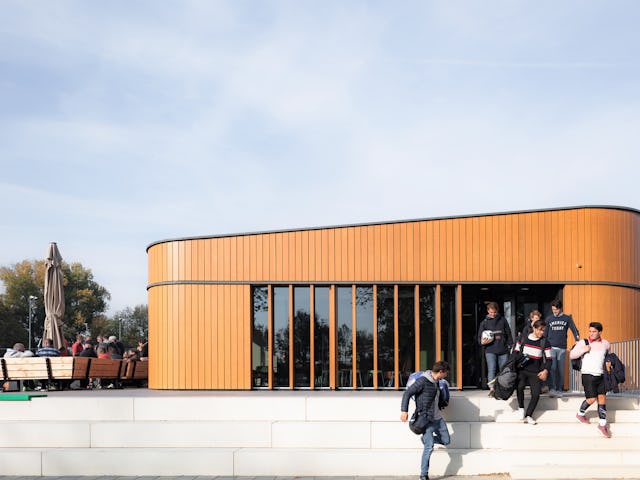 De veldzijde is zo transparant mogelijk gehouden met glazen puien die in de zomer open kunnen staan waardoor binnen en buiten in elkaar overvloeien. Om de ondergeschikte functie van de overige gevelopeningen te accentueren wordt het zicht daardoor gefilterd door lamellen. De gevel is opgetild naar de zijde van de aankomstroute en ontsluiting van het terrein om aan te sluiten bij de hoogte van de naastgelegen sporthal en de entree en het gebouw statuur te geven. De veldzijde is juist laag gehouden om de menselijke maat te houden: dit is ook de terras- en verblijfsruimte.