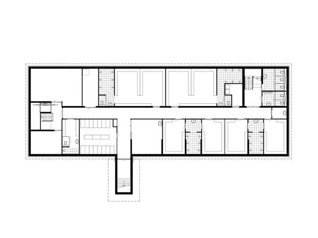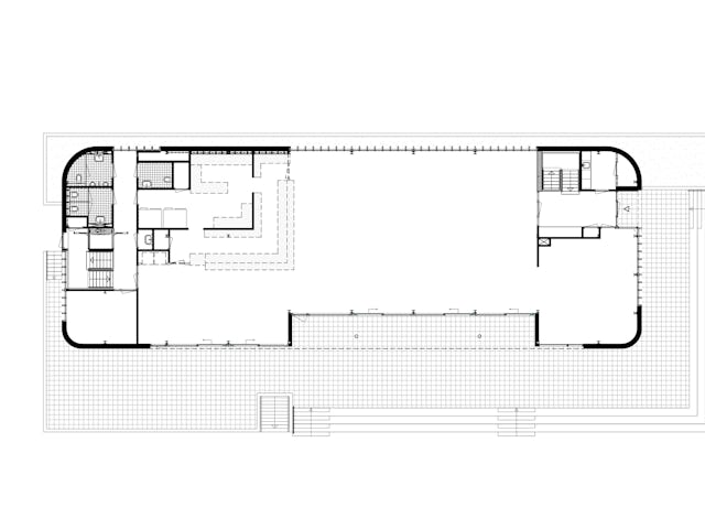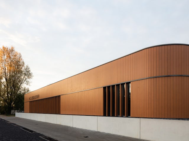 Toelichting EVA architecten - Gekozen is om de kleedkamers deels verdiept te leggen en daarop het clubhuis te realiseren. Doordat het clubhuis hoger staat is er mooi zicht op de velden, en het verhoogde maaiveld dient meteen als terras en tribune. Het souterrain is vormgegeven in beton, het lichte clubhuis met zijn houten gevelbekleding contrasteert daar mee en staat als een paviljoen op het basement.