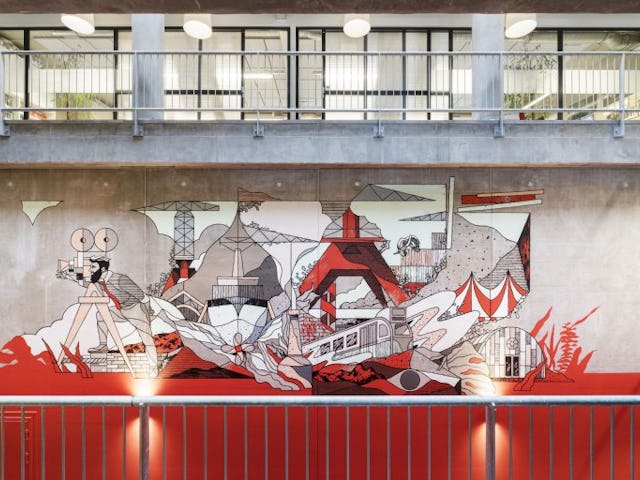 Het jongste bouwdeel bestaat uit een groot atrium met naastgelegen kantoorunits. Het ruwe betonnen interieur is behouden en enkel de aanwezige rode accenten zijn uitvergroot en versterkt. Gelijk aan alle andere ruimtes ontstaat hierdoor één groot gebaar: het volledig rode onderste gedeelte van het atrium. Om het ruwe karakter te versterken is er een groot artwork in het atrium geplaatst, ontworpen door ZenkOne en Artbox. Het artwork vertelt de verschillende thema’s en rijke historie van zowel het gebouw als Amsterdam Noord zelf.