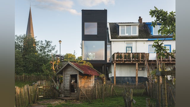 De lintbebouwing langs de dijk waar deze woning onderdeel van is, bevat vele doorkijkjes tussen de woningen. Hierop geïnspireerd realiseerden we een transparante koppeling tussen oud- en nieuwbouw. Door de koppeling uit glas te maken, werd tevens vrijheid en afstand gewonnen tussen oud- en nieuwbouw voor een eigen vorm en materialisatie.