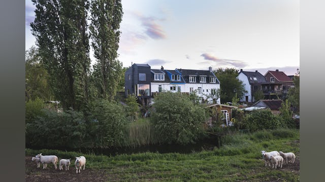 Toelichting door Walden Studio - De wens van de opdrachtgevers was om de bestaande eet- en woonkamer uit te breiden en op de bovenverdieping een badkamer en een slaapkamer voor de ouders te realiseren. Er mocht maximaal vier meter in de breedte worden gebouwd, vanwege het naastgelegen natuurgebied. Daarnaast moest er ruimte gegeven worden aan de rivier die tot aan de winterdijk kan staan bij een overstroming van de zomerdijk.
