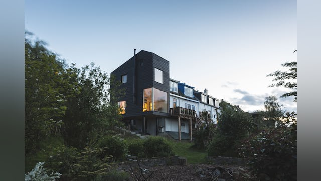 De zwarte gevel is net als de vorm van het dak geïnspireerd op de traditionele zwart geteerde schuren uit de regio. De uitbouw staat op een ‘stalen tafel’ met zwarte buisprofielen als kolommen. Vanaf deze constructieve tafel is vrijwel alles in houtskeletbouw uitgevoerd. Er is met duurzame materialen gebouwd zoals vlasisolatie en onbehandelde accoya kozijnen. De onderkant van de woning is met onbehandelde douglas planken afgewerkt en de gevel met zwart vurenhout.