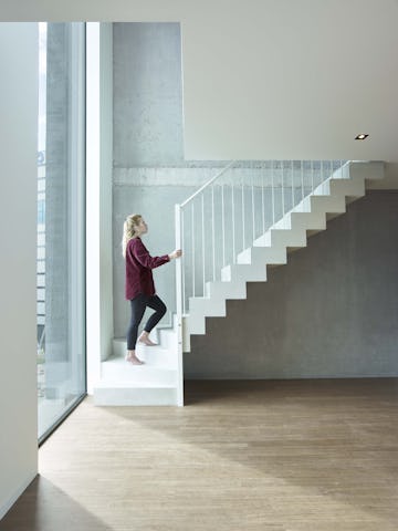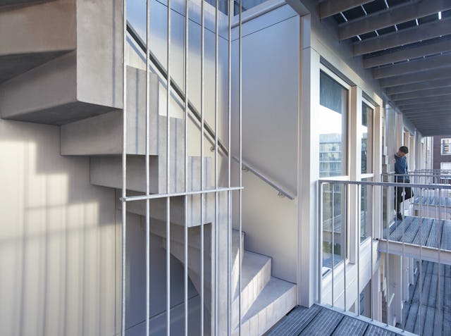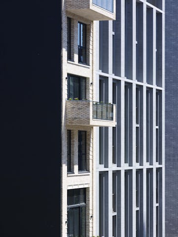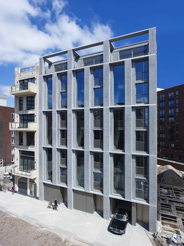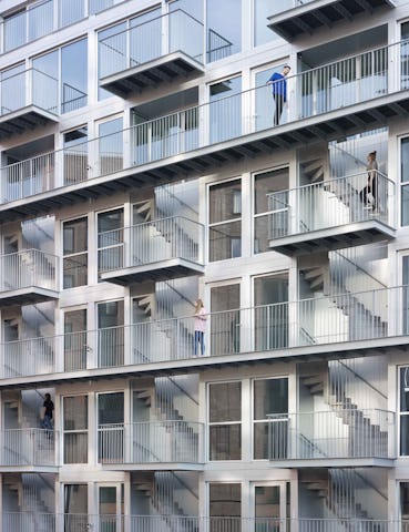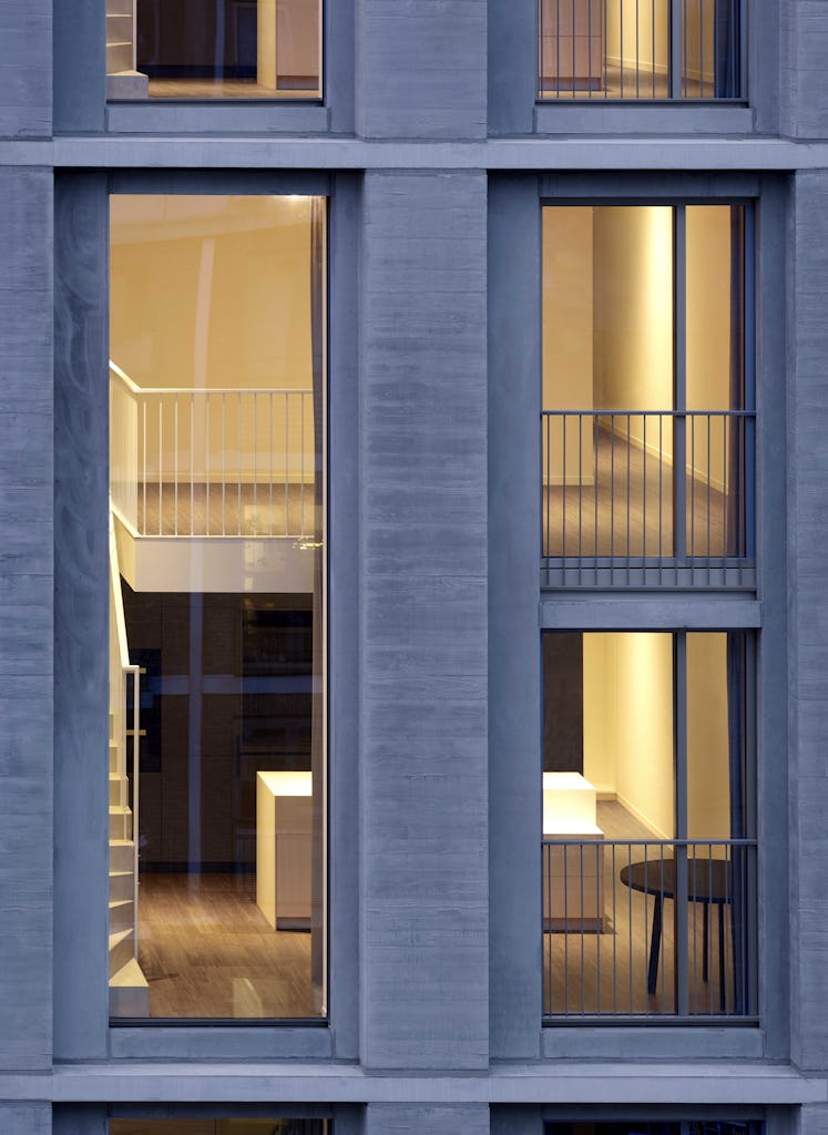 De woningen zijn aan de zonzijde ruimtelijk verbonden d.m.v. een vide. Een centrale kern zorgt voor een open leefomgeving, waarbinnen verschillende indelingsprincipes mogelijk zijn. De kern is zo klein mogelijk gehouden, doordat de trappenhuizen volledig buiten het gebouw zijn geschoven en onderdeel zijn van de balkons aan de tuinzijde. De structuur wordt opengebroken ter plekke van de plint en kroon, waar het gebouw zich opent naar de straat en het uitzicht. De ritmiek van de betonnen gevel benadrukt de loftwoningen, waarbij grote hoge vensters zijn gecreëerd, welke uitgaan van de maximale glasmaat van 5.40 en een gekaderd zicht op de nieuwe wijk geven.