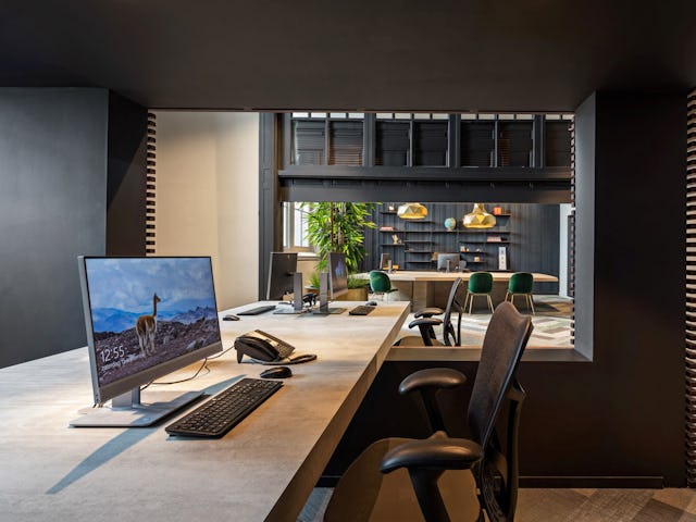 De oversized directietafel is een hommage aan de te vroeg overleden Nederlandse ontwerper Faas van Dijk, waar zowel wij als de opdrachtgever groot fan van zijn. De Zweedse String kasten daarachter herbergen vele tastbare herinneringen aan Aziatische reizen. Om de schaal van de ruimte en tafel aan te kunnen hebben we Marc de Groot gevraagd voor dit project met de hand drie stevige Helix lampen in messing te vouwen. De vloeren zijn bekleed met gemêleerde Bolon stroken in visgraat motief en een gerestaureerde historische schuifwand scheidt indien nodig de werkplekken van de directie ruimte. Als een Aziatisch paviljoen hebben we een tweelaags volume in de tweede ruimte geplaatst zodat er boven een afgesloten overlegruimte ontstaat en beneden aan een grote zwevende plak door meerdere medewerkers kantoorwerkzaamheden verricht kunnen worden.