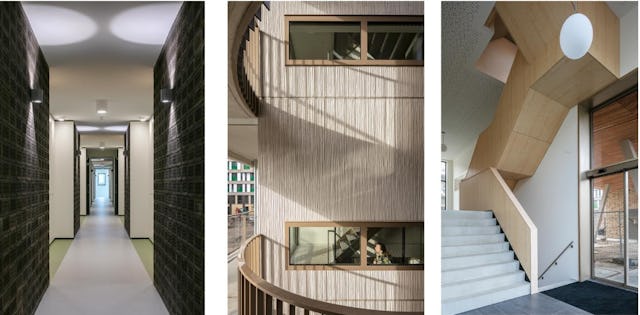In de woningen is slapen en wonen slim gecombineerd. Dankzij 1,5 extra hoogte kon boven de badkamers een slaapkamer/ruimte worden gecreëerd, afgescheiden van het woongedeelte. Ook in het interieur van de algemene ruimten zijn extra middelen ingezet om het tot een duurzaam en prettig complex te maken. De relatief lange corridors hebben we ritme gegeven door te verbreden bij de woningtoegangsdeuren.