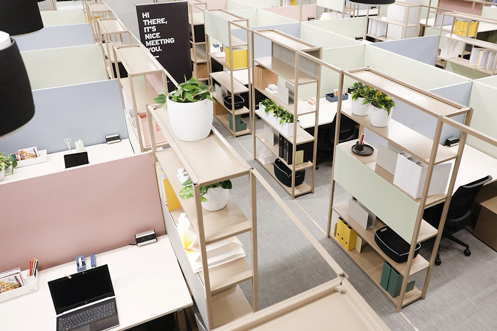 Een semi-geïsoleerde werkplek, modulair opgebouwd: in hoogte verstelbare tafel, ergonomische bureaustoel, ranke open boekenkast van gemoffeld staal, rondom afgesloten met gestoffeerde panelen, akoestisch dempend, afsluitbaar met een slot dat via een app te bedienen is, accessoires, boeken, planten en verplaatsbare magnetische panelen.